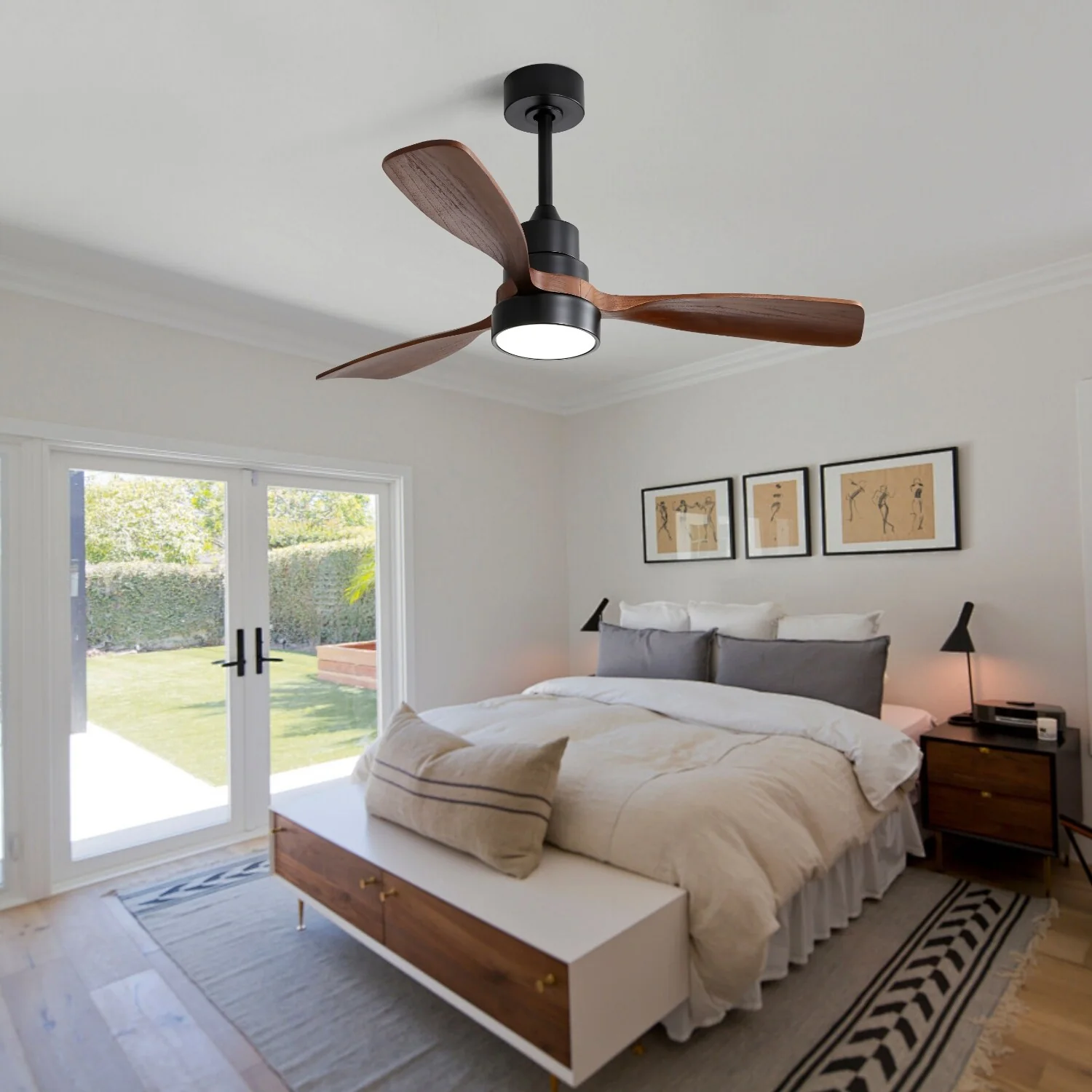 48 Inch Wood Ceiling Fan with Light, 3 Solid Wood Fan Blades, 6-speed Reversible DC Motor Ceiling Fan Chandelier, Black+Walnut