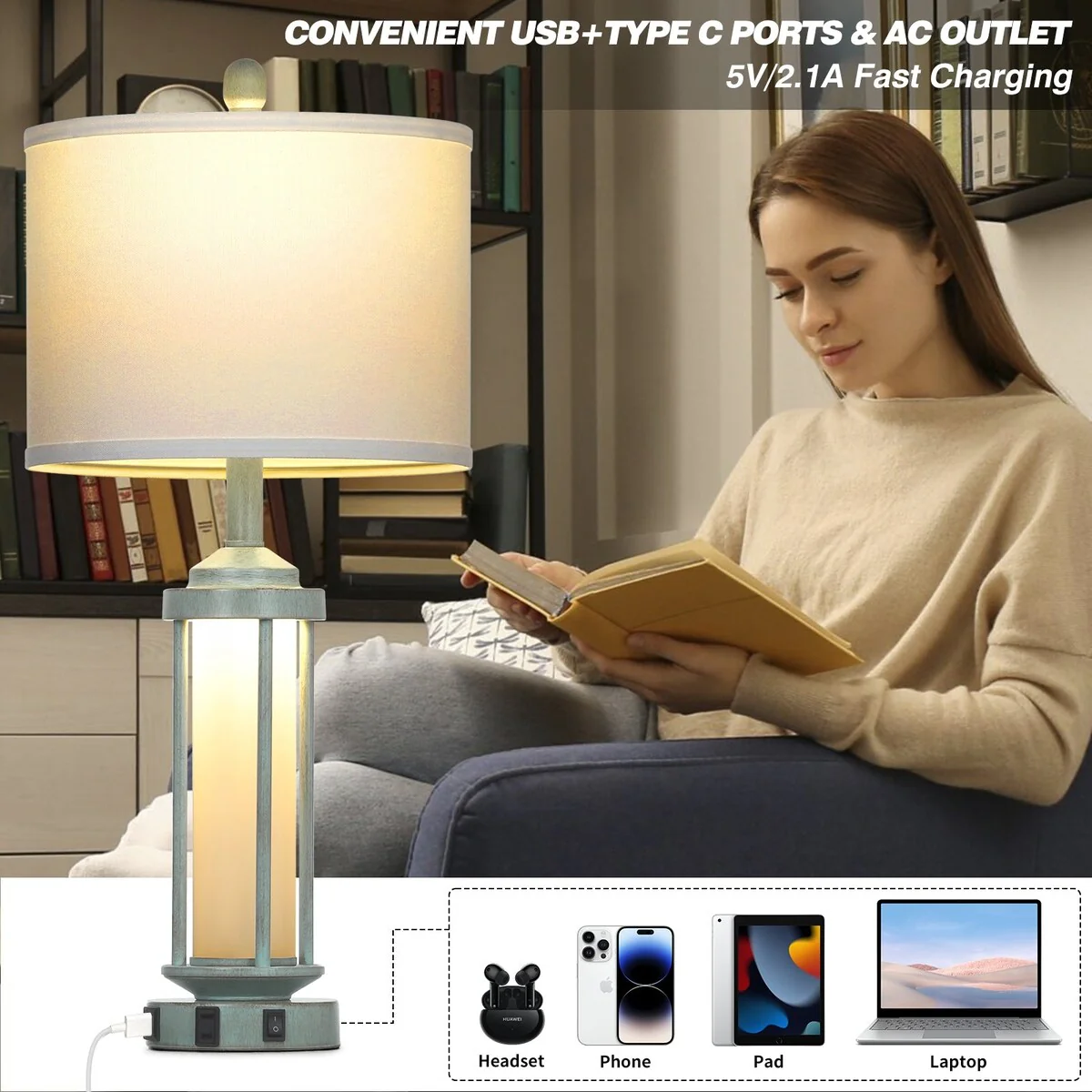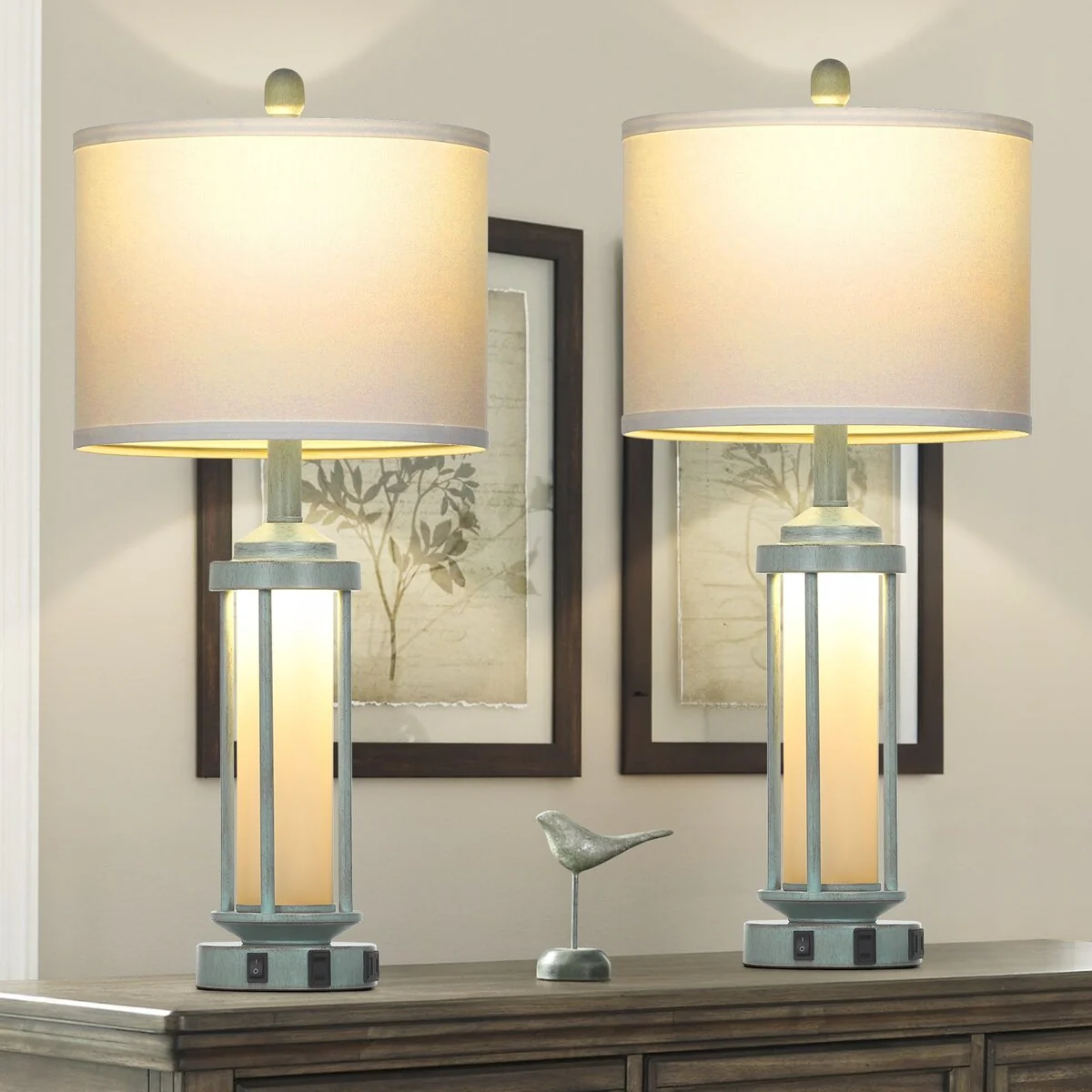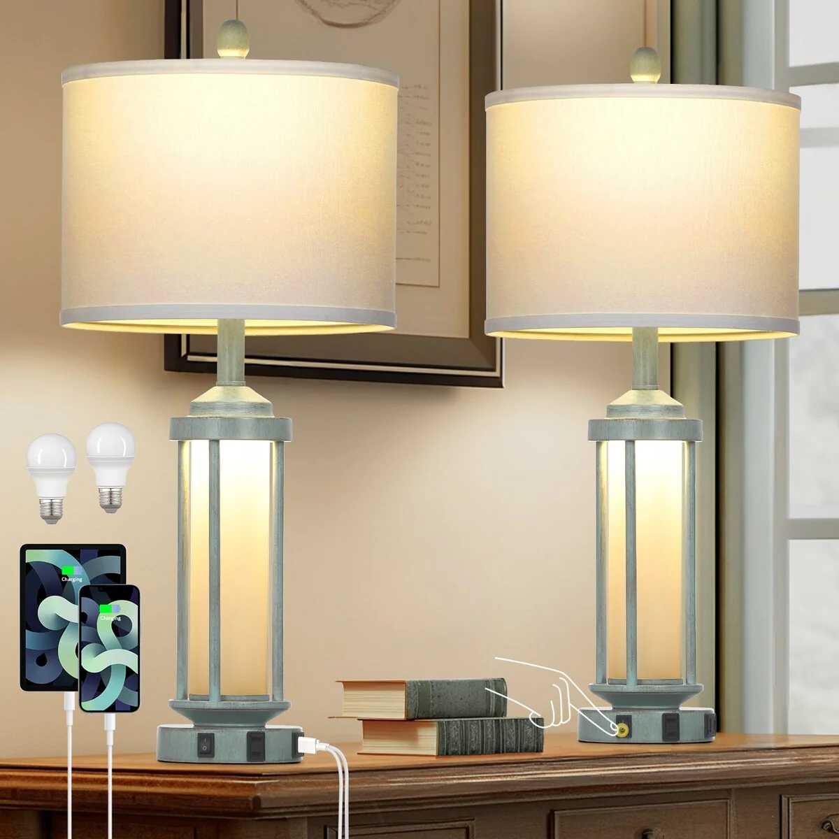 Blue Metal Nightlight Table Lamp 2in1 with Roman Pillar and USB Type-C Charging Ports AC Outlet (Set of 2)