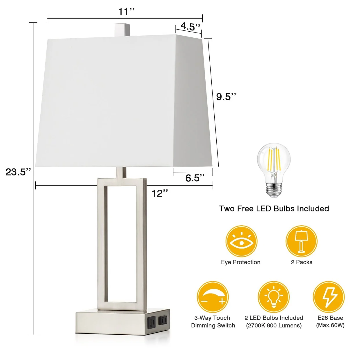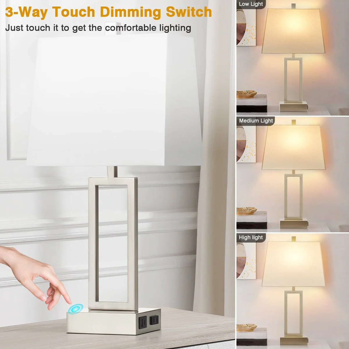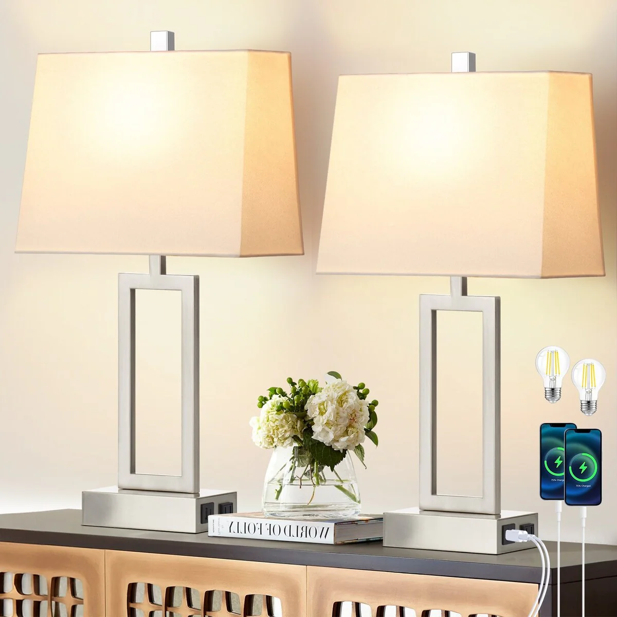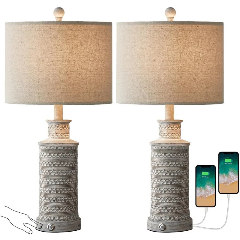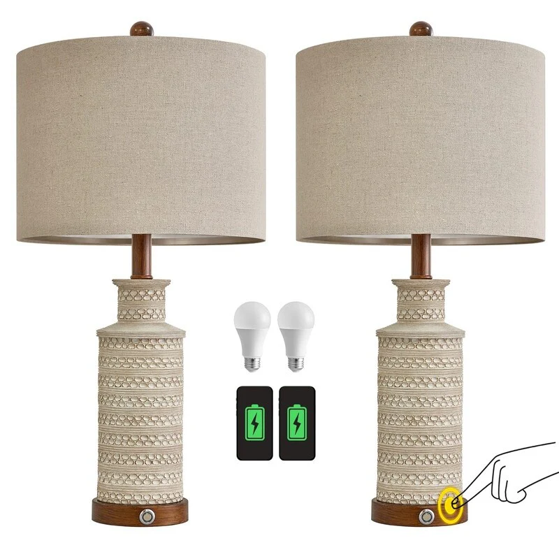 White Table Lamps 3-way Touch Dimming Switch Charging Ports (Set of 2) - 12'' x 6.5'' x 23.5'' (L x W x H)