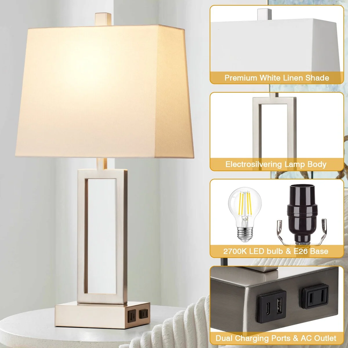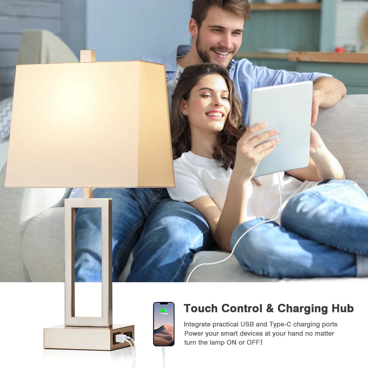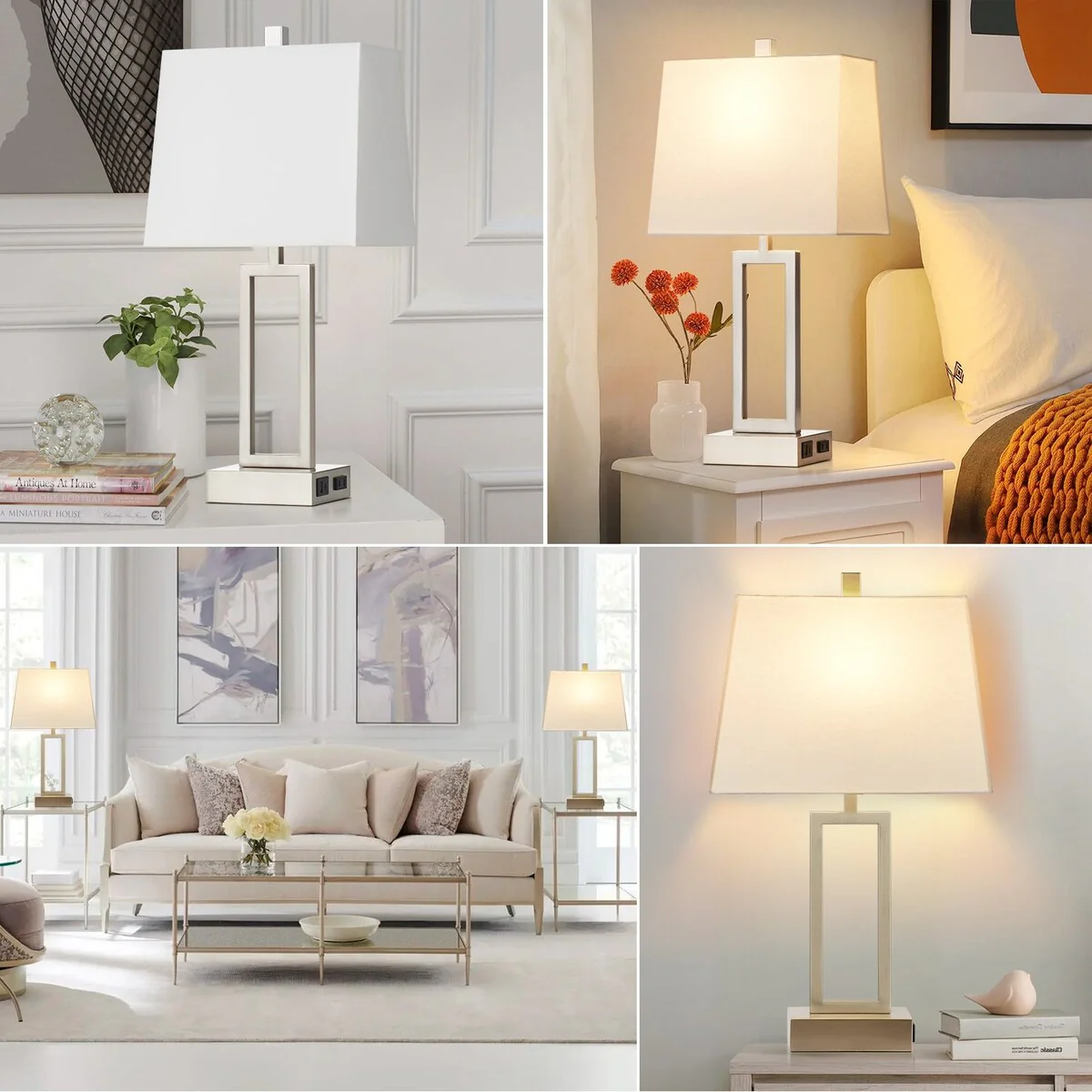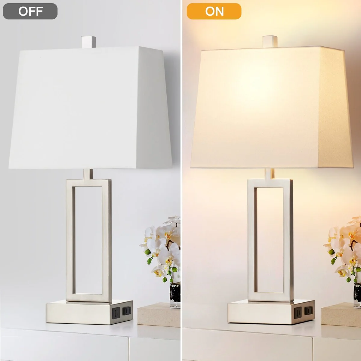 White Table Lamps 3-way Touch Dimming Switch Charging Ports (Set of 2) - 12'' x 6.5'' x 23.5'' (L x W x H)
