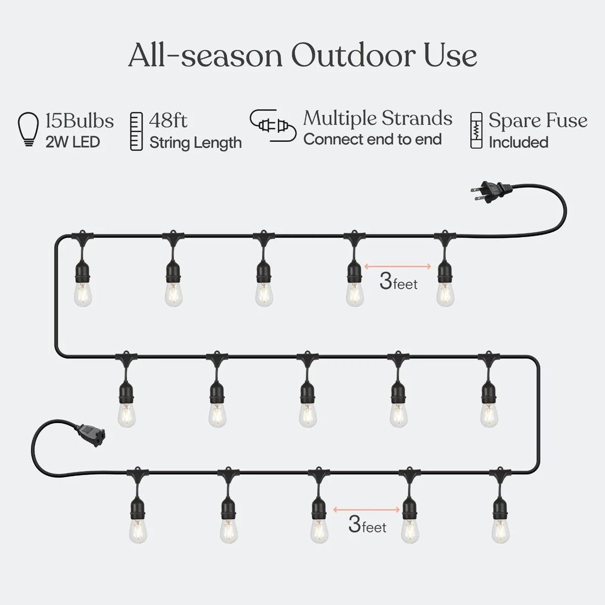 Brightech Ambience Pro 15-Light 48 ft. Outdoor Plug-in 2W 2500k LED S14 Hanging Edison Bulb String-Light