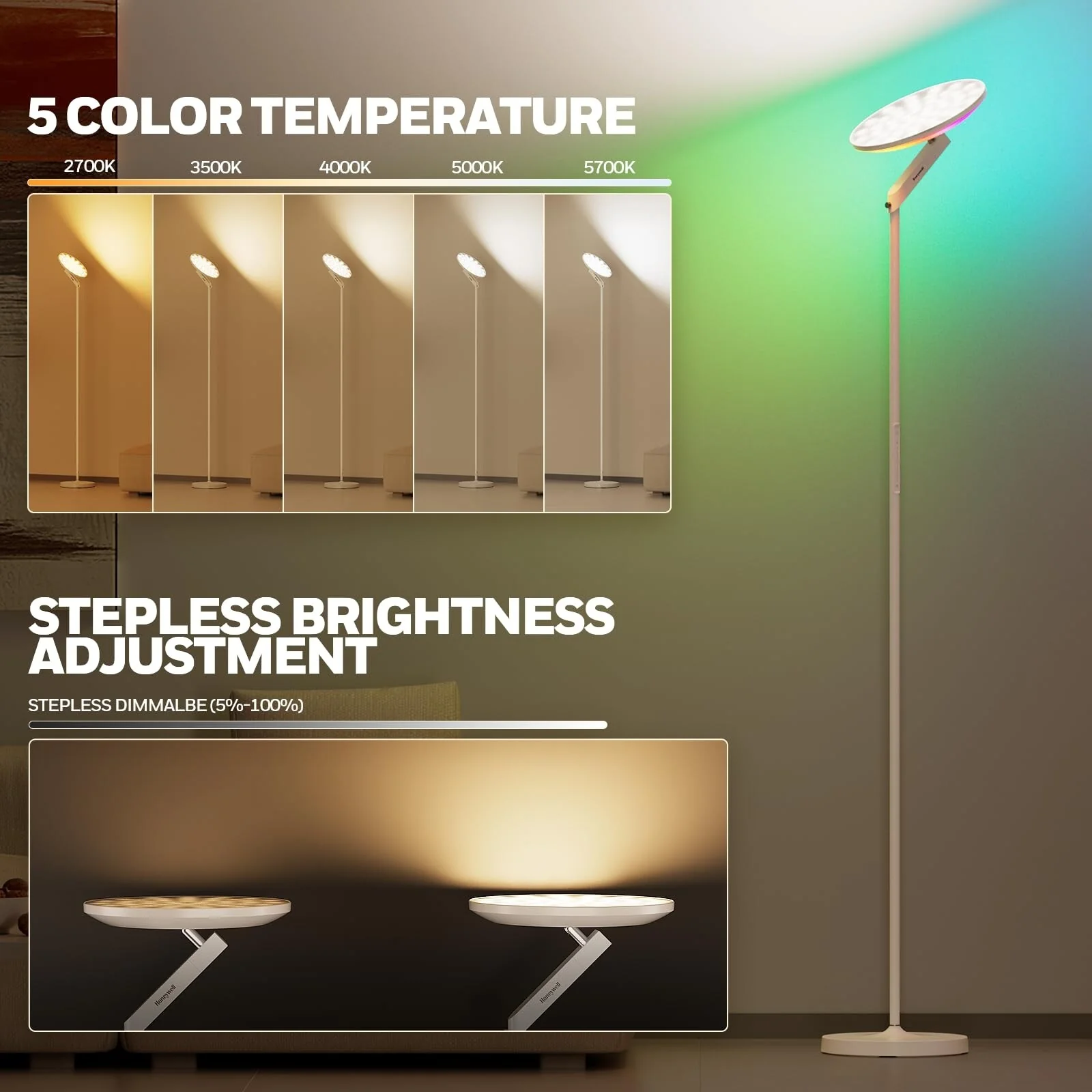 Honeywell Floor Lamp �C Remote, 5 Colors, Adjustable Brightness