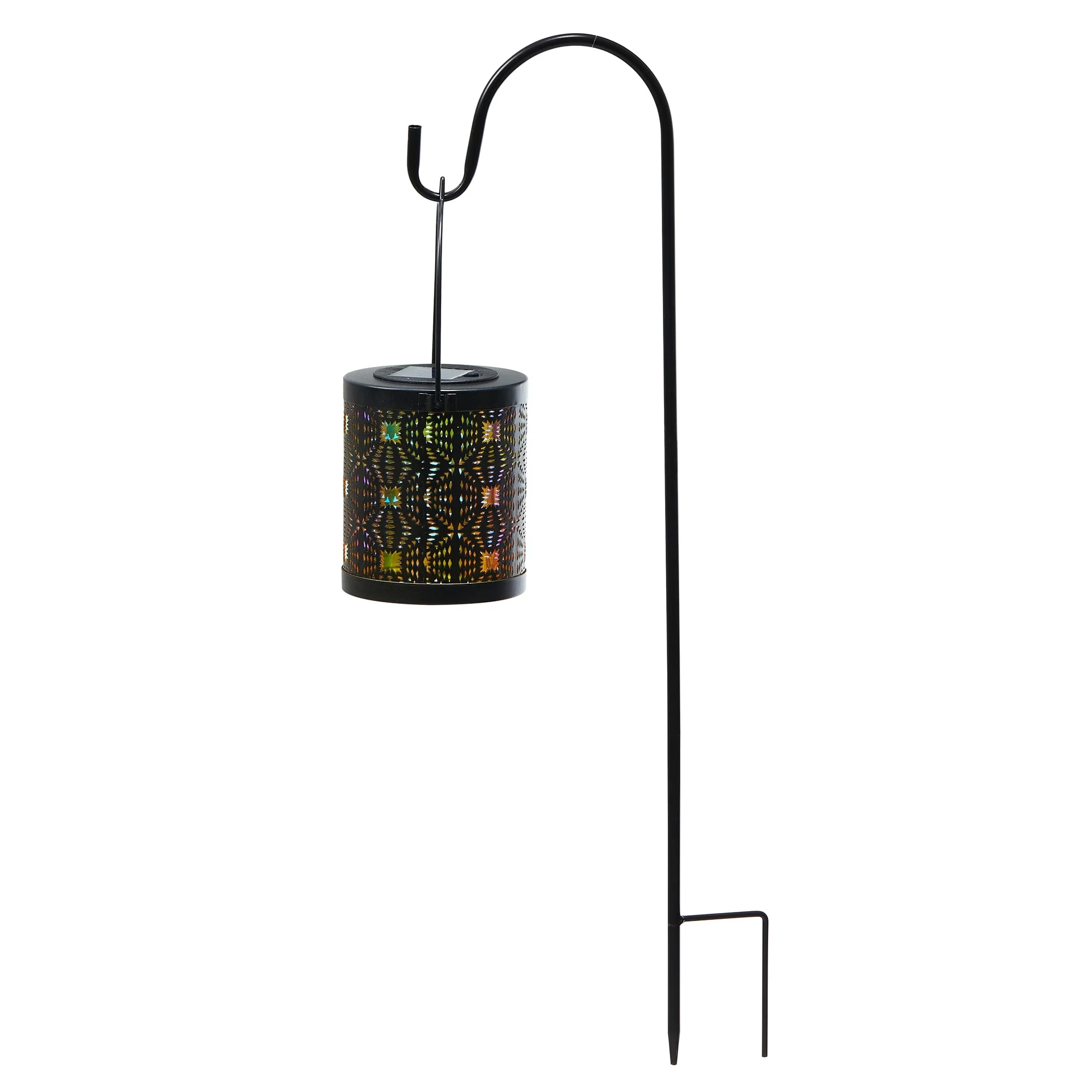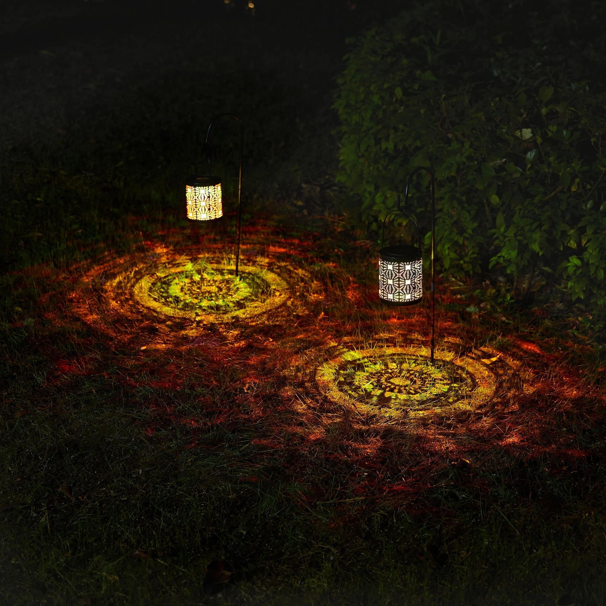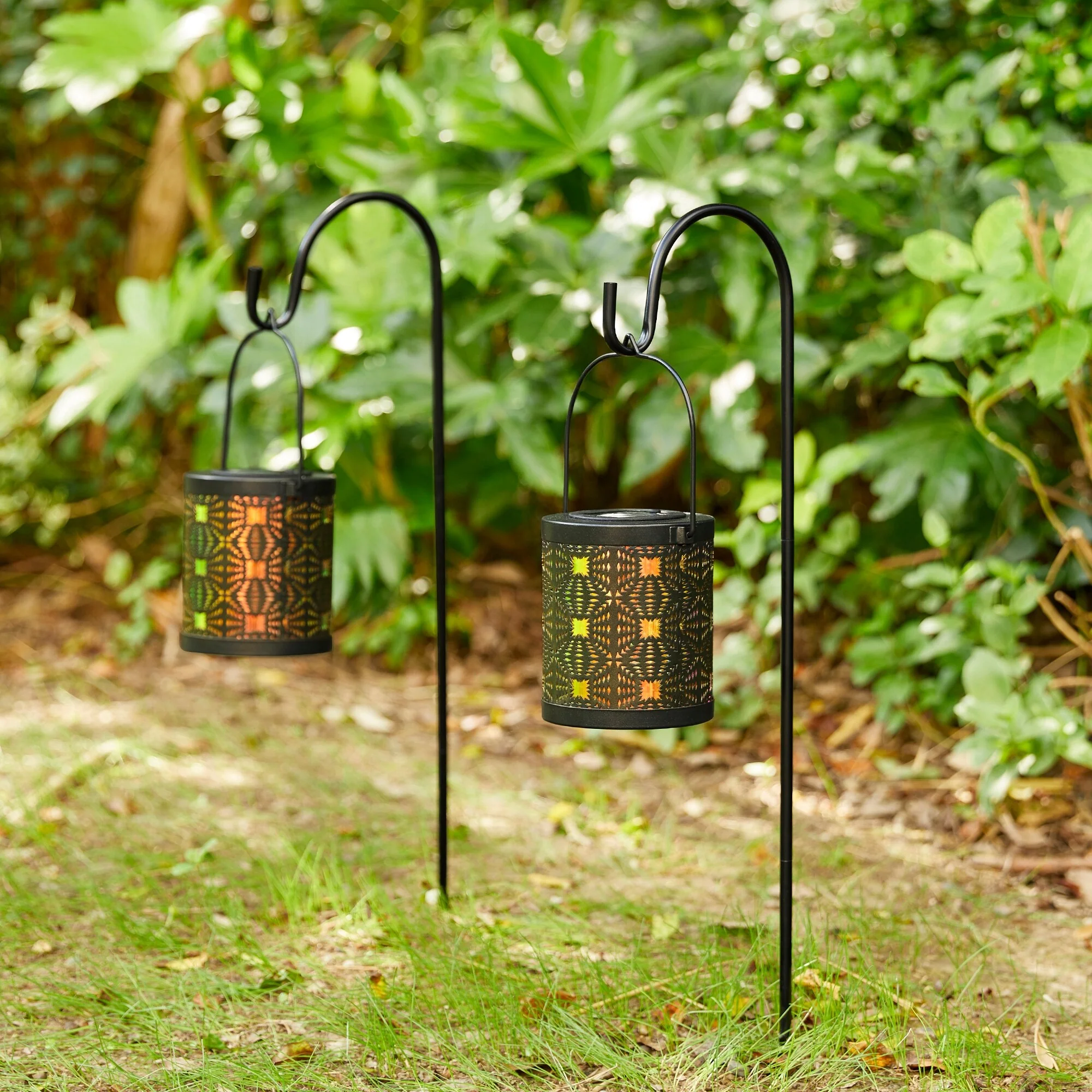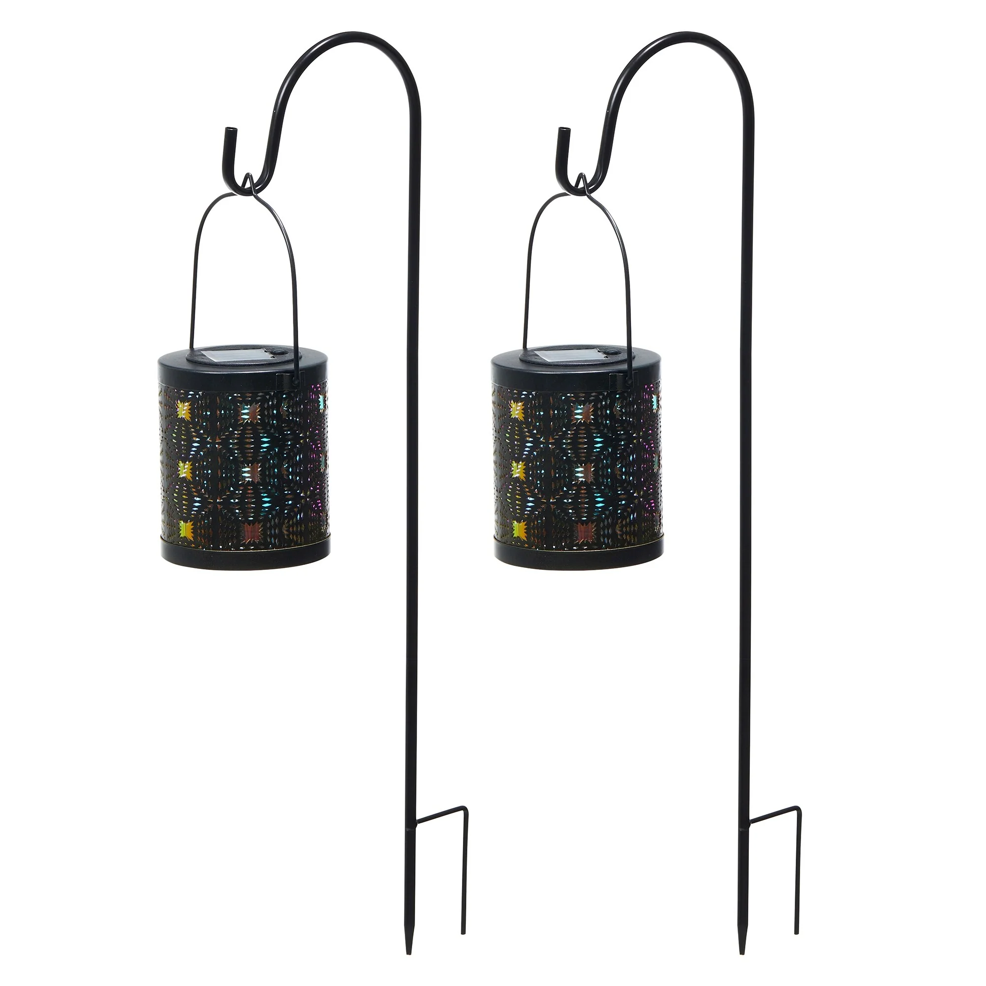 Glitzhome Set of 2 Metal Cutout Laser Outdoor Solar Lantern with Hanging LED Light Garden Stakes