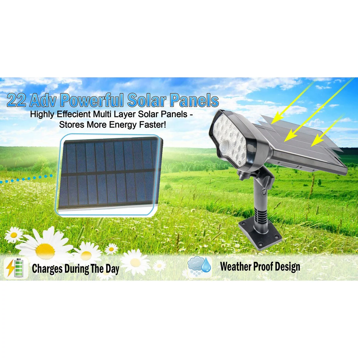 Solar Powered Motion Security Sensing Floodlight - Always On - IP66 - 360��Rotatable 1400LM Warm Bright White 17 LED Floodlight