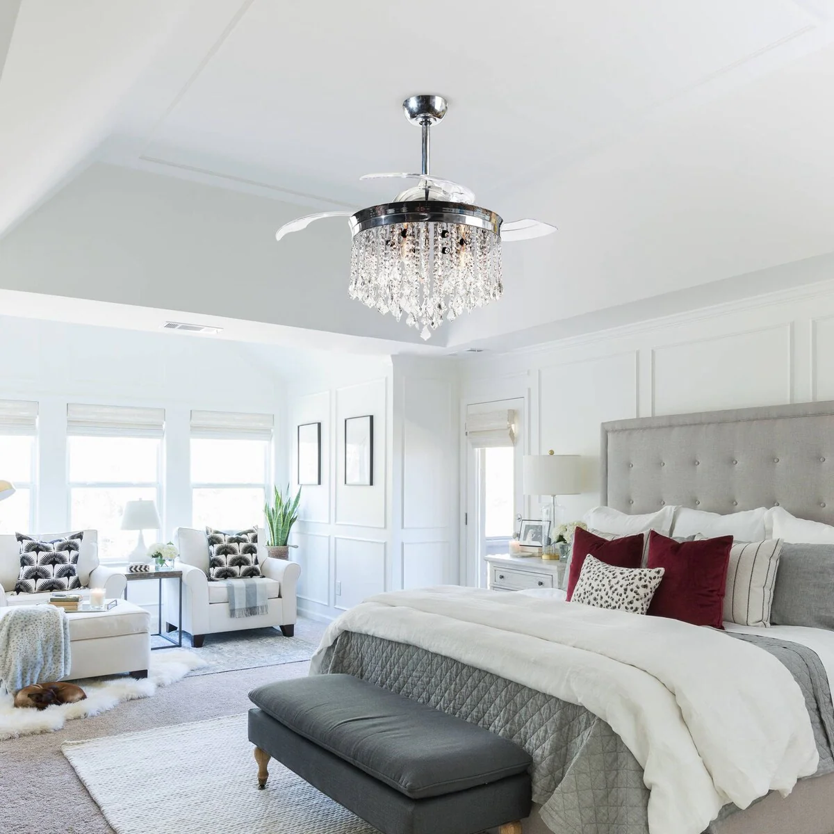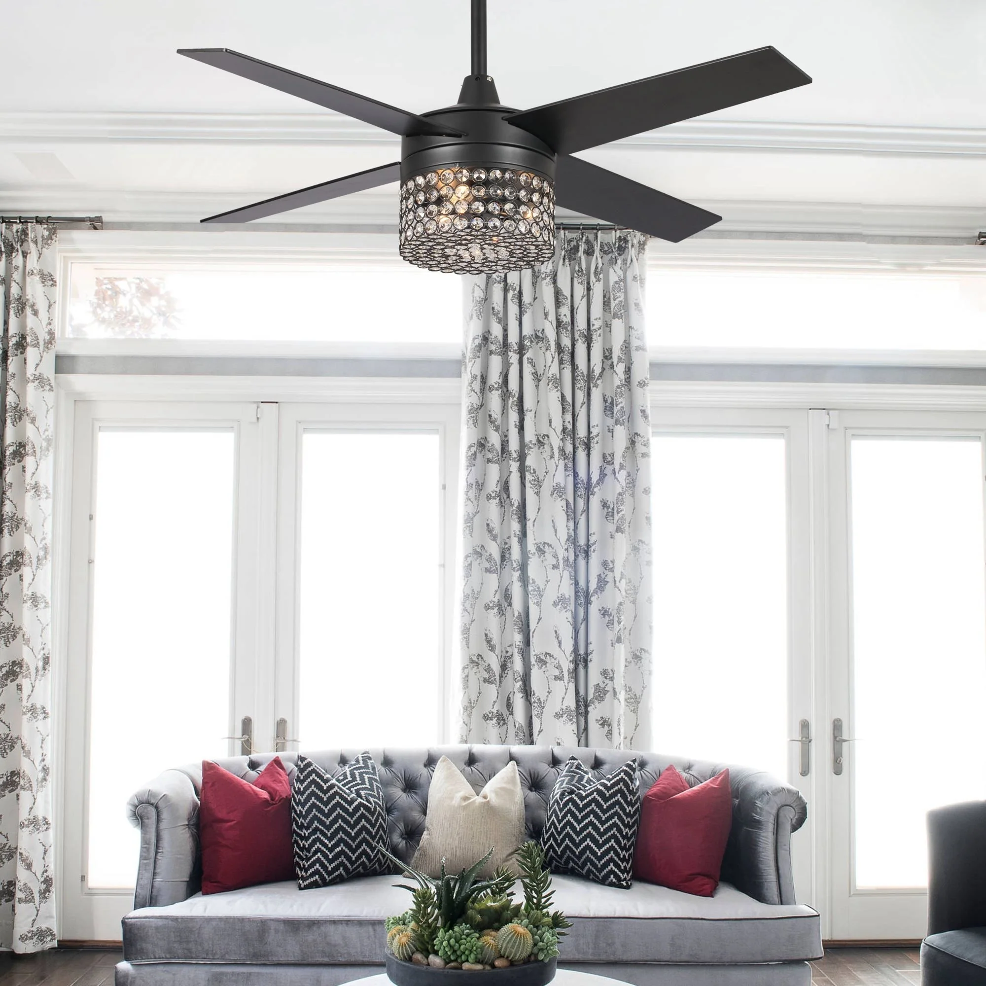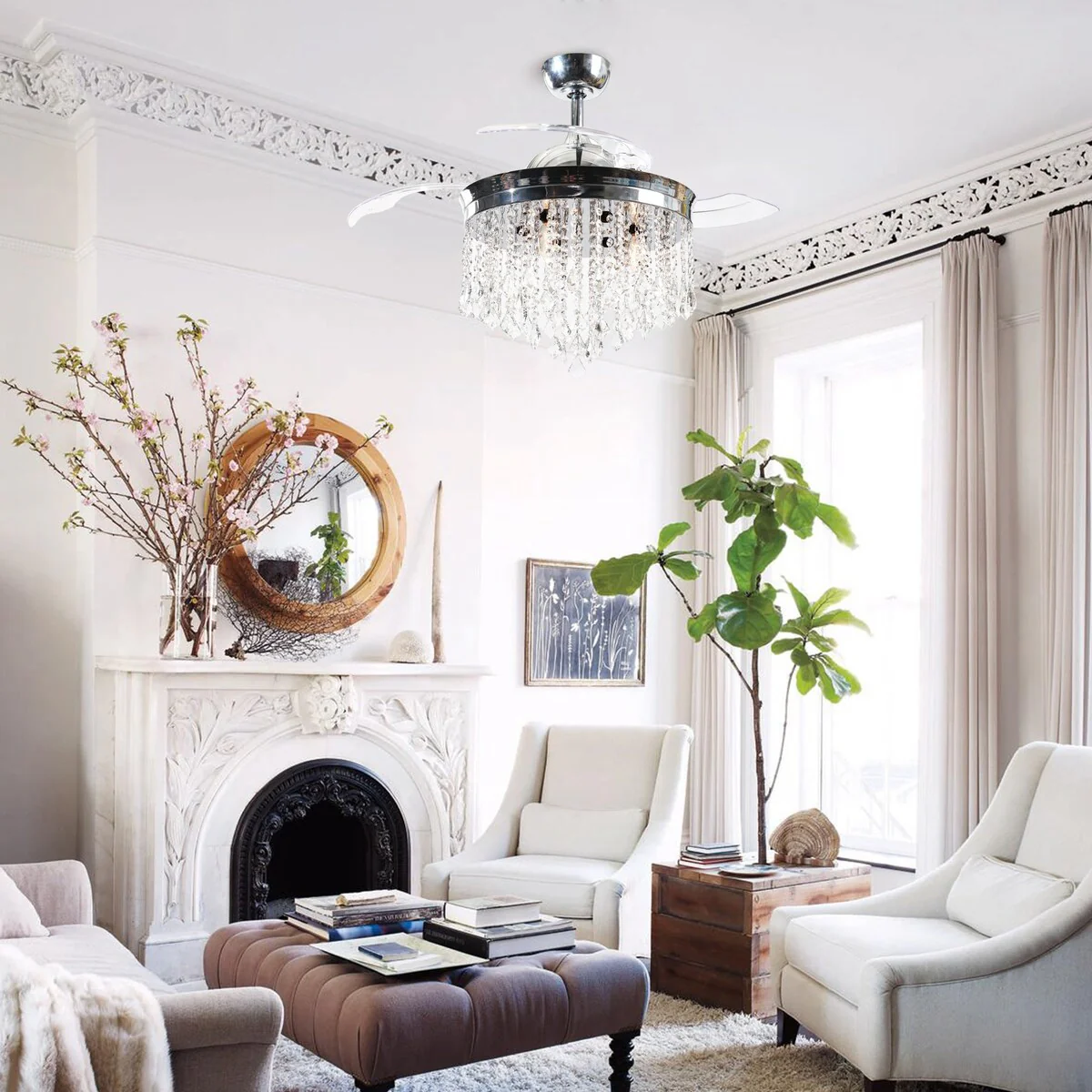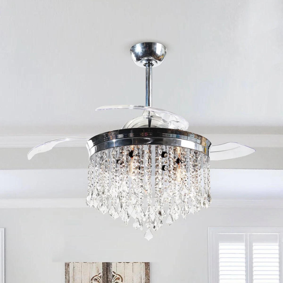 42-inch Chrome Retractable 3-Blade Crystal Chandelier Ceiling Fan with Remote and Light Kit