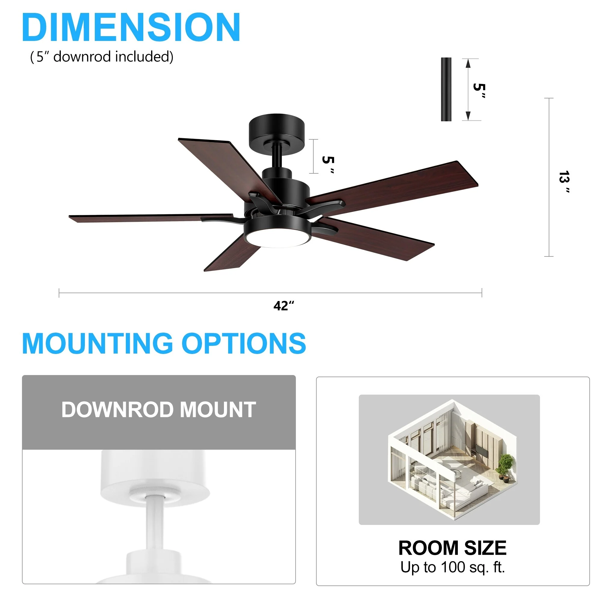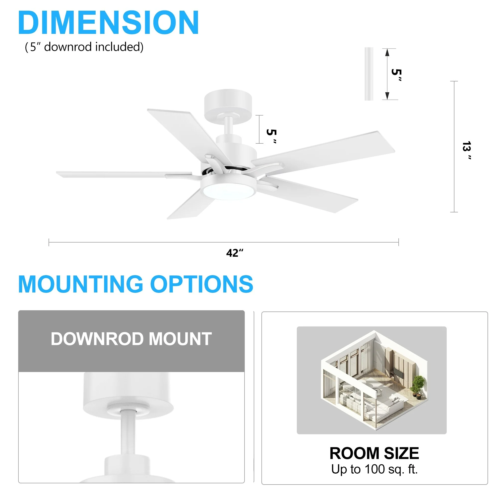 42 Inch 5-Blade Black/White Modern LED Ceiling Fan with Light and Remote