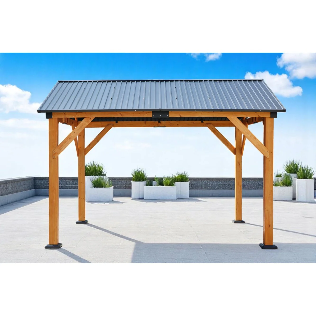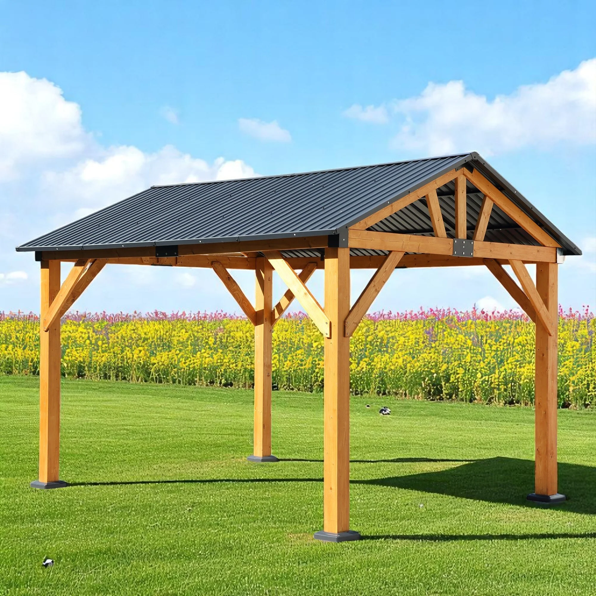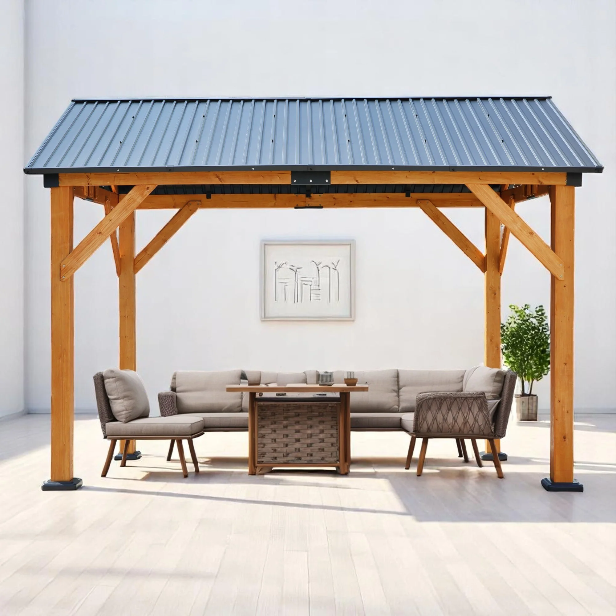 Outdoor Fir Wood Carport Pavilion Gazebo with Steel Roof, Durable Wood Frame, and UV Protection for Patio, Garden, and Backyard