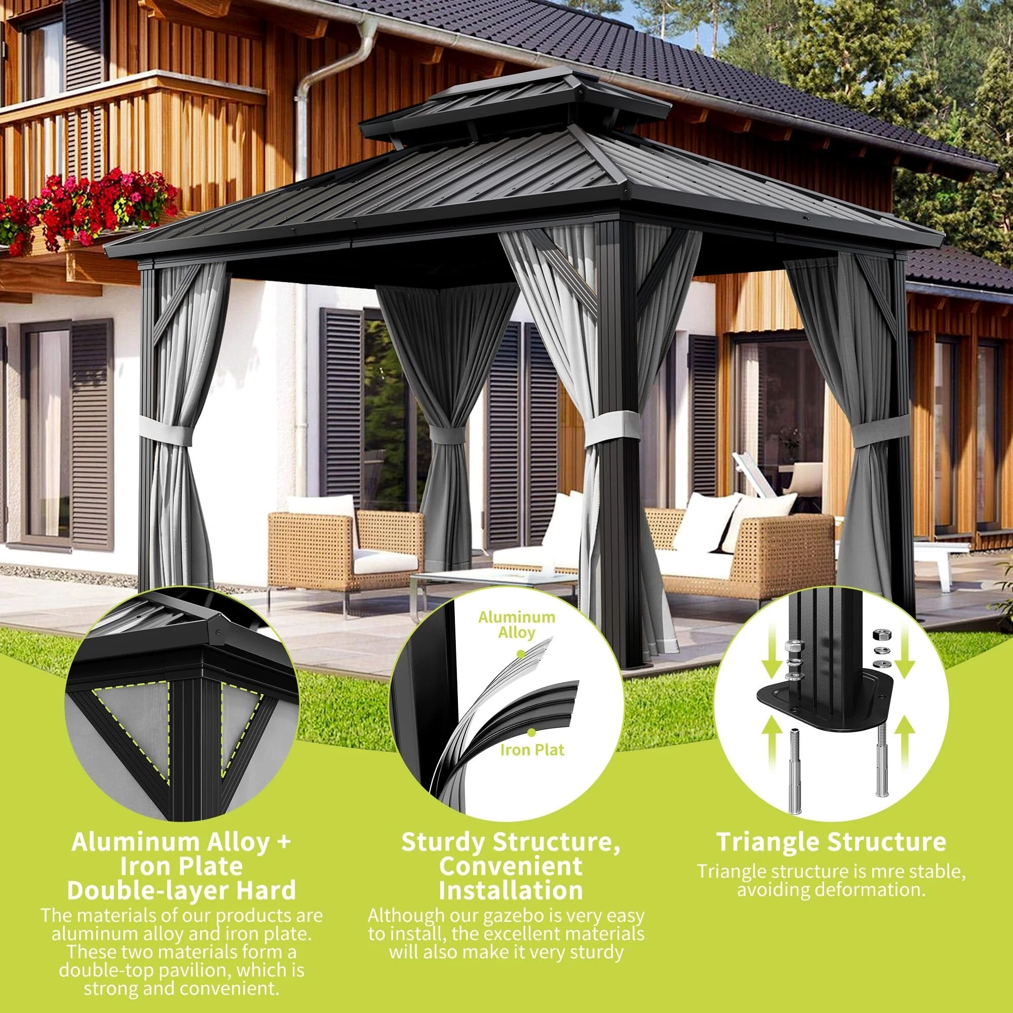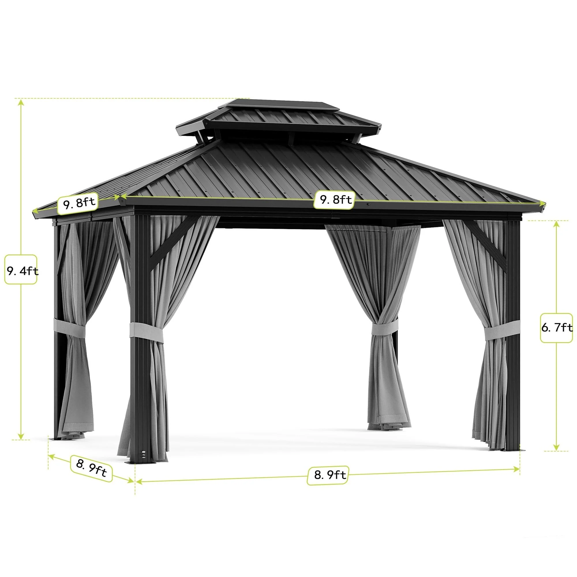 Aluminum Hardtop Gazebo 10x10FT, Outdoor Double Roof Canopy with Curtains and Netting for Garden, Metal Tent