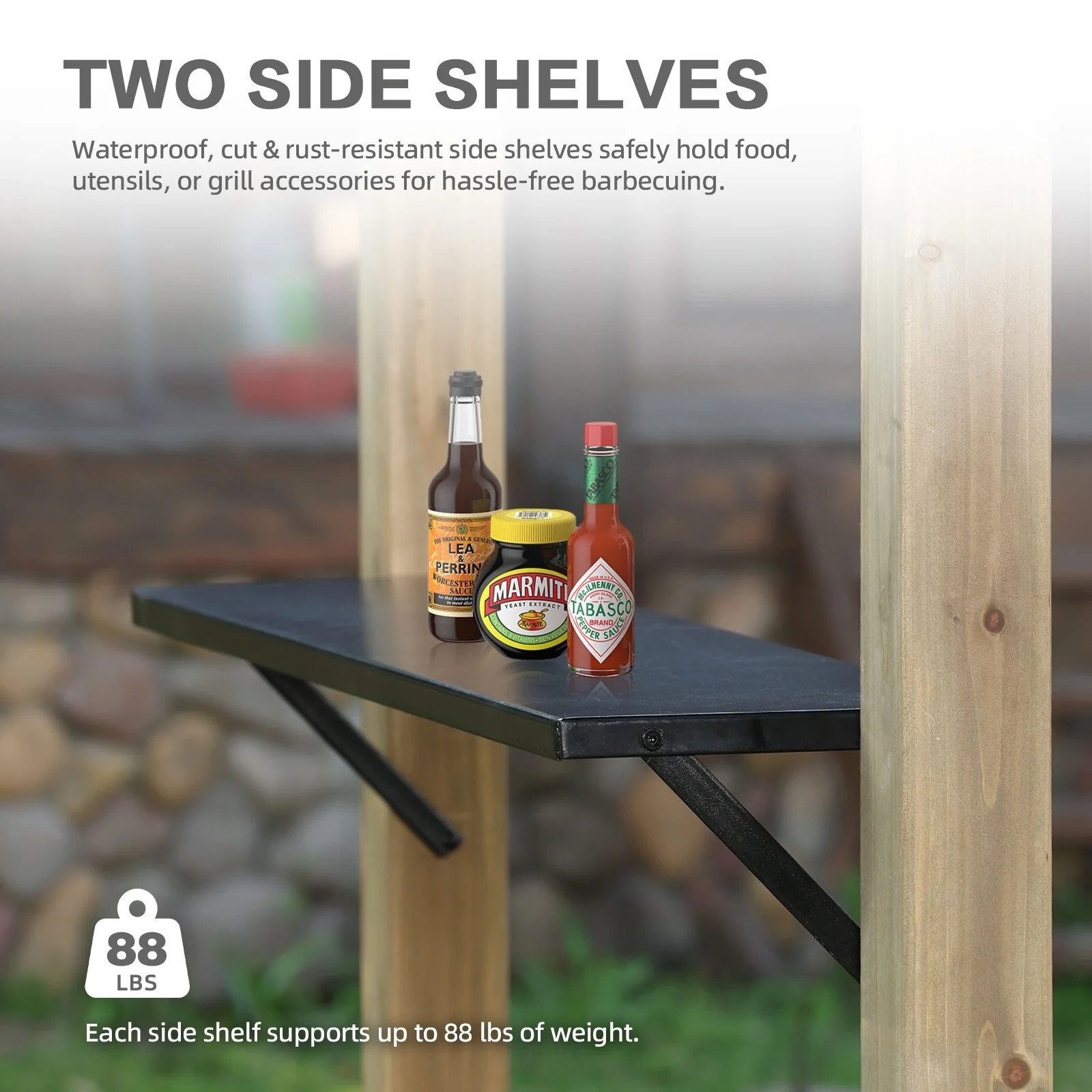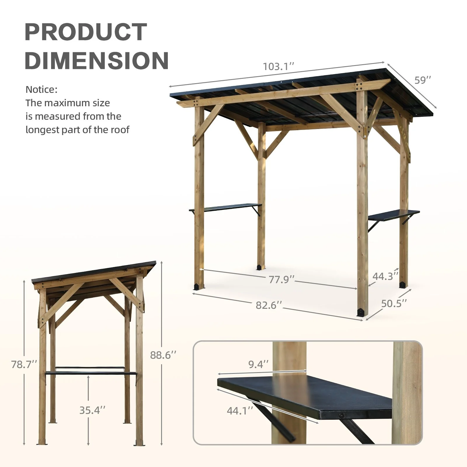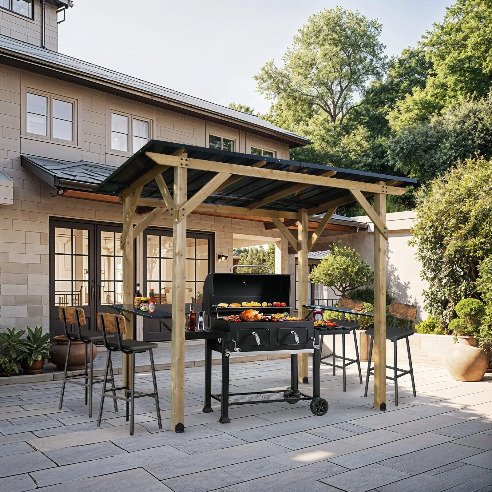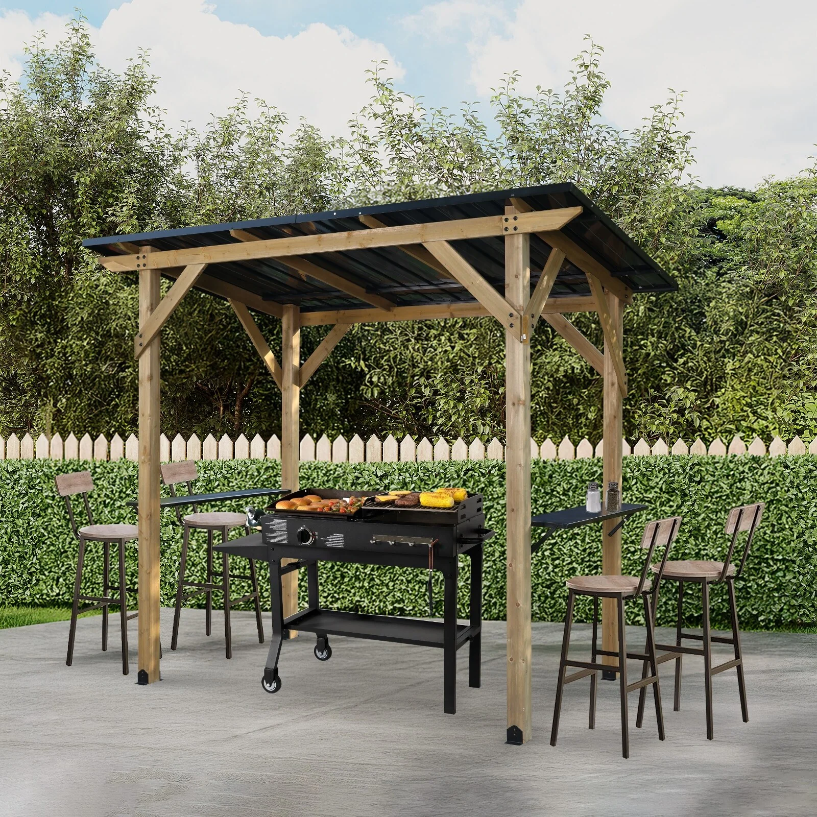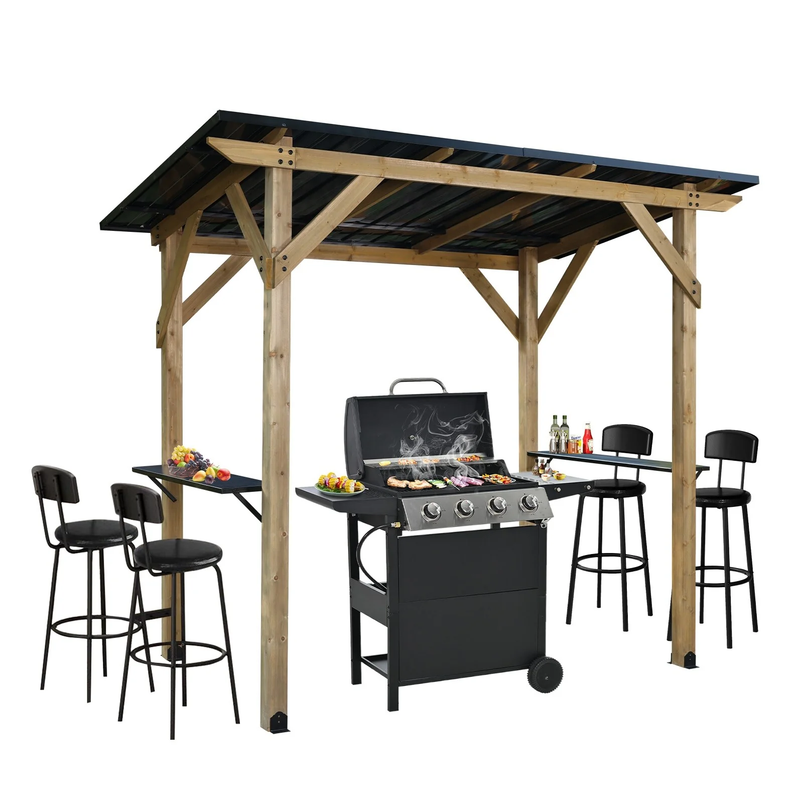 Aoodor 8' x 5' Wooden Grill Gazebo, Outdoor Hardtop Gazebo with Sloping Metal Roof and 2 Side Shelves