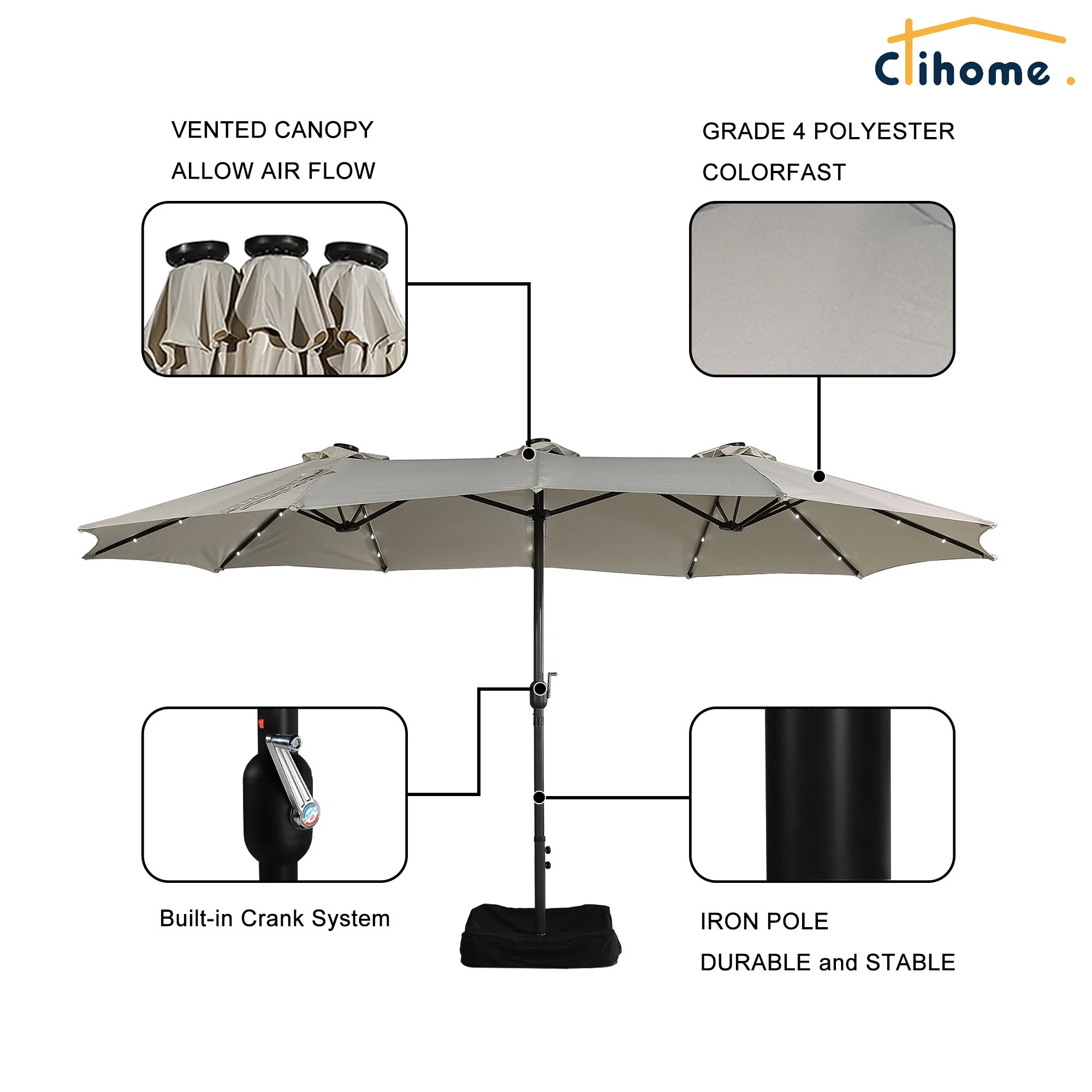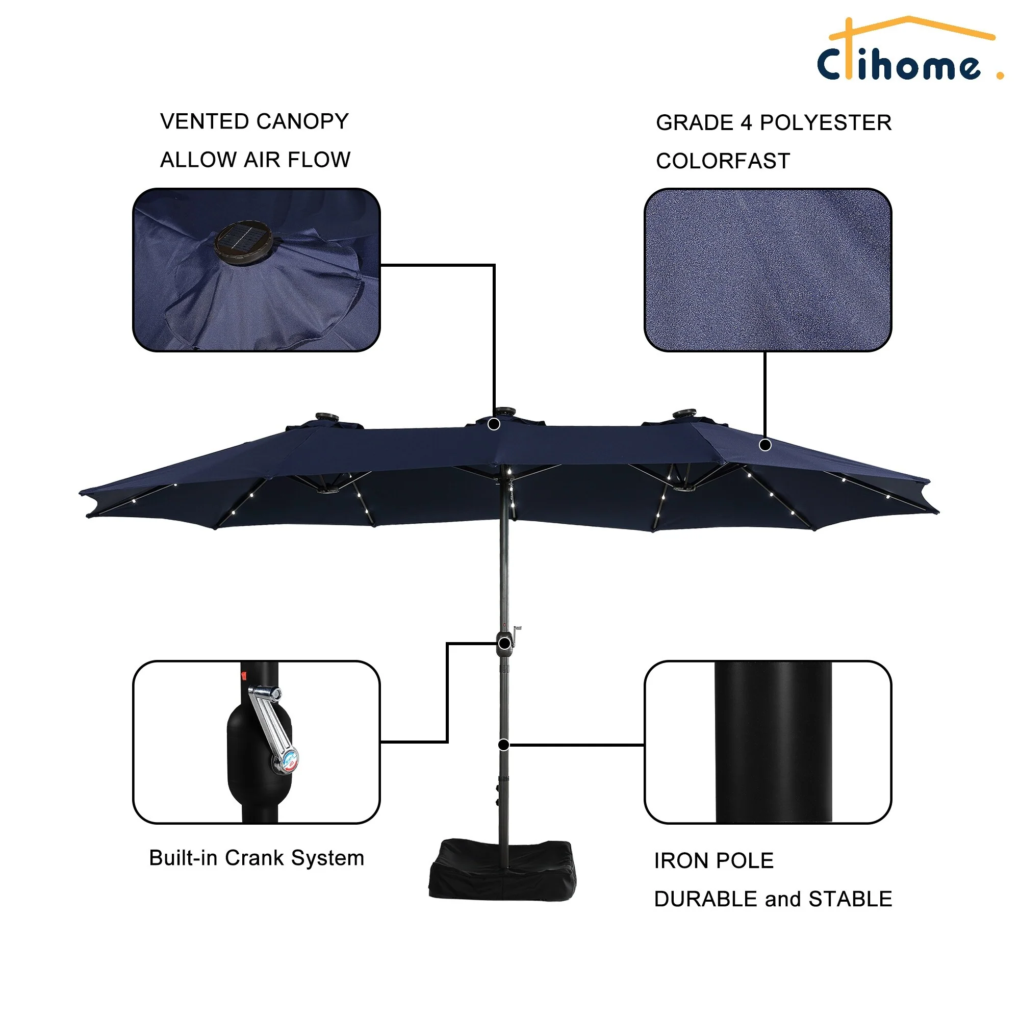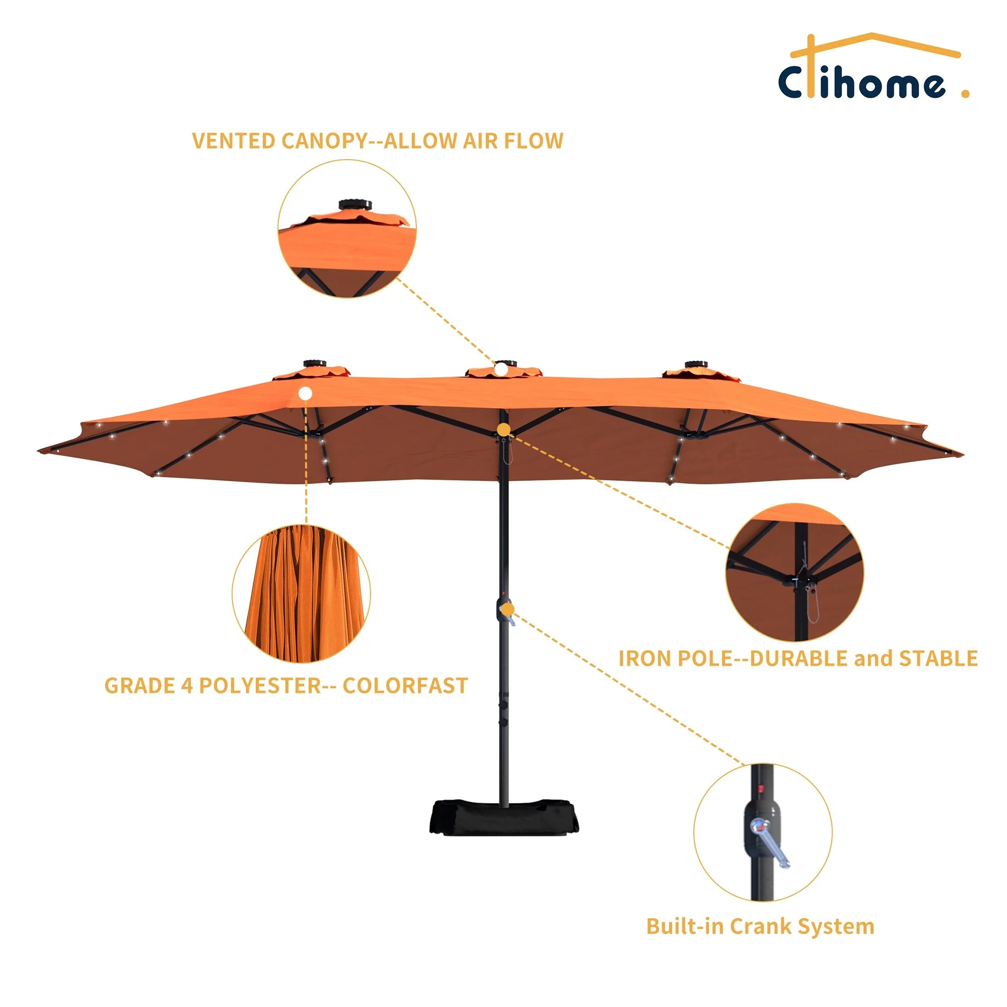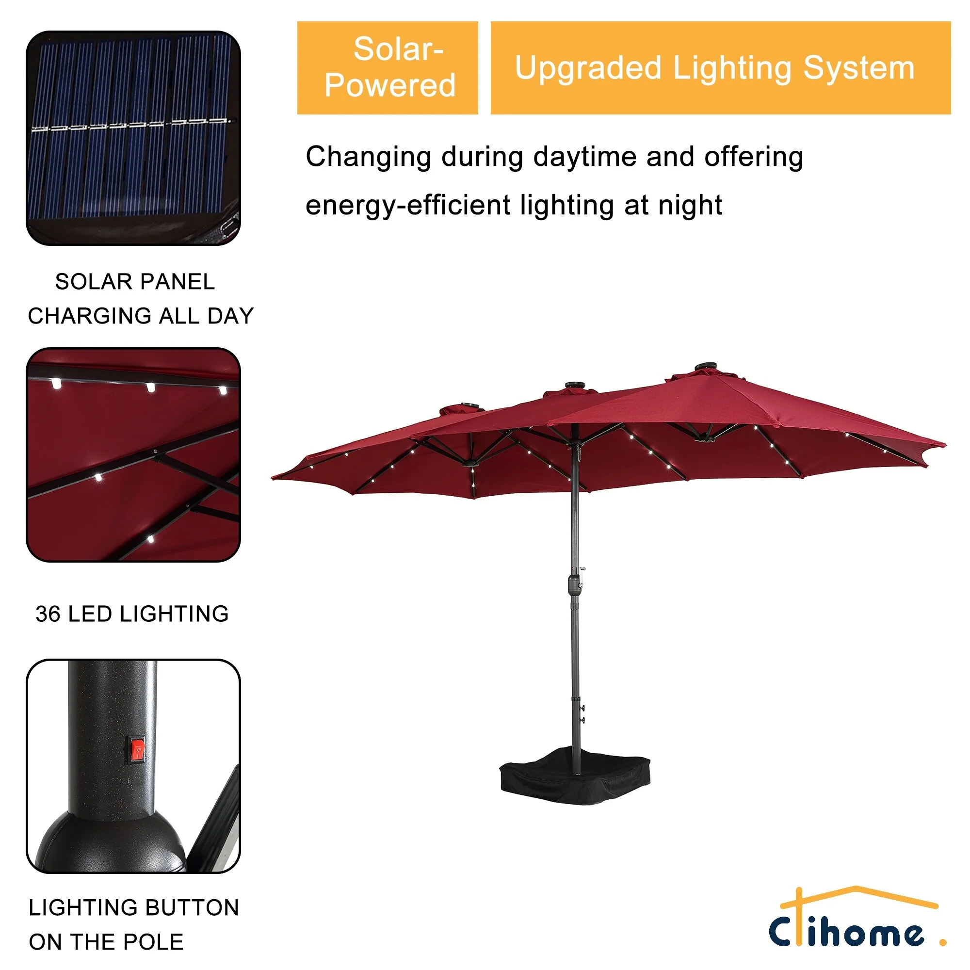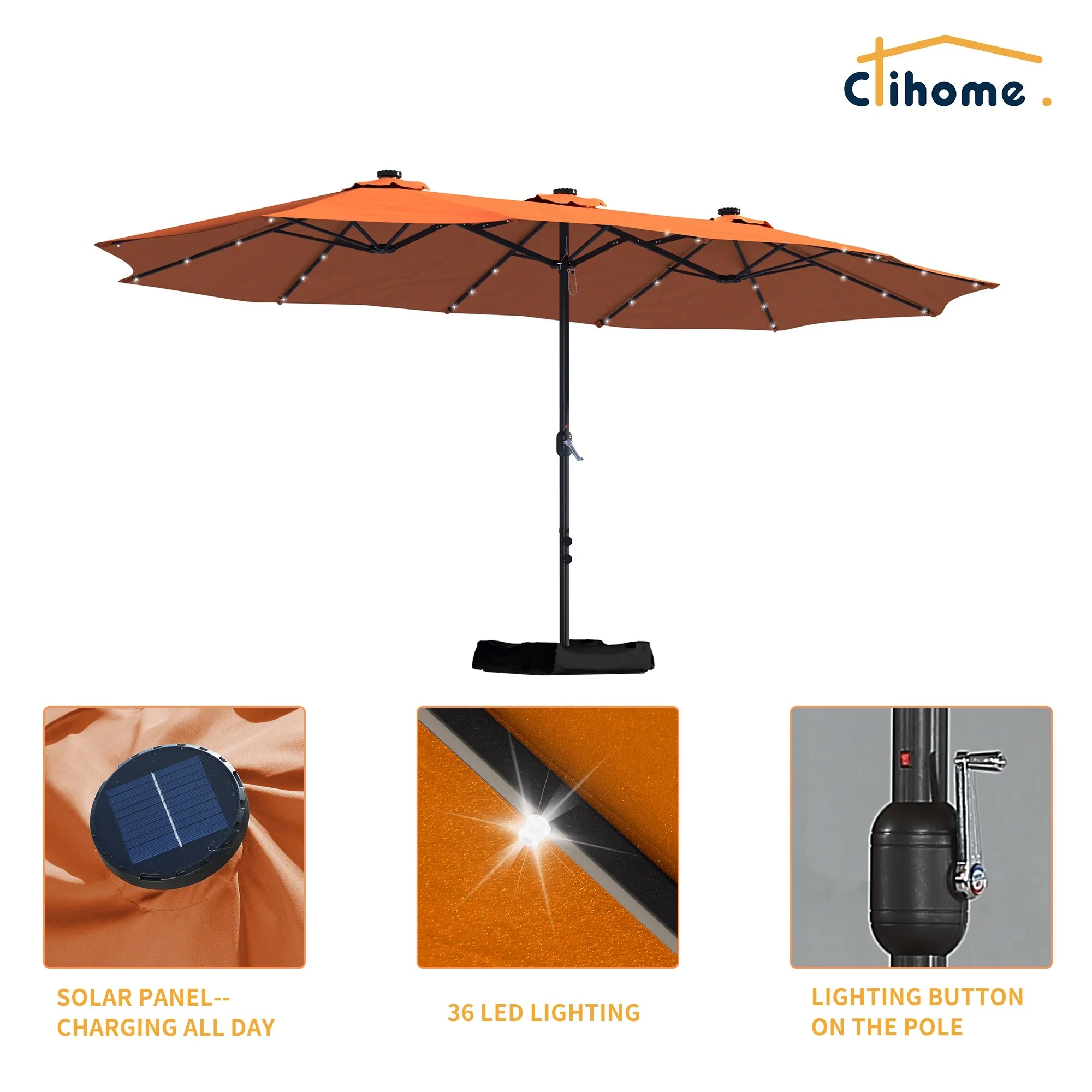 Clihome 15FT Double-Sided Solar Light Market Crank Umbrella with Base