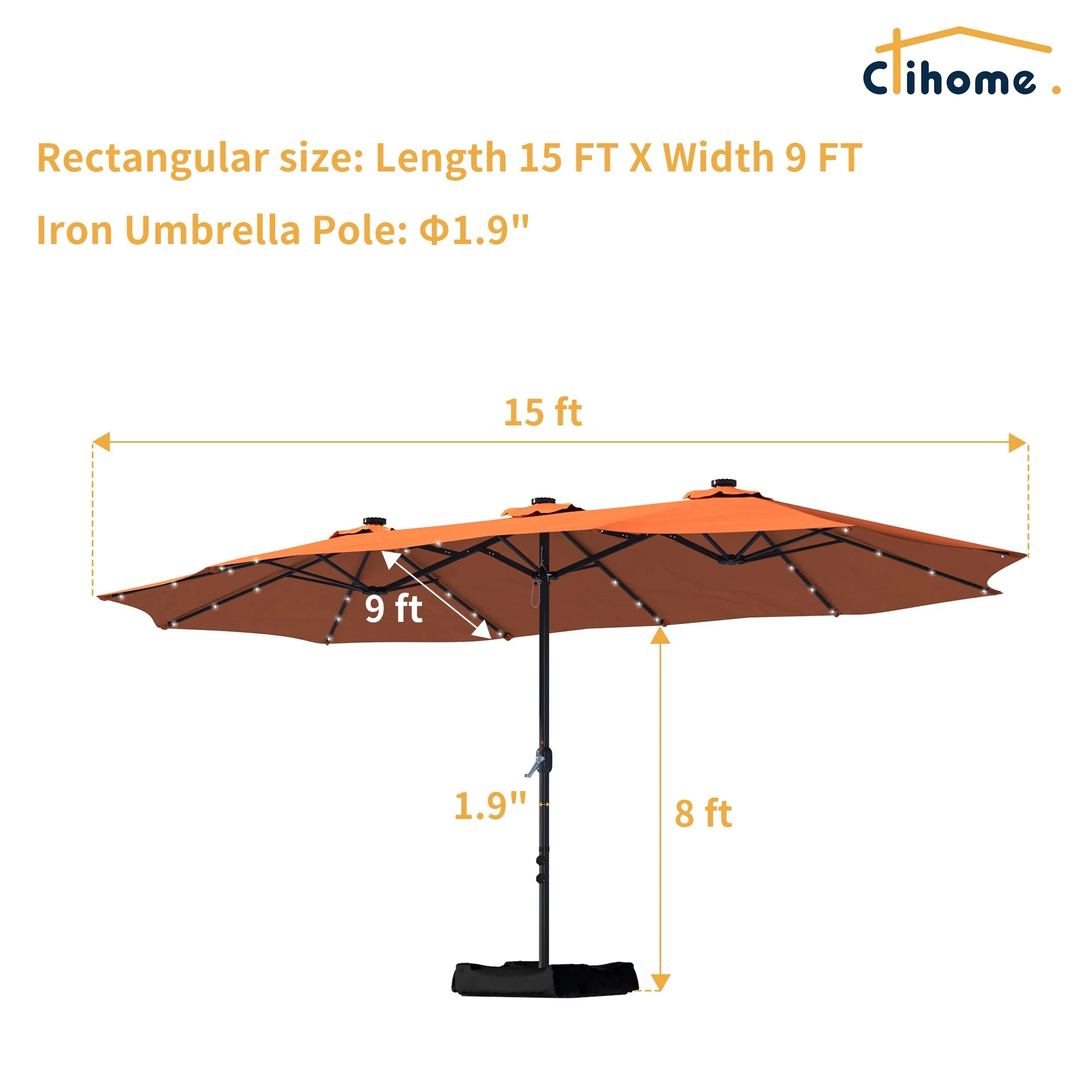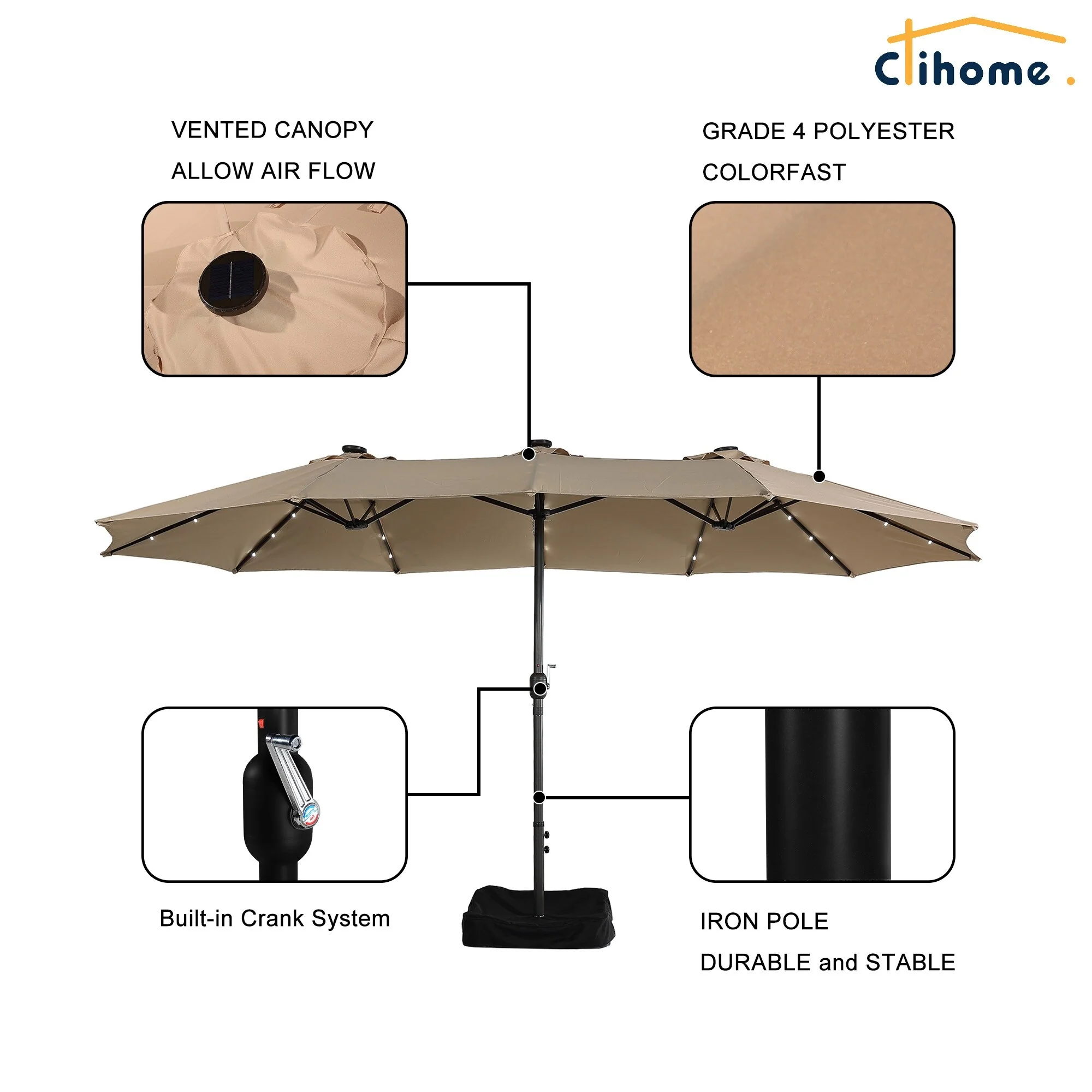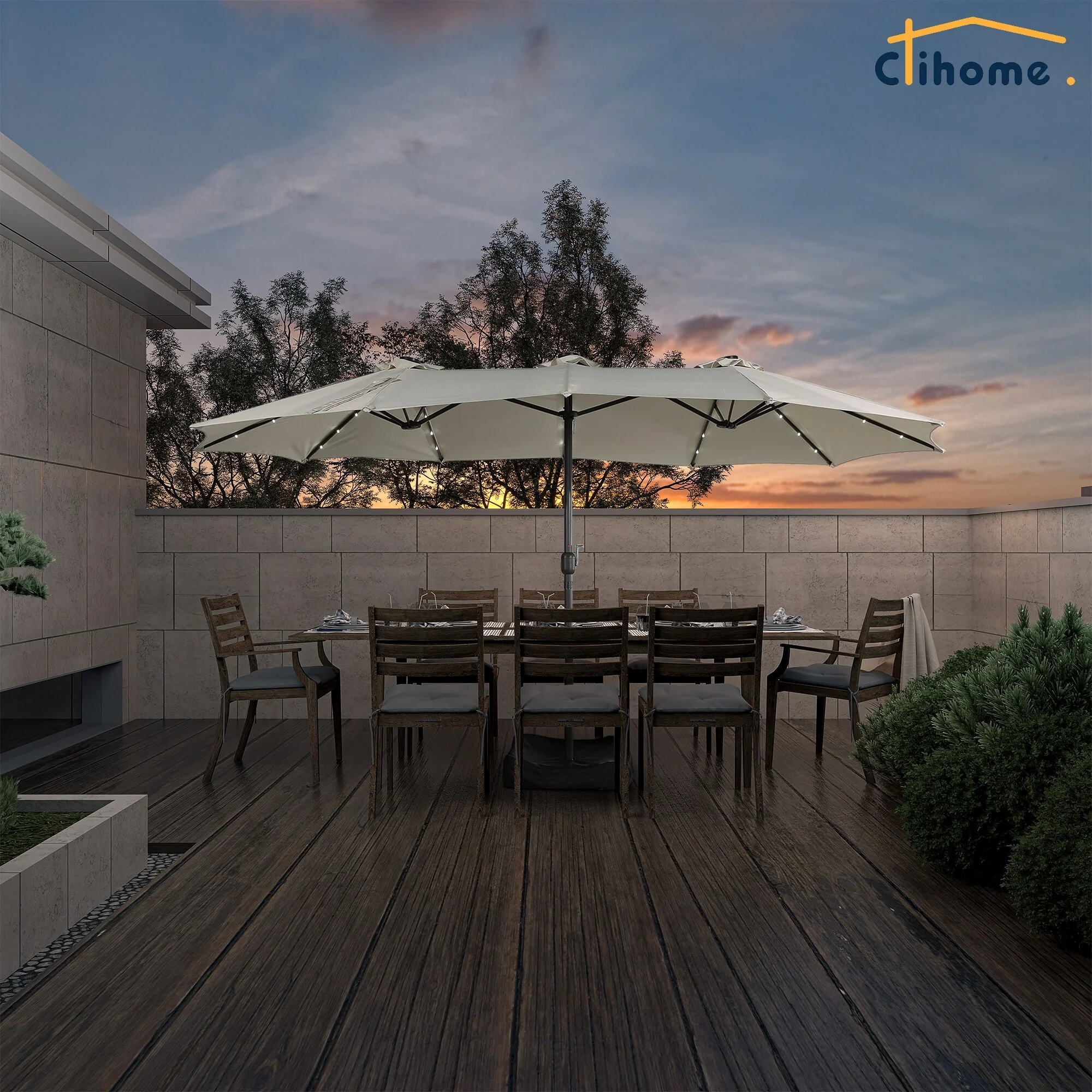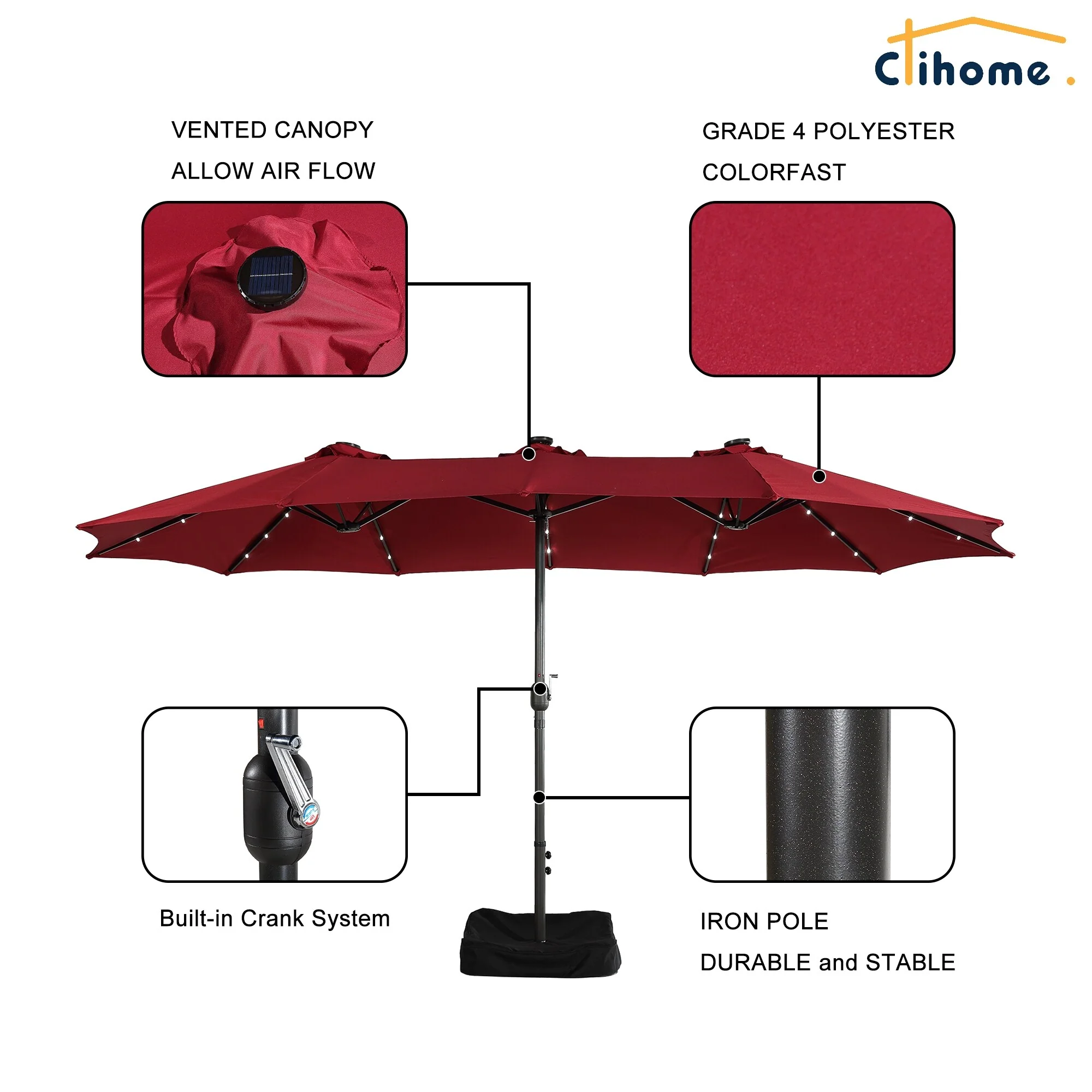 Clihome 15FT Double-Sided Solar Light Market Crank Umbrella with Base