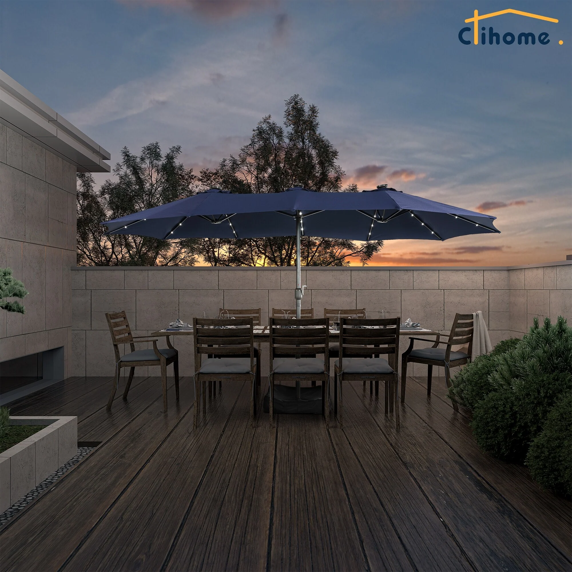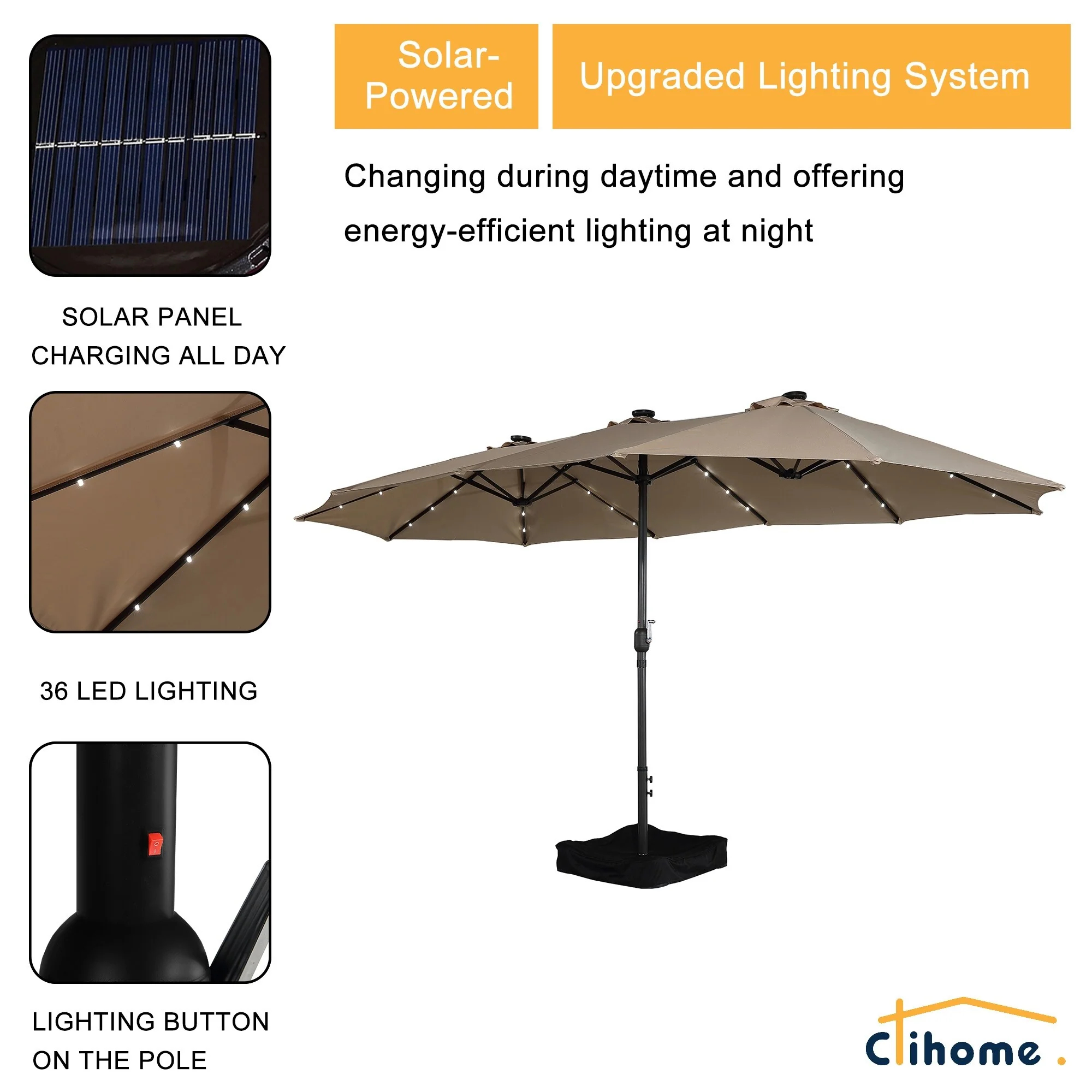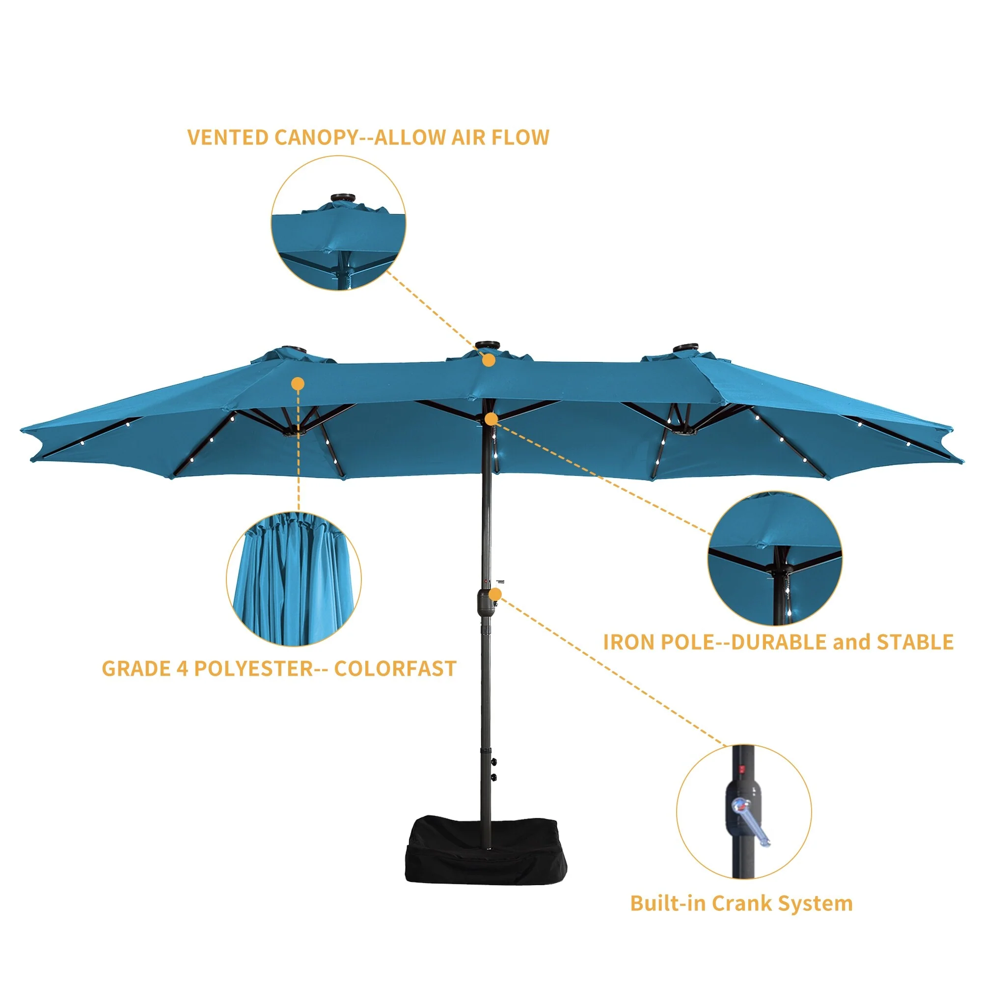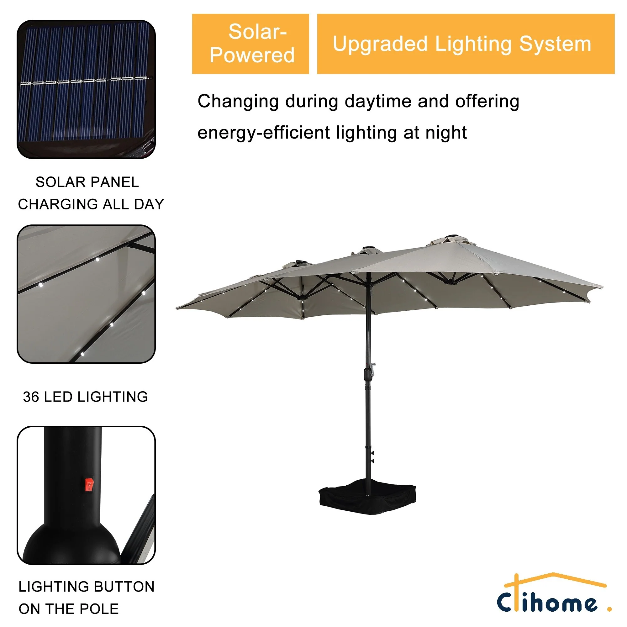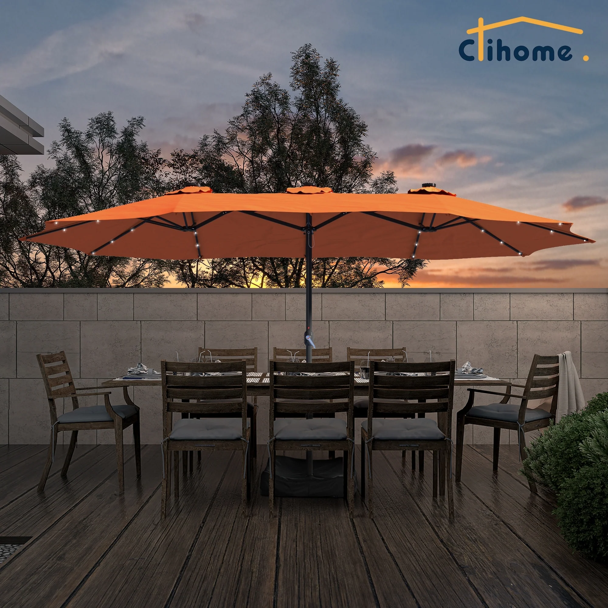Clihome 15FT Double-Sided Solar Light Market Crank Umbrella with Base