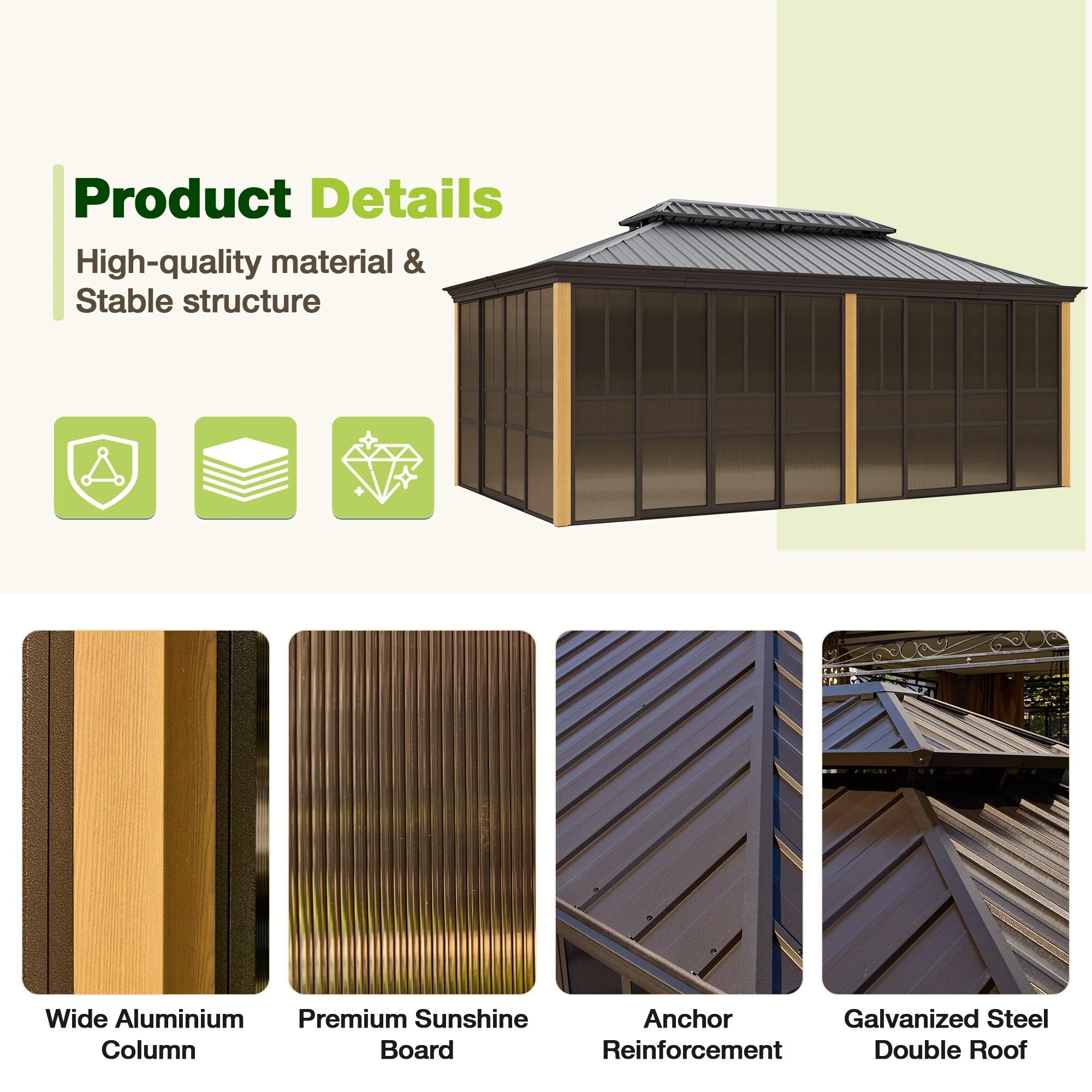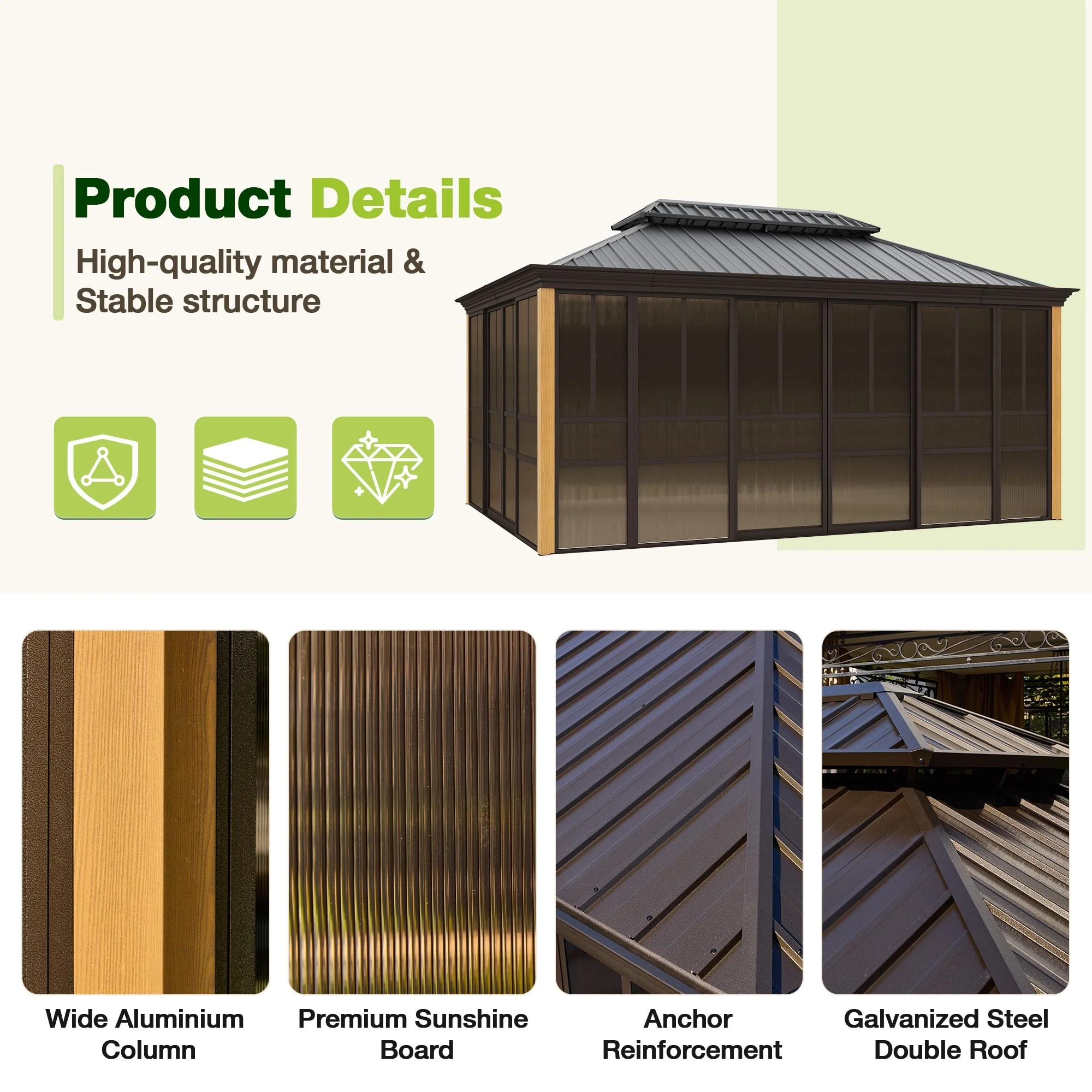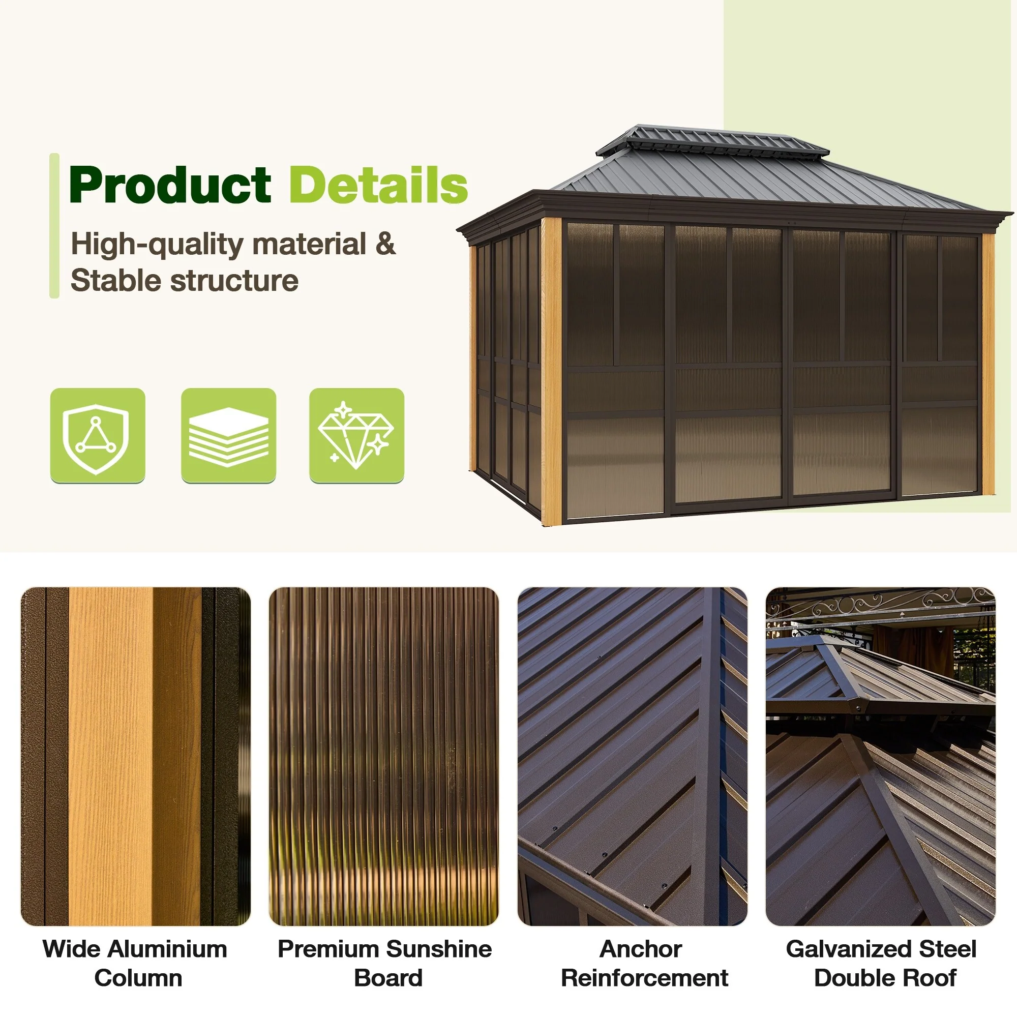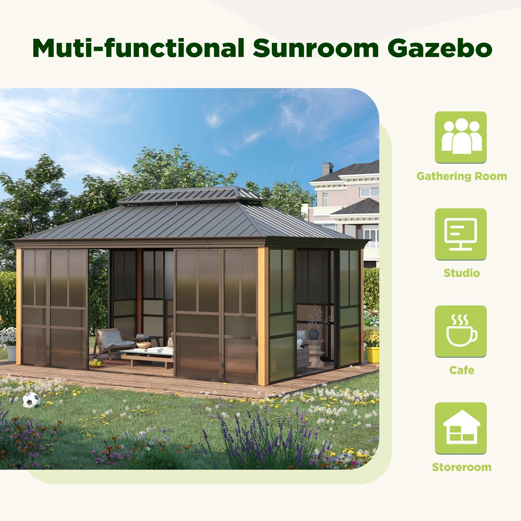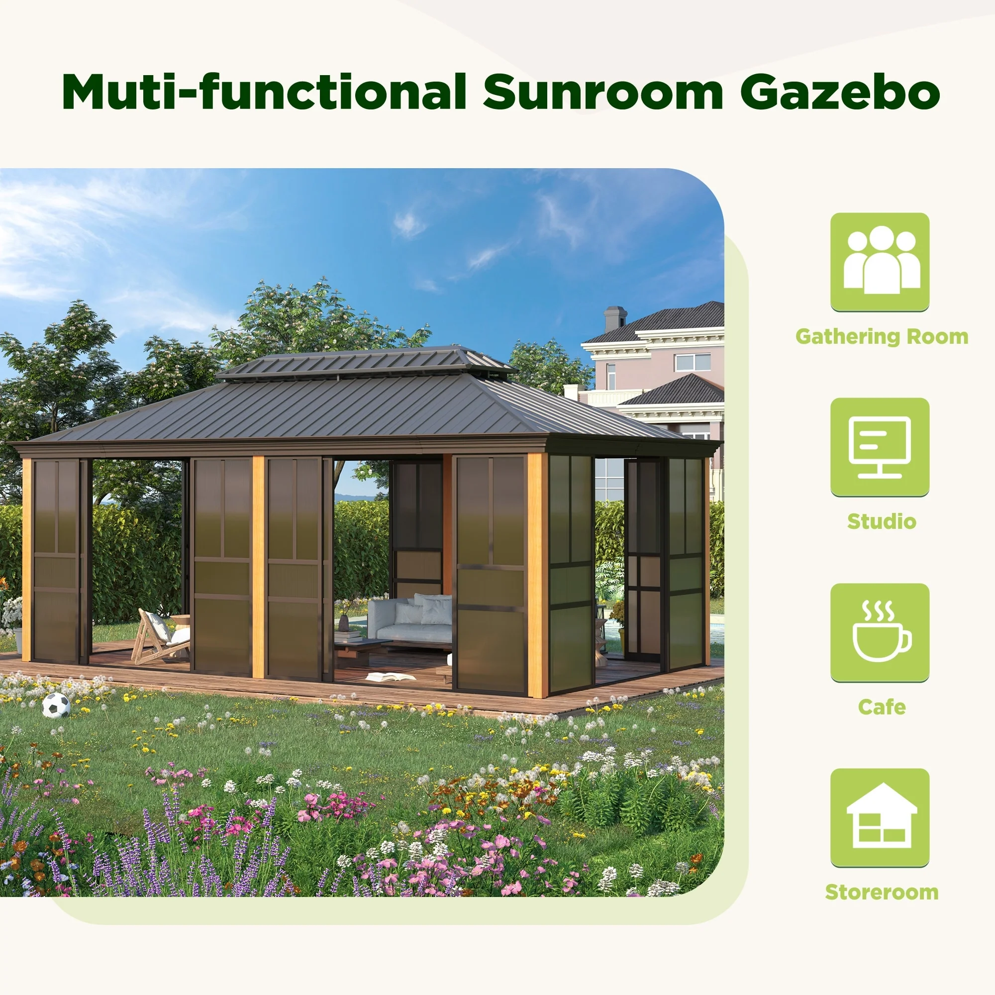 Outdoor Hardtop Sunroom Gazebo with Double Roof & Sliding Doors, All-Season Aluminum Outdoor Pergola, PE Screens&Lockable Design