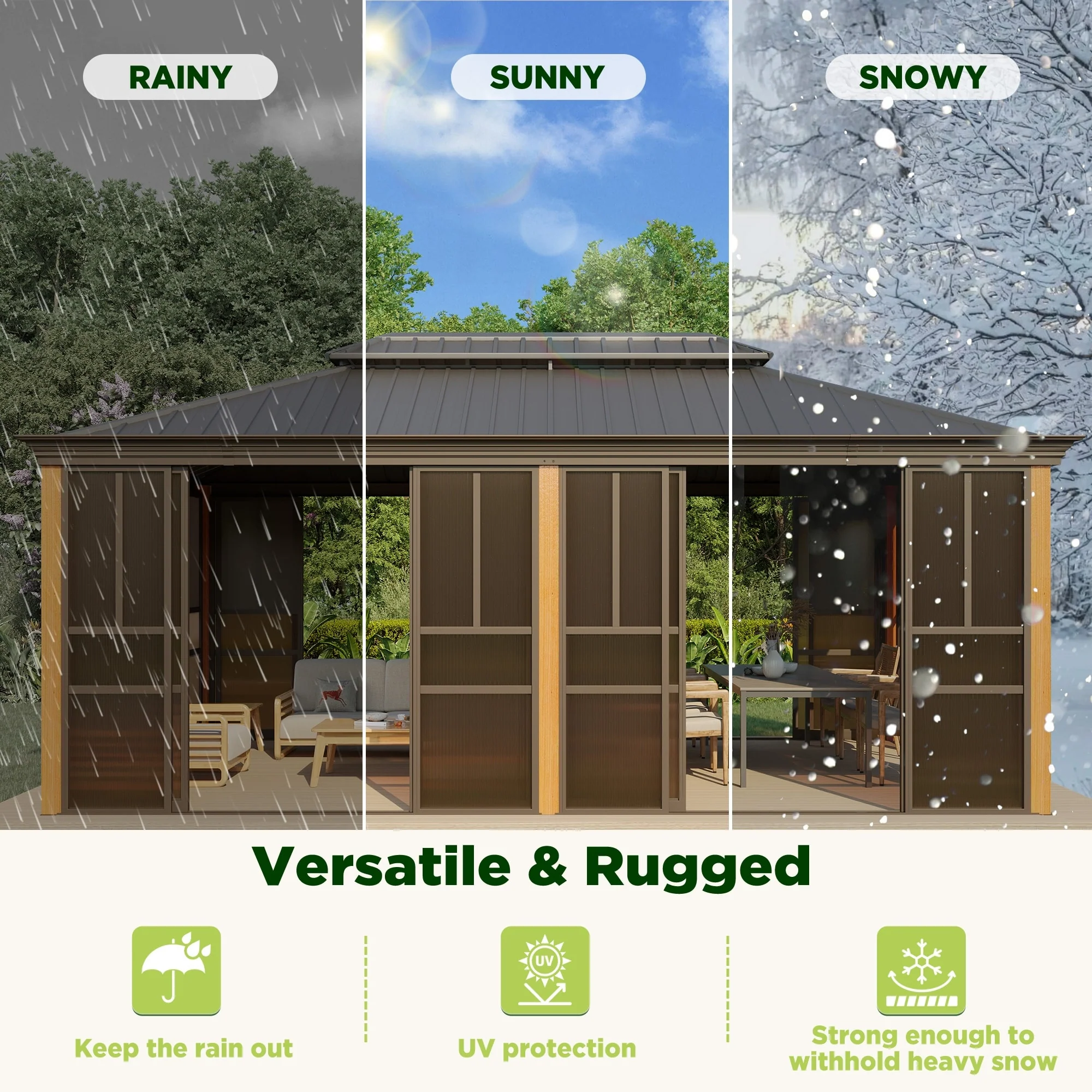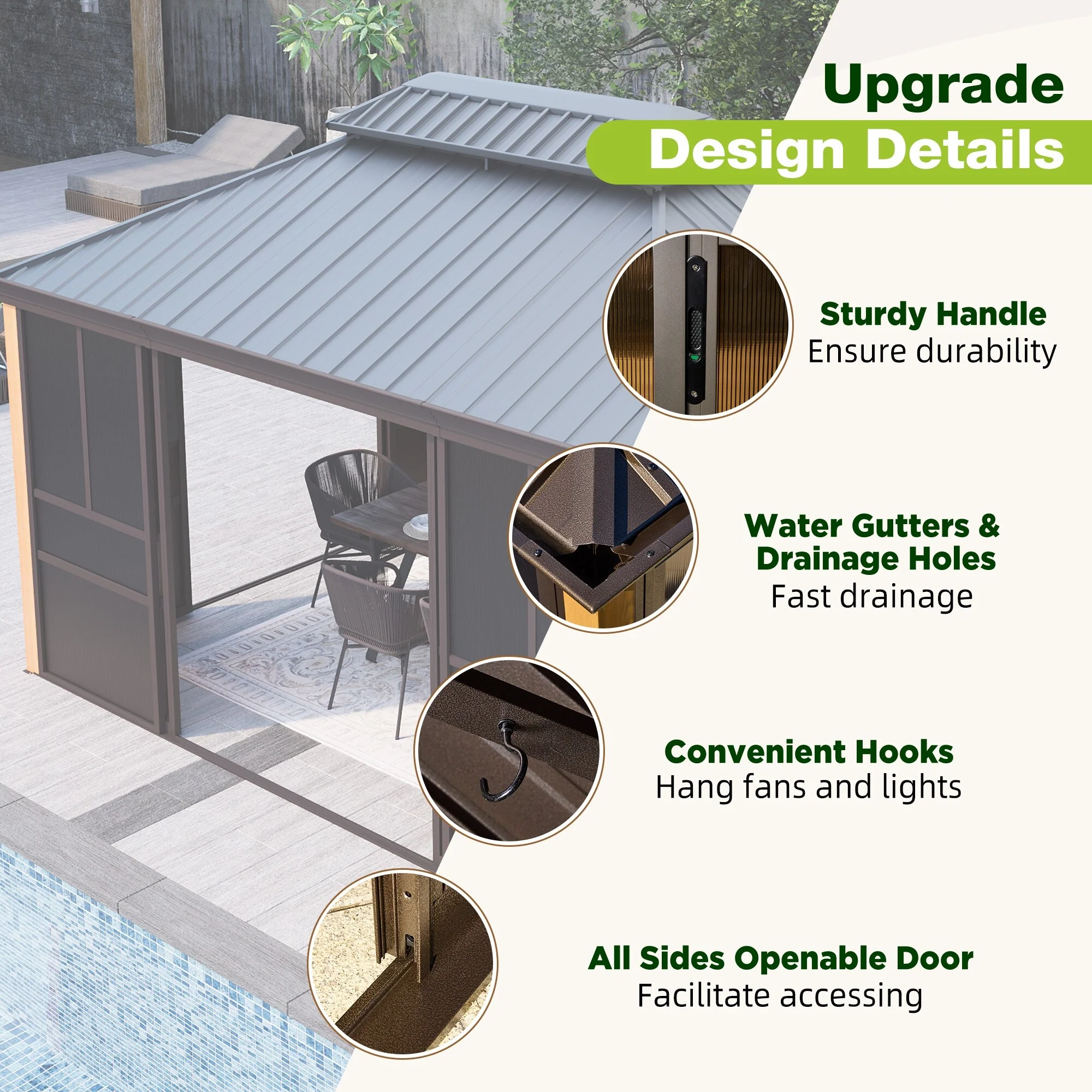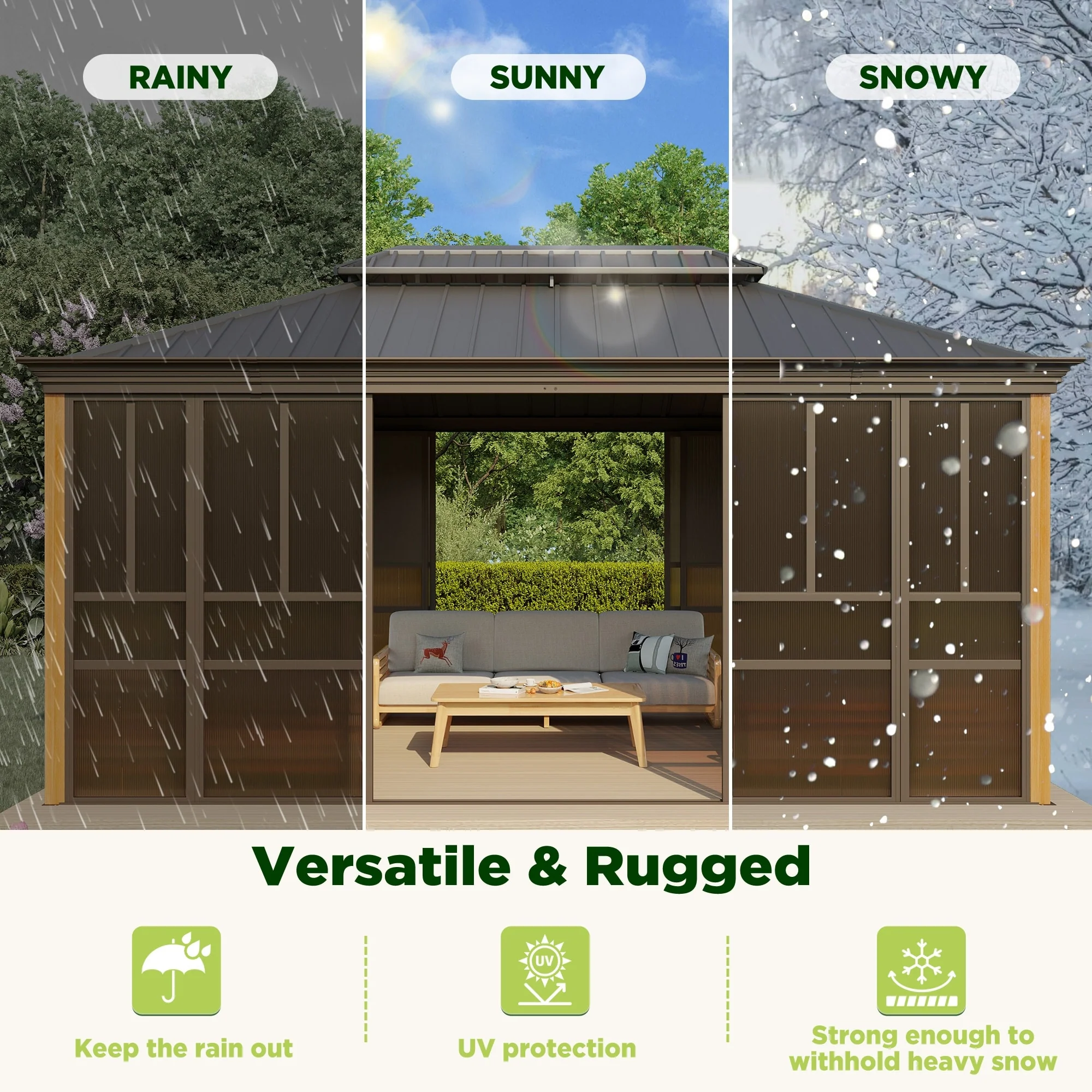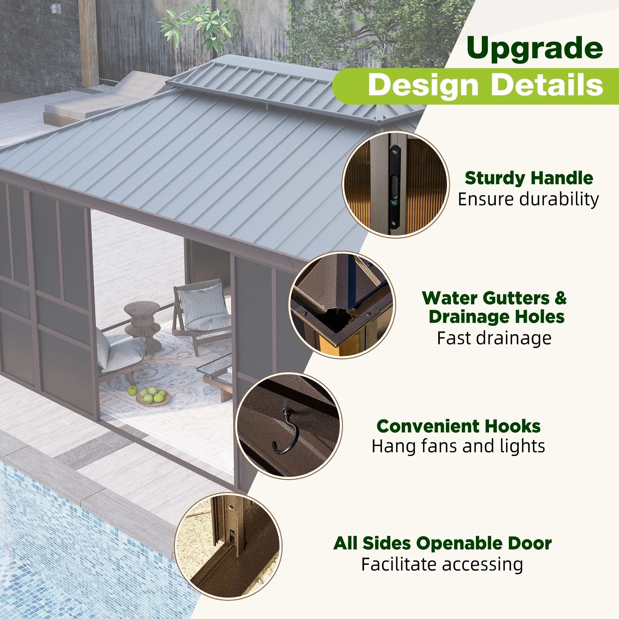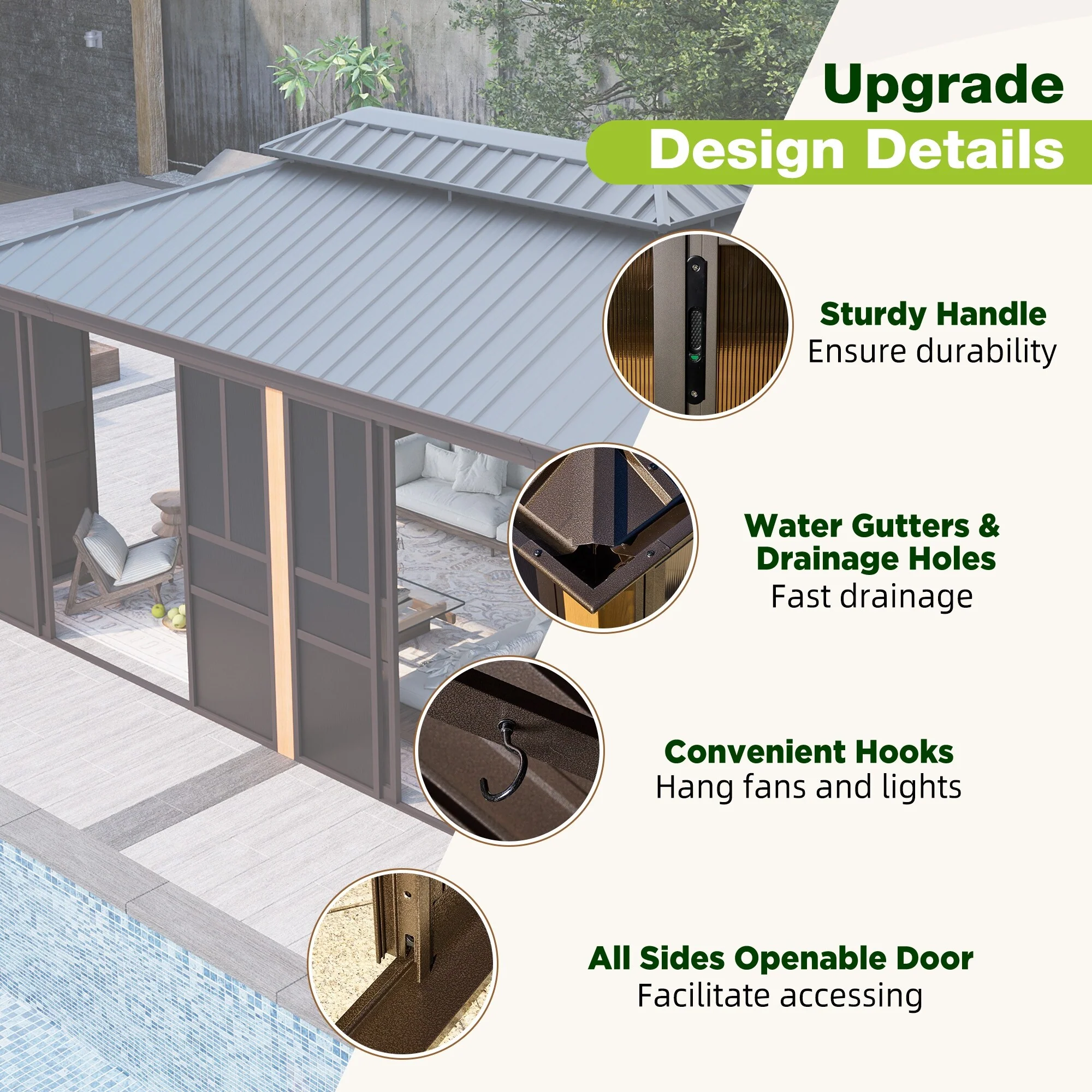 Outdoor Hardtop Sunroom Gazebo with Double Roof & Sliding Doors, All-Season Aluminum Outdoor Pergola, PE Screens&Lockable Design