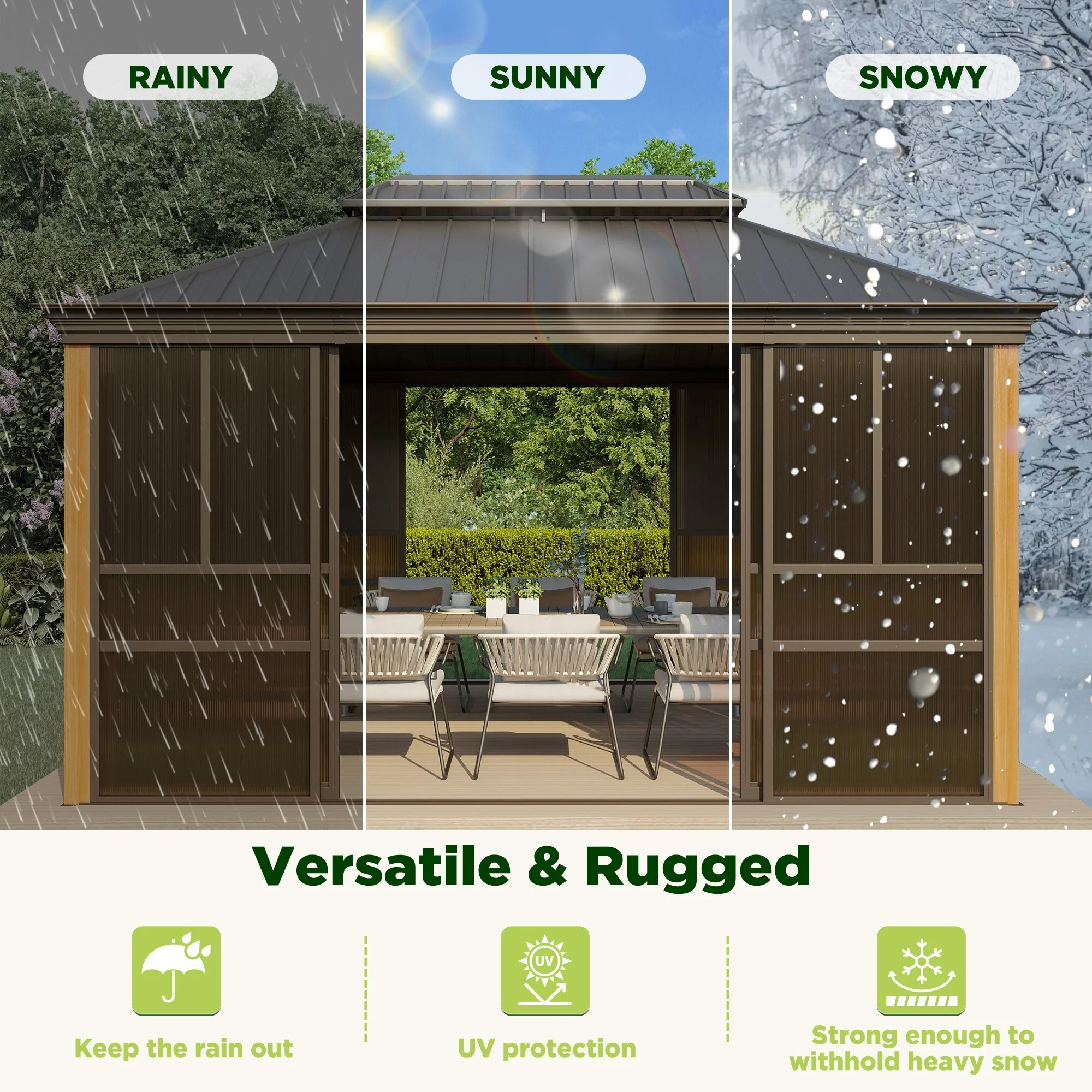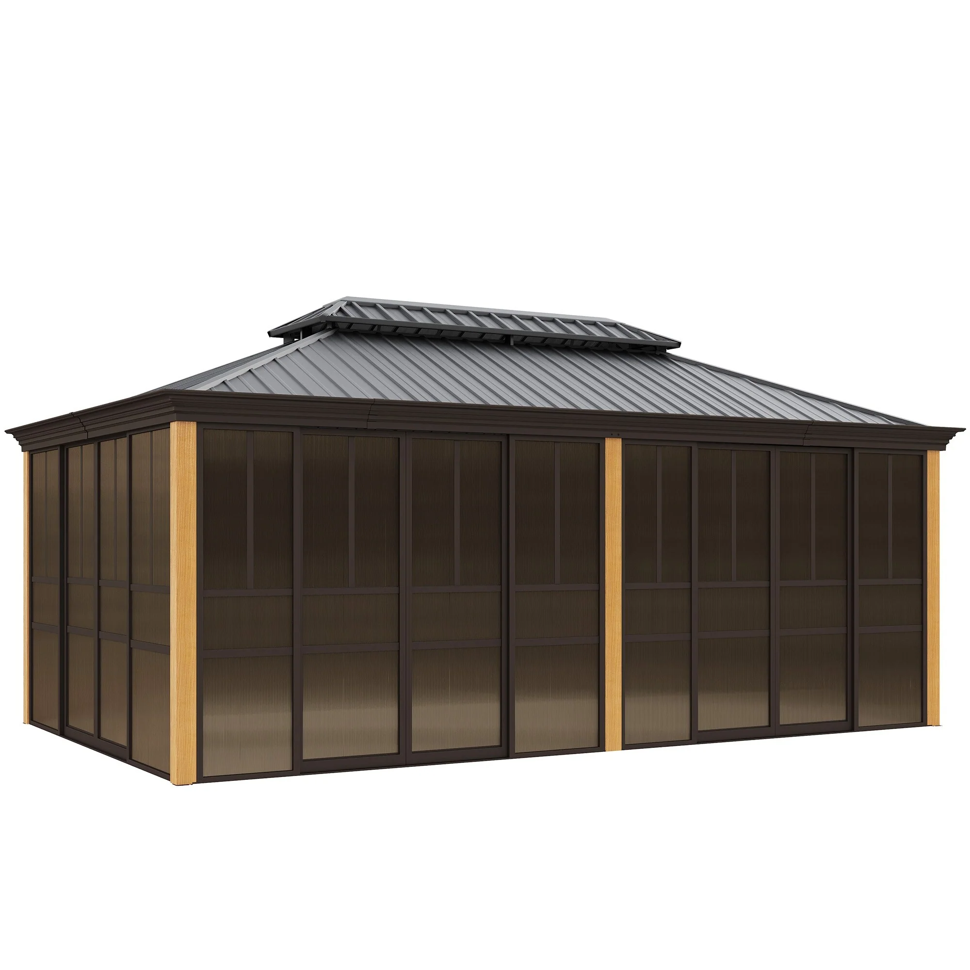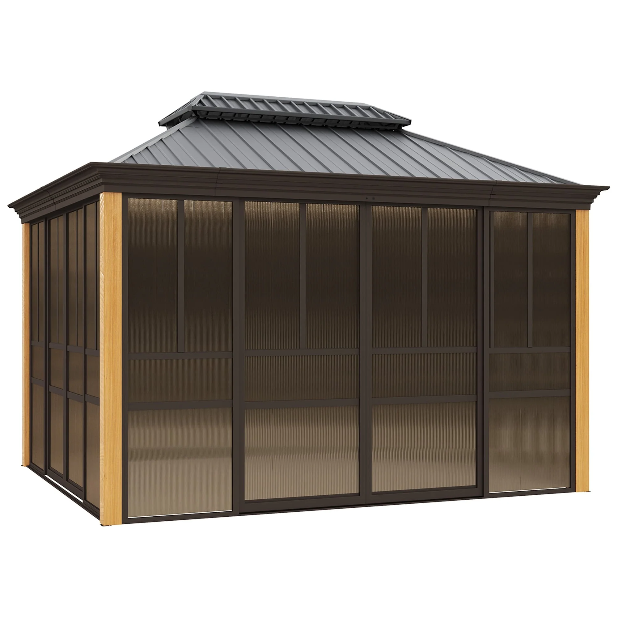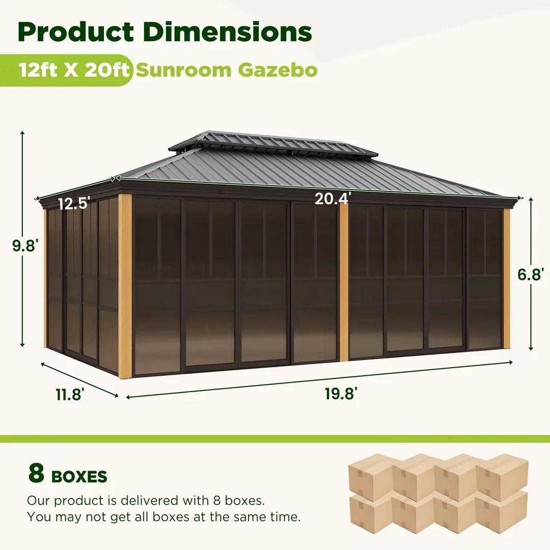 Outdoor Hardtop Sunroom Gazebo with Double Roof & Sliding Doors, All-Season Aluminum Outdoor Pergola, PE Screens&Lockable Design