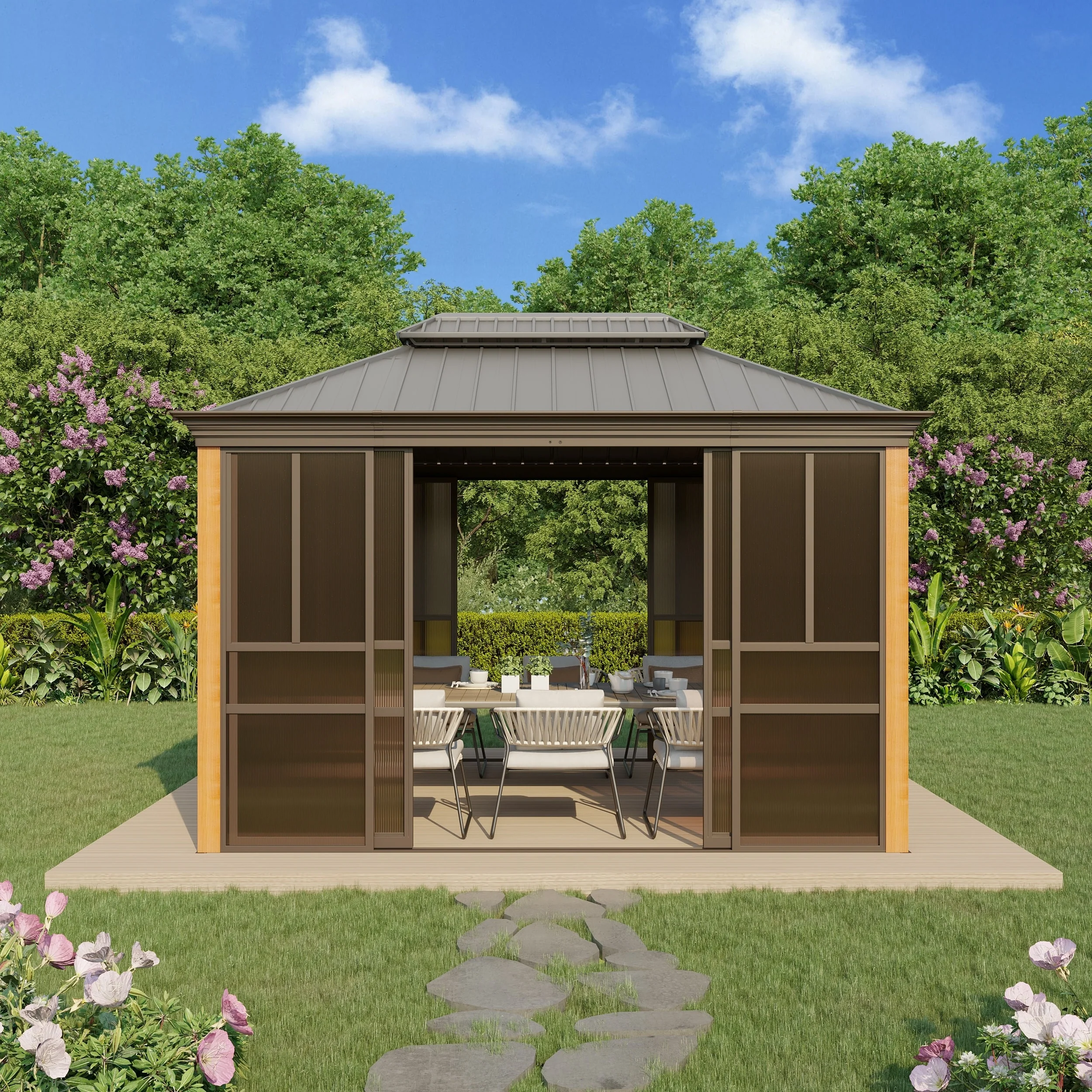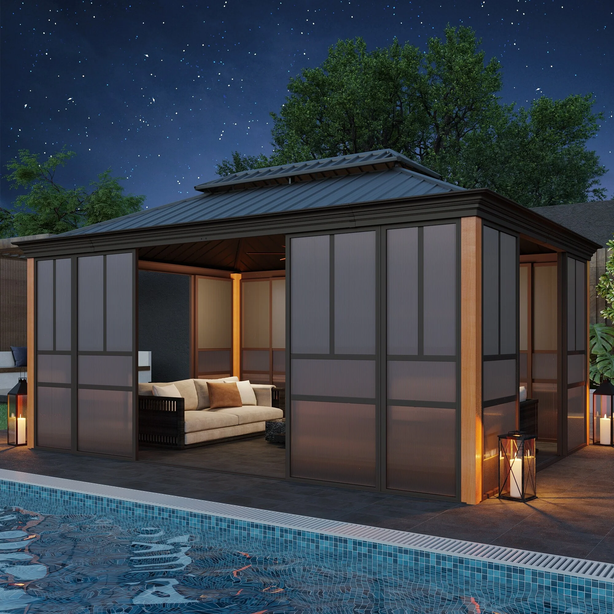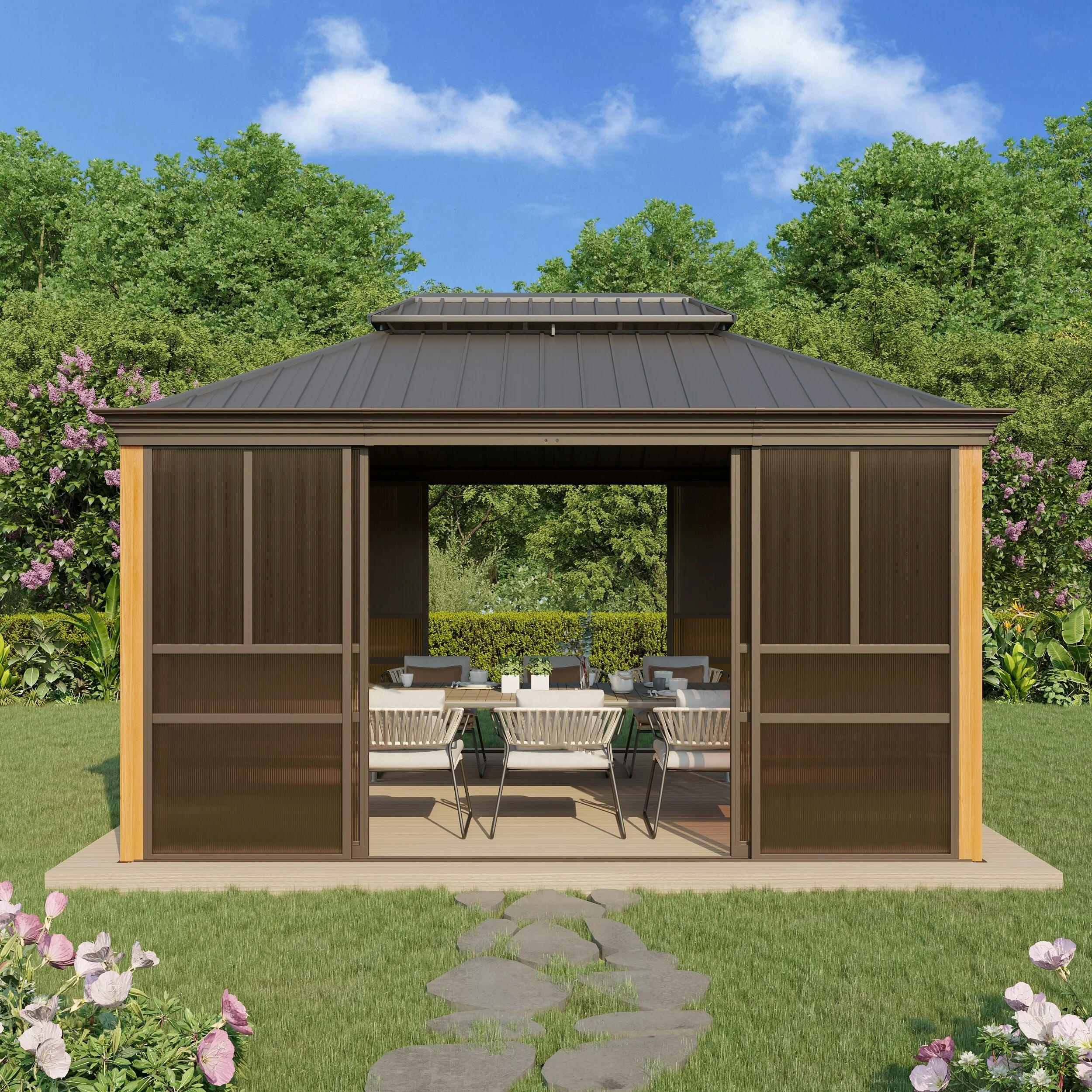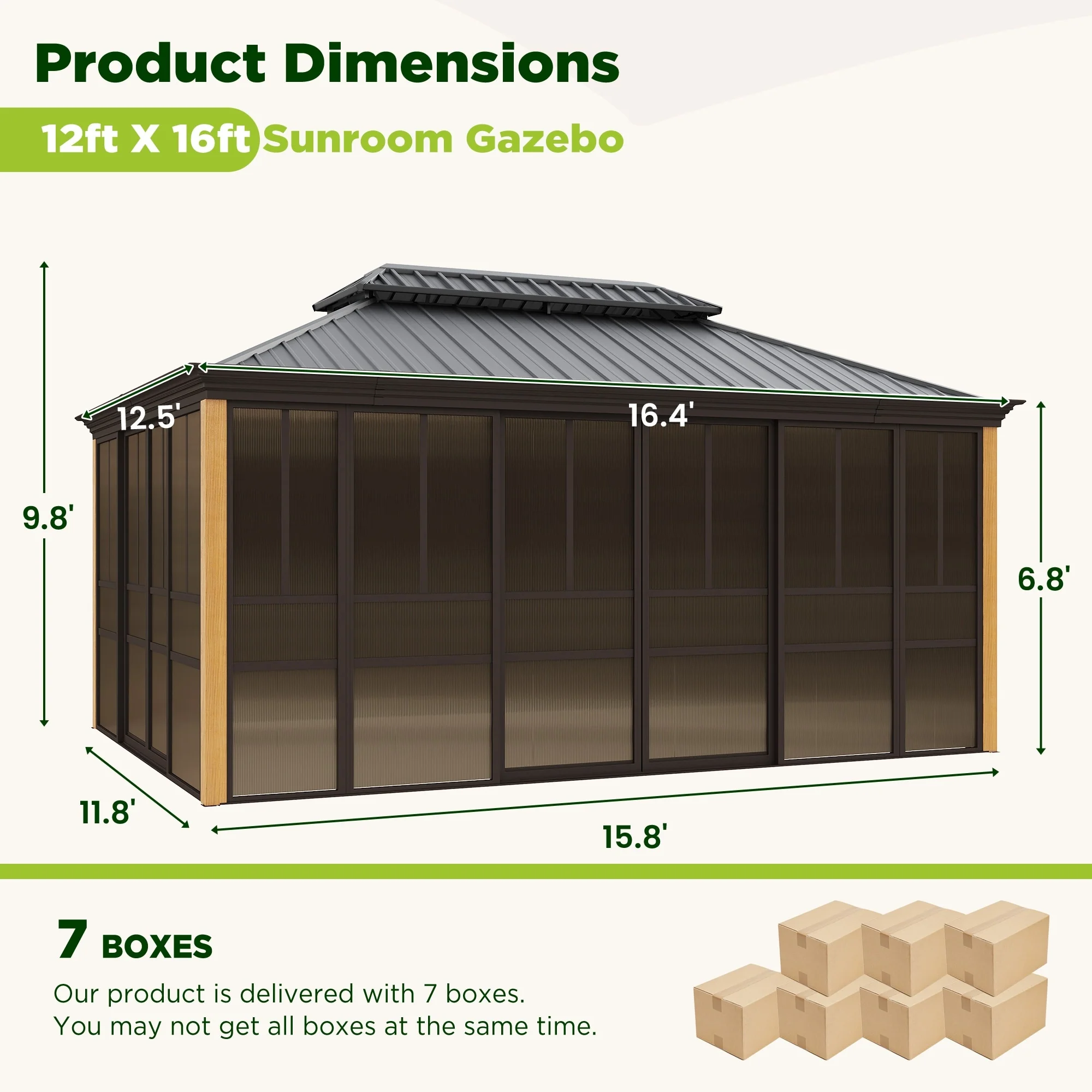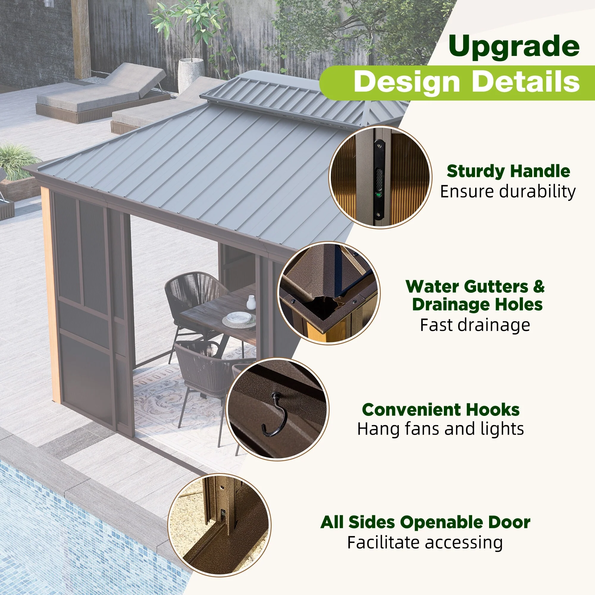 Outdoor Hardtop Sunroom Gazebo with Double Roof & Sliding Doors, All-Season Aluminum Outdoor Pergola, PE Screens&Lockable Design