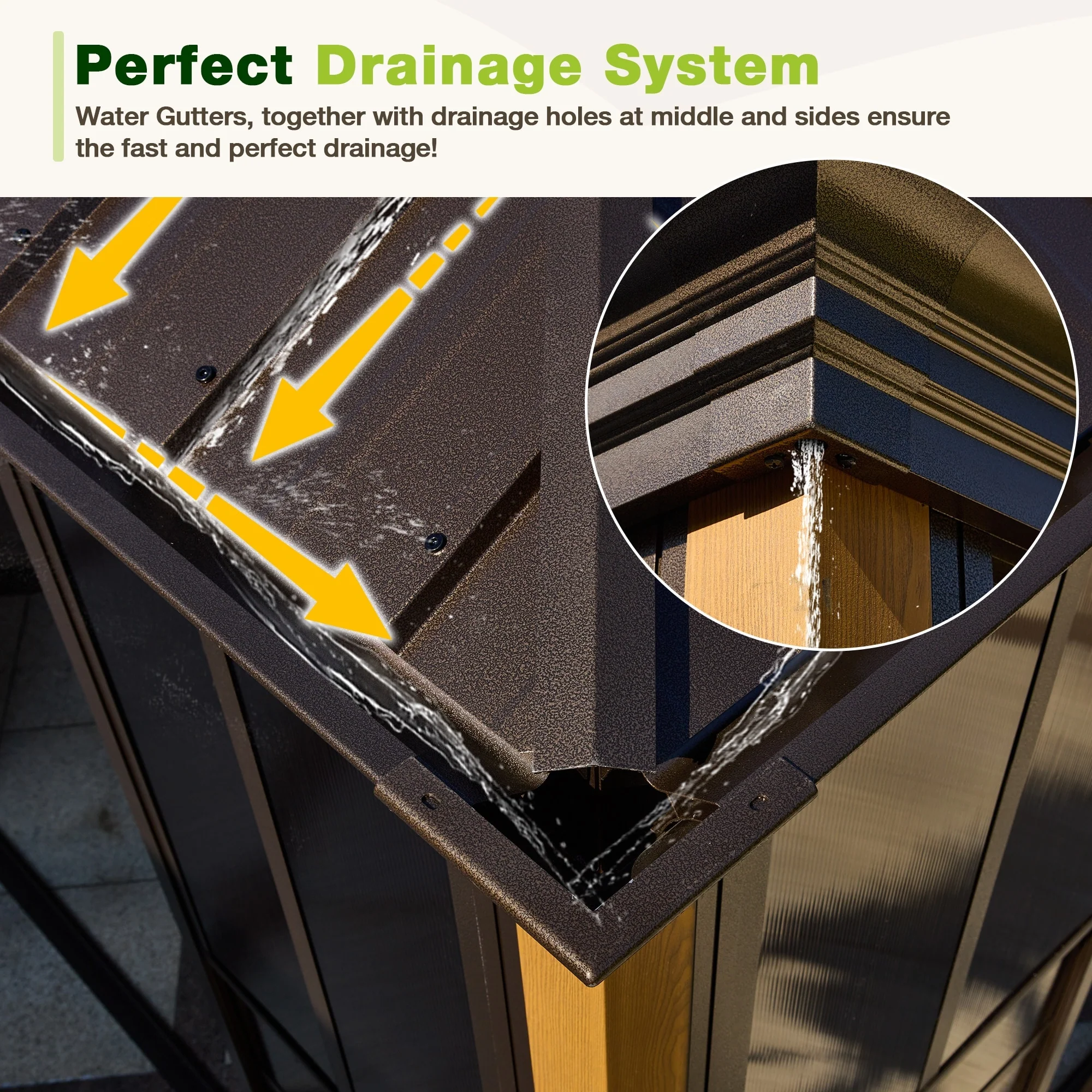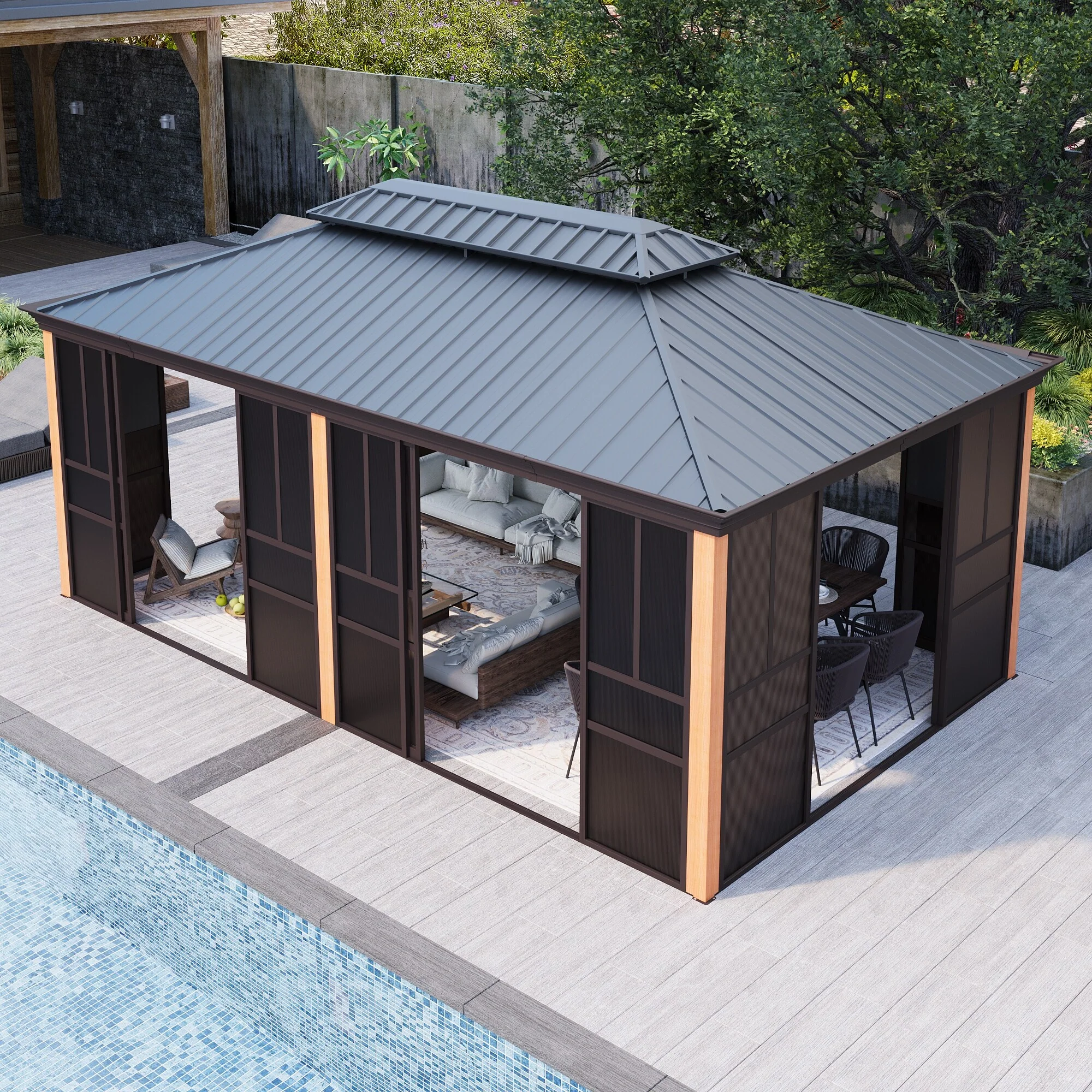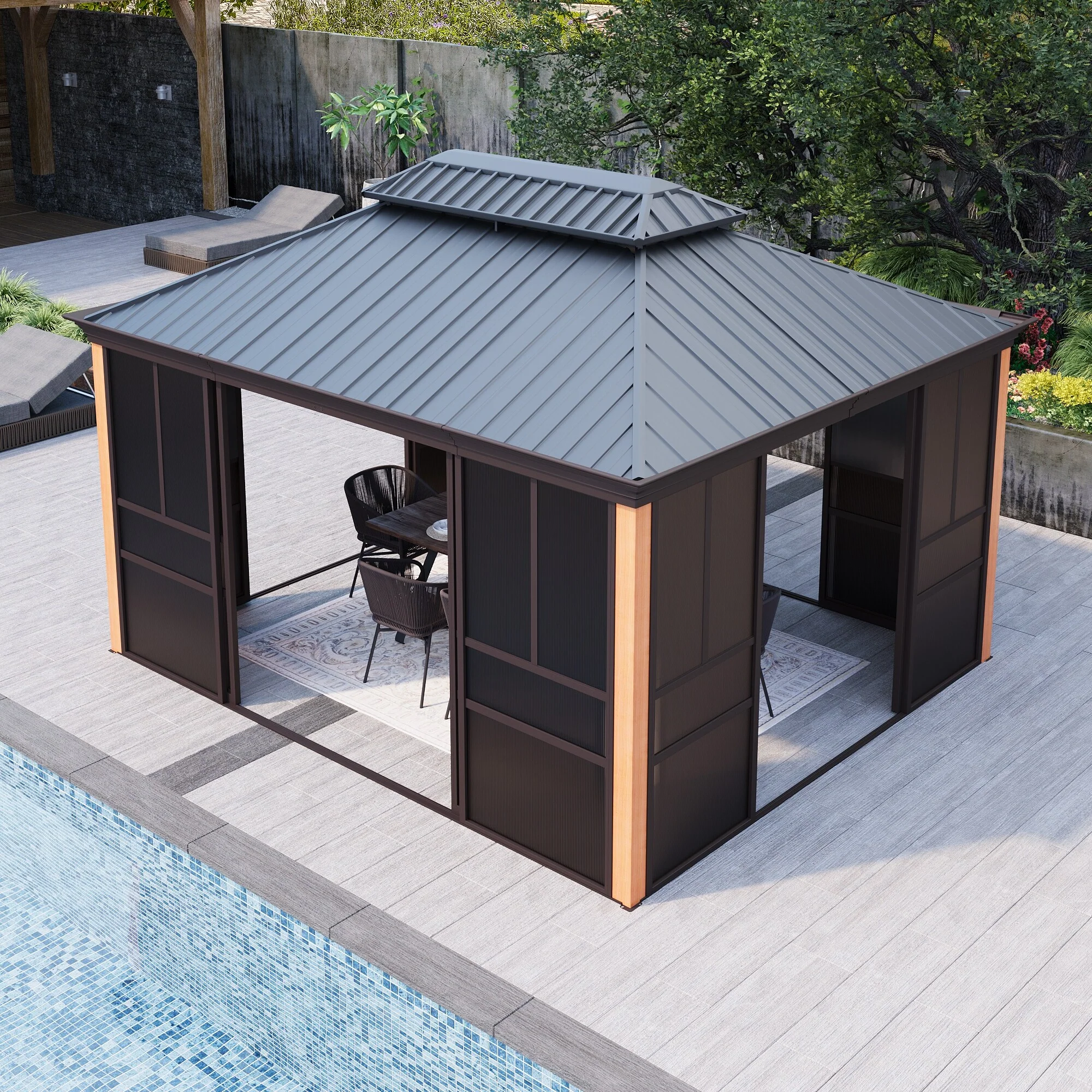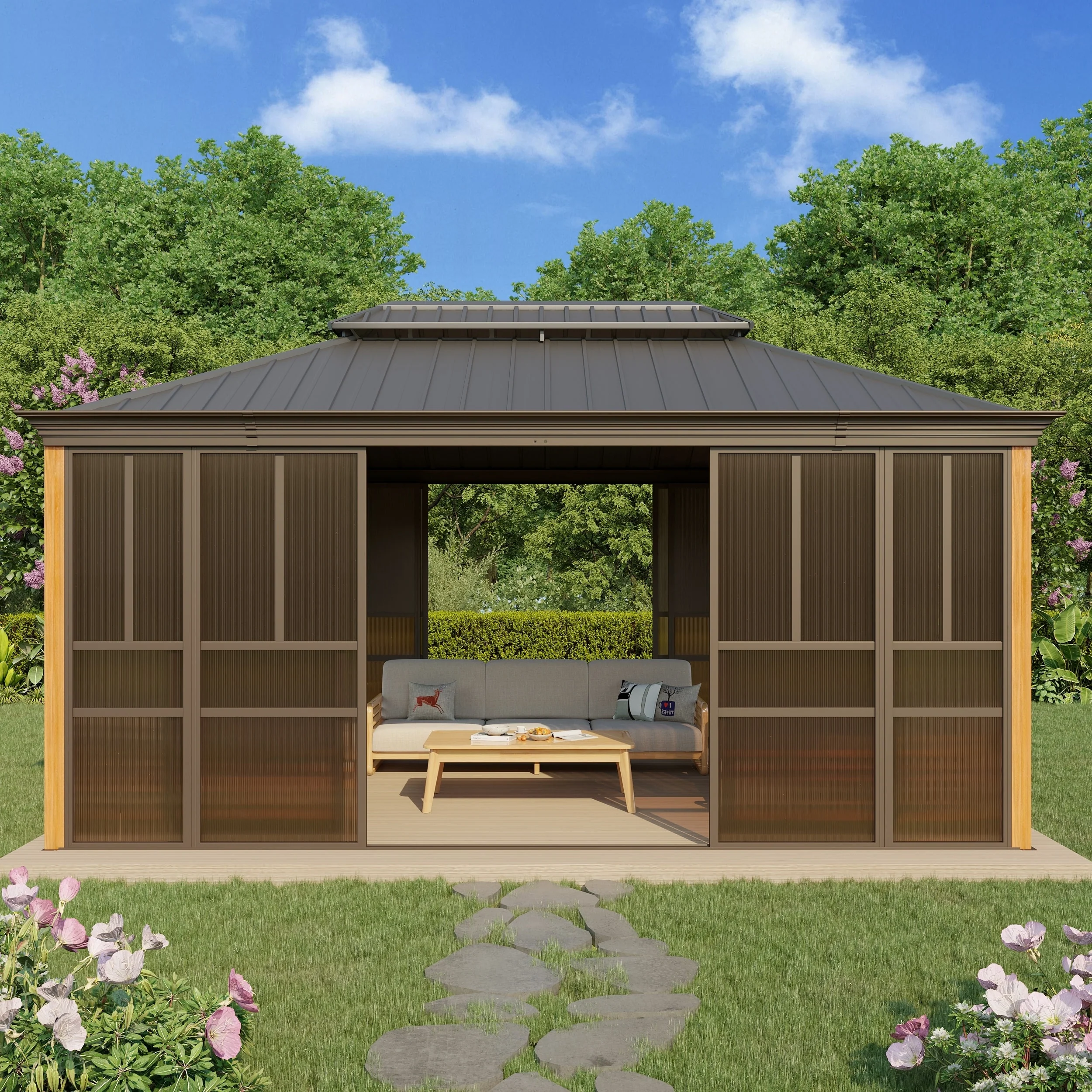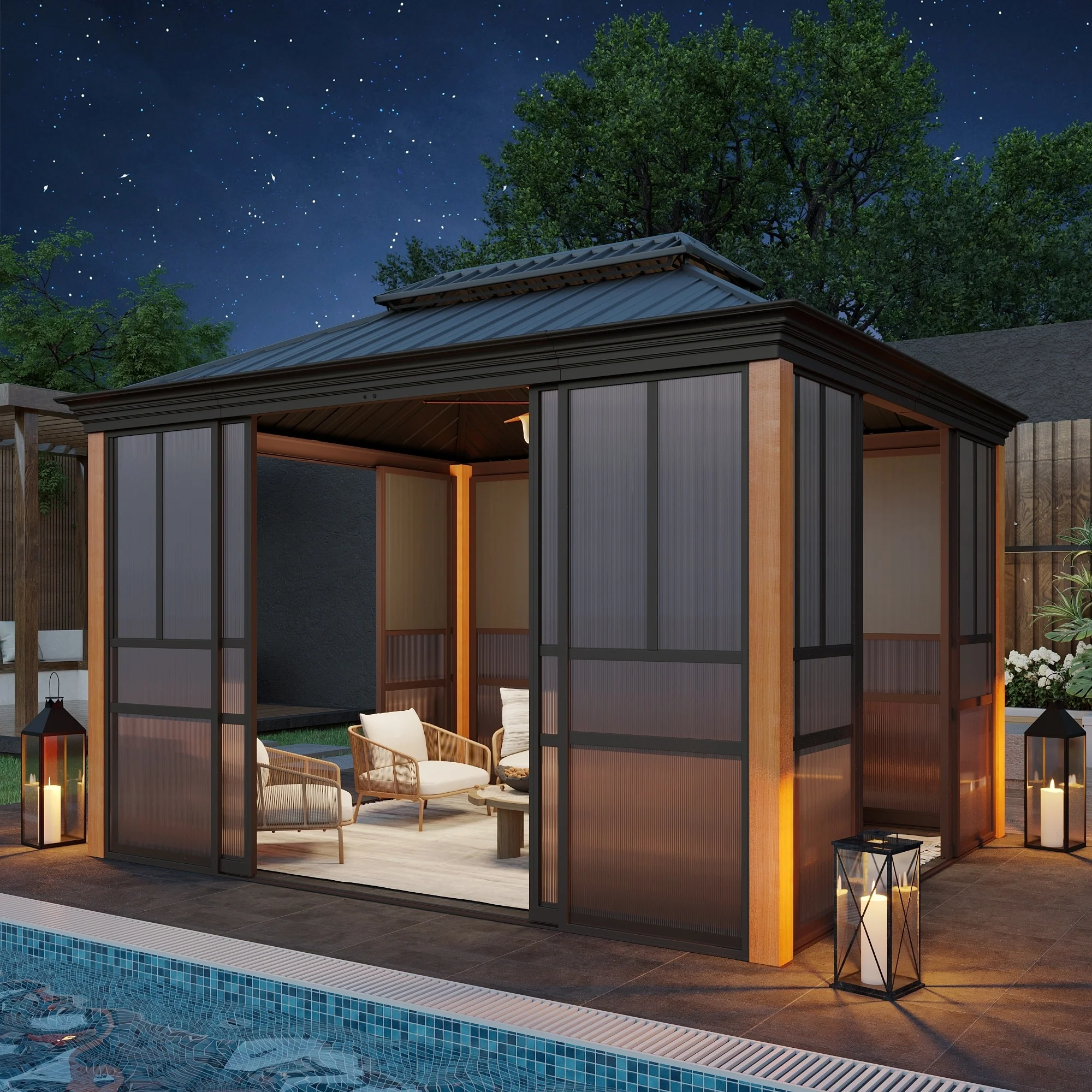 Outdoor Hardtop Sunroom Gazebo with Double Roof & Sliding Doors, All-Season Aluminum Outdoor Pergola, PE Screens&Lockable Design