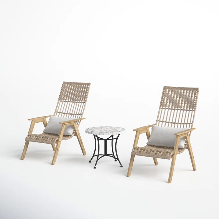 Why not welcome a little tropical coastal charm into your backyard with this 3-piece teak patio lounge chair set? These chairs are crafted with teak wood frames and sling-style seats in natural resin wicker with a half-round weave. The genuine teak wood has a natural brown color and wood grain that will weather to a classic gray patina over time. Plus, this blend of teak wood and resin wicker stands up to sunny and wet weather without fading, rusting, or molding. These chairs come with two toss pillows that feature water-repellent, machine-washable zip covers.
