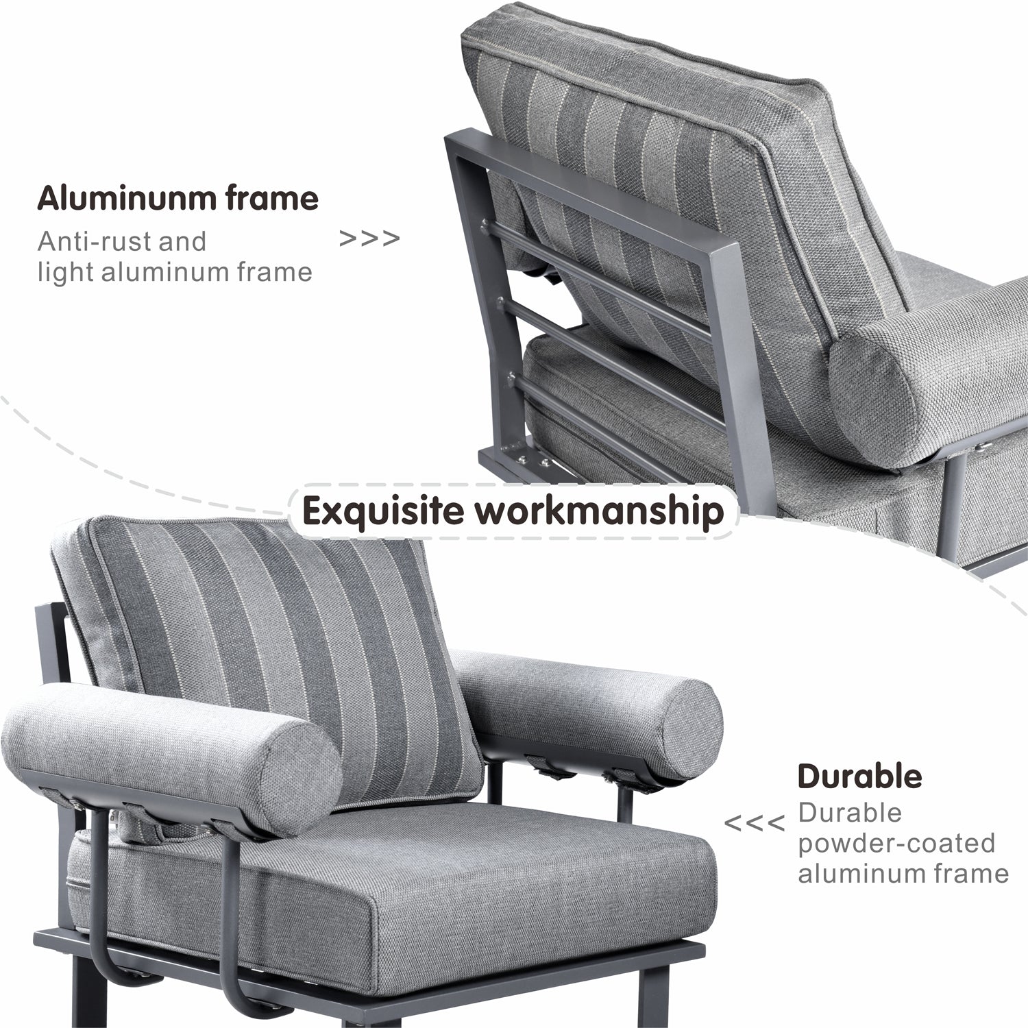 Sturdy Frame:??The patio sofa set is constructed with a powder-coated aluminum frame, making the whole set much more sturdy. It is not only light, but it also doesn't rust.??