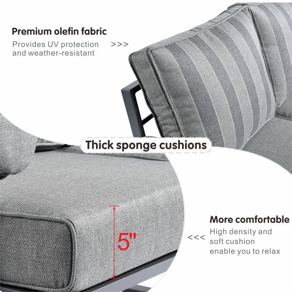 Upgraded Thick Cushions:??The 64" x 64" big seats with thicker high-density rebound sponge??are??for comfortable sitting. The cushion is made of 5" Olefin fabric, which is more durable and upgraded comfortable.
