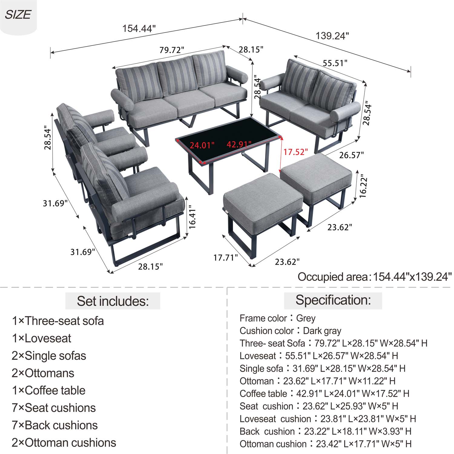 | Items Included | Sectional includes 7 Pieces: Couch x 1, Loveseat x 1, Chair x 2, Ottoman x 2, Table x 1 |