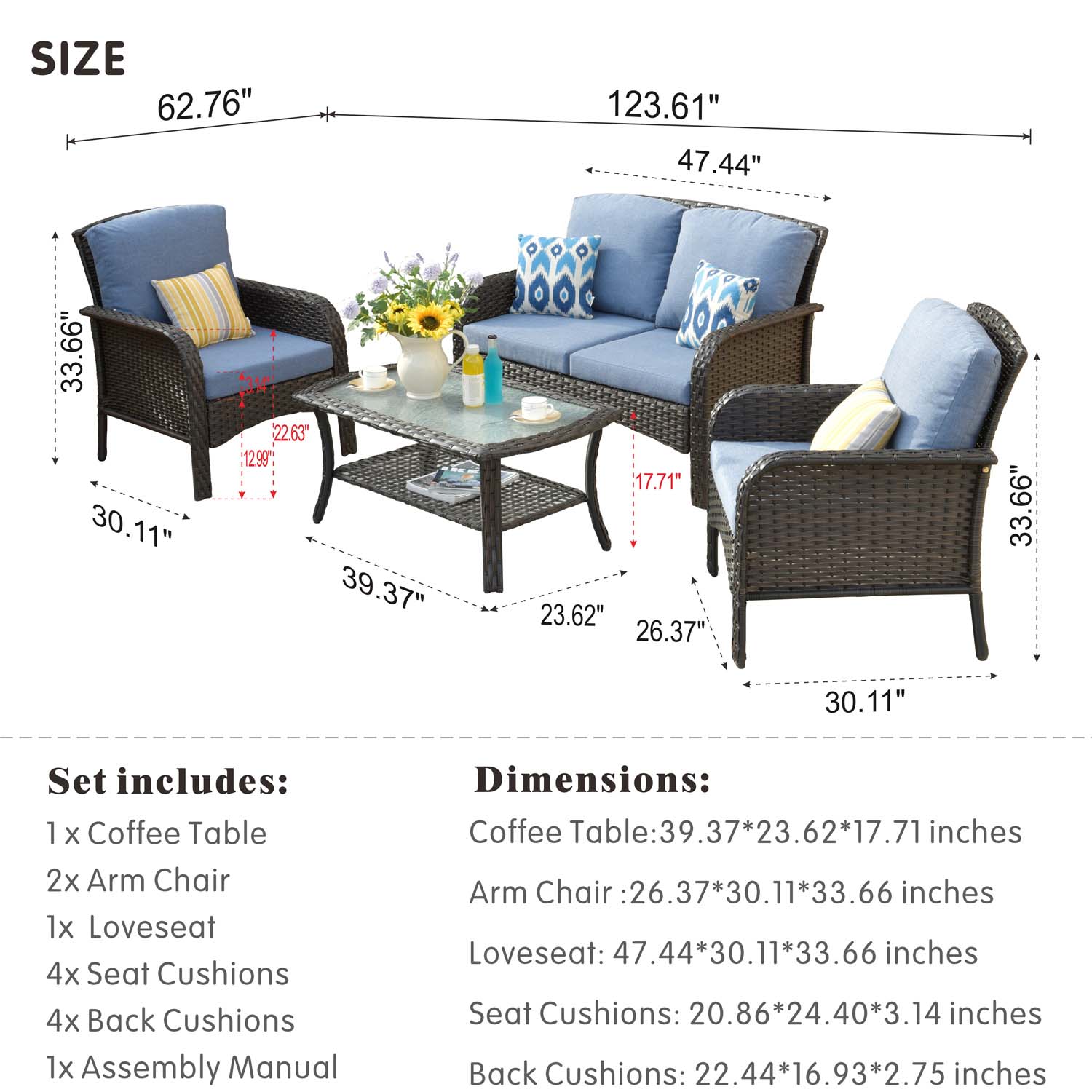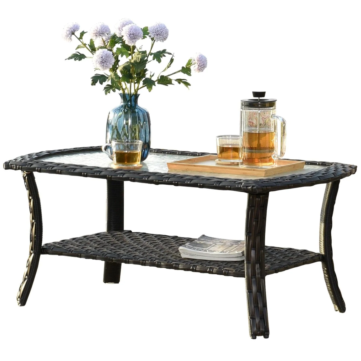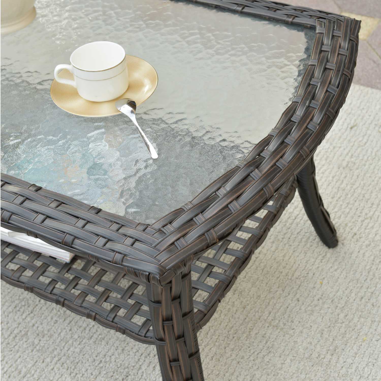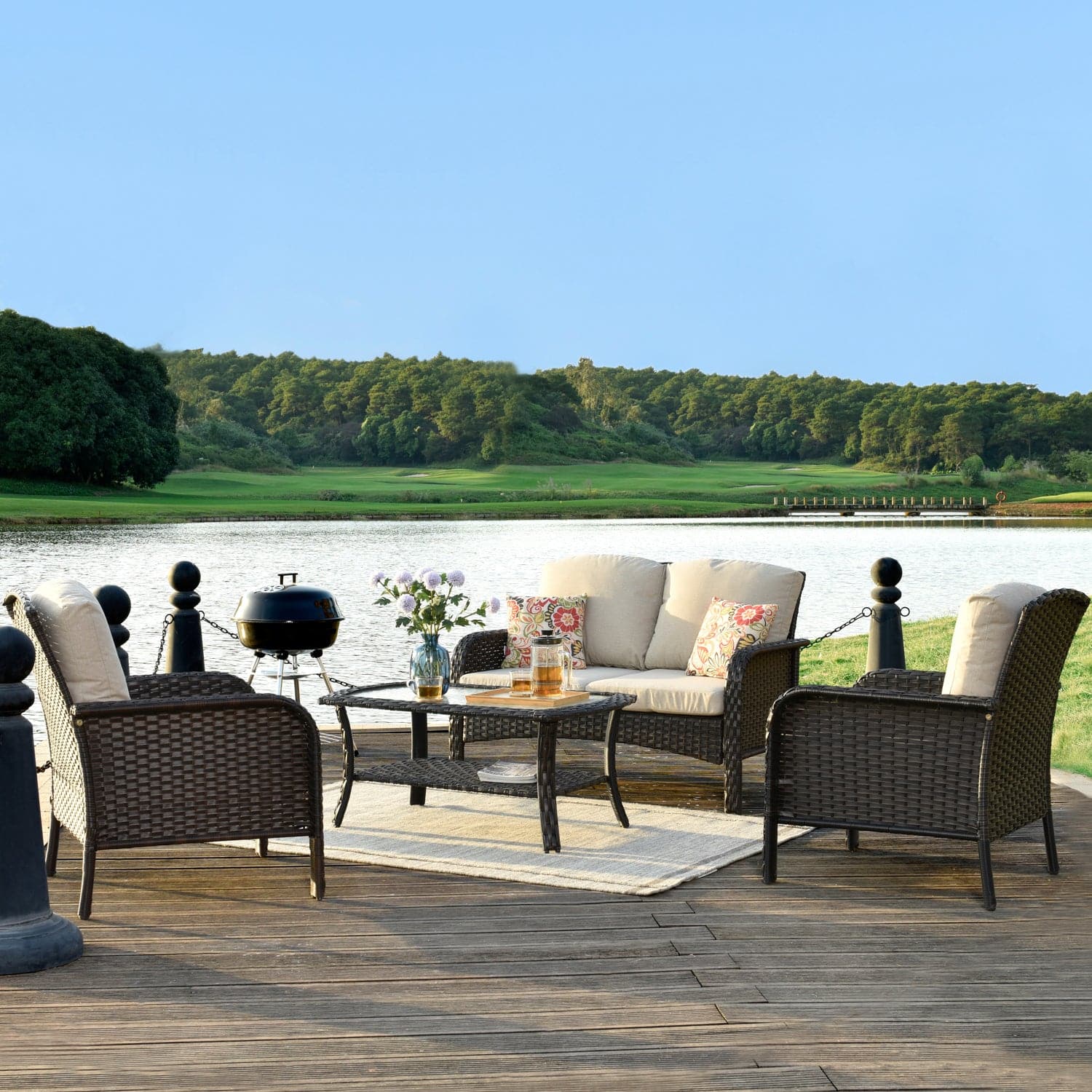 Ovios Outdoor Furniture 4 Piece High Back Brown Wicker with Cushion and Table
