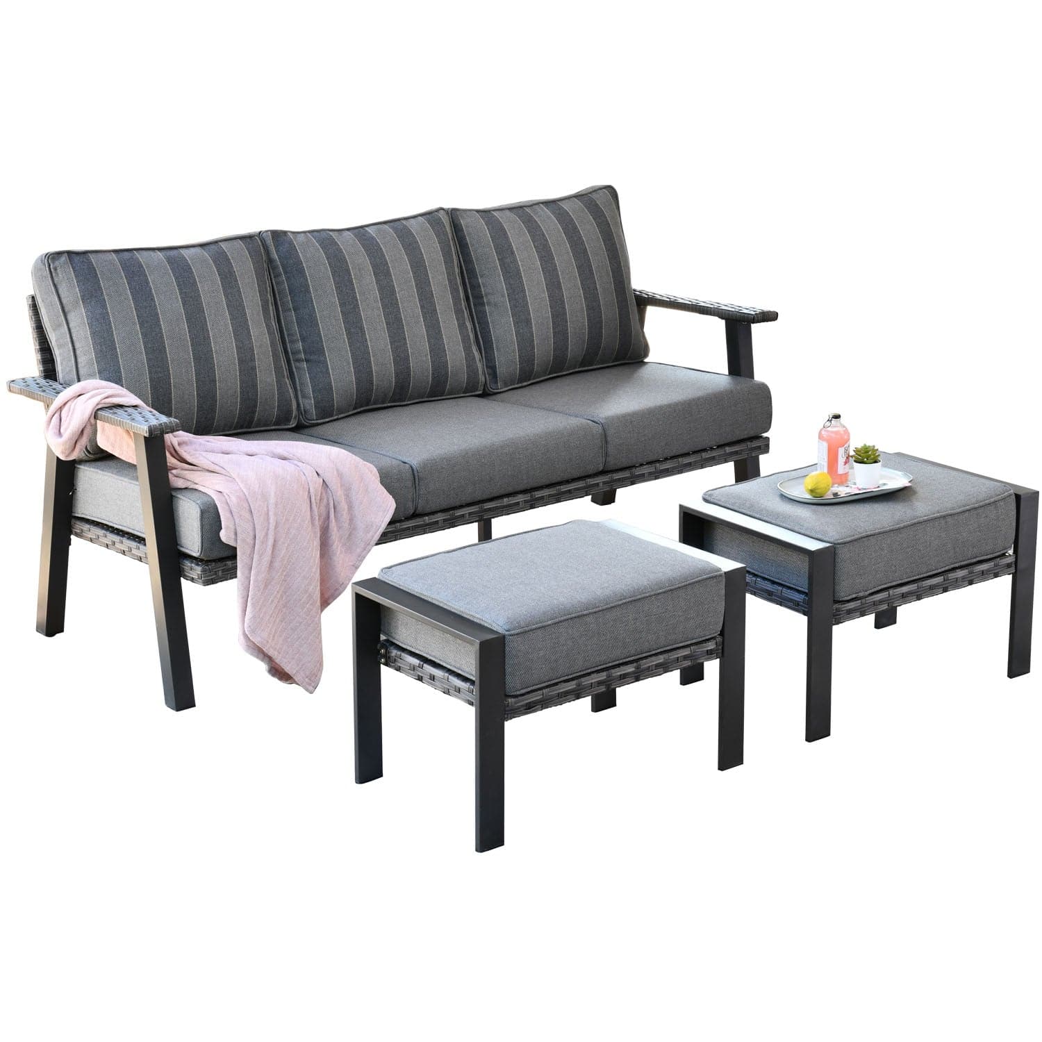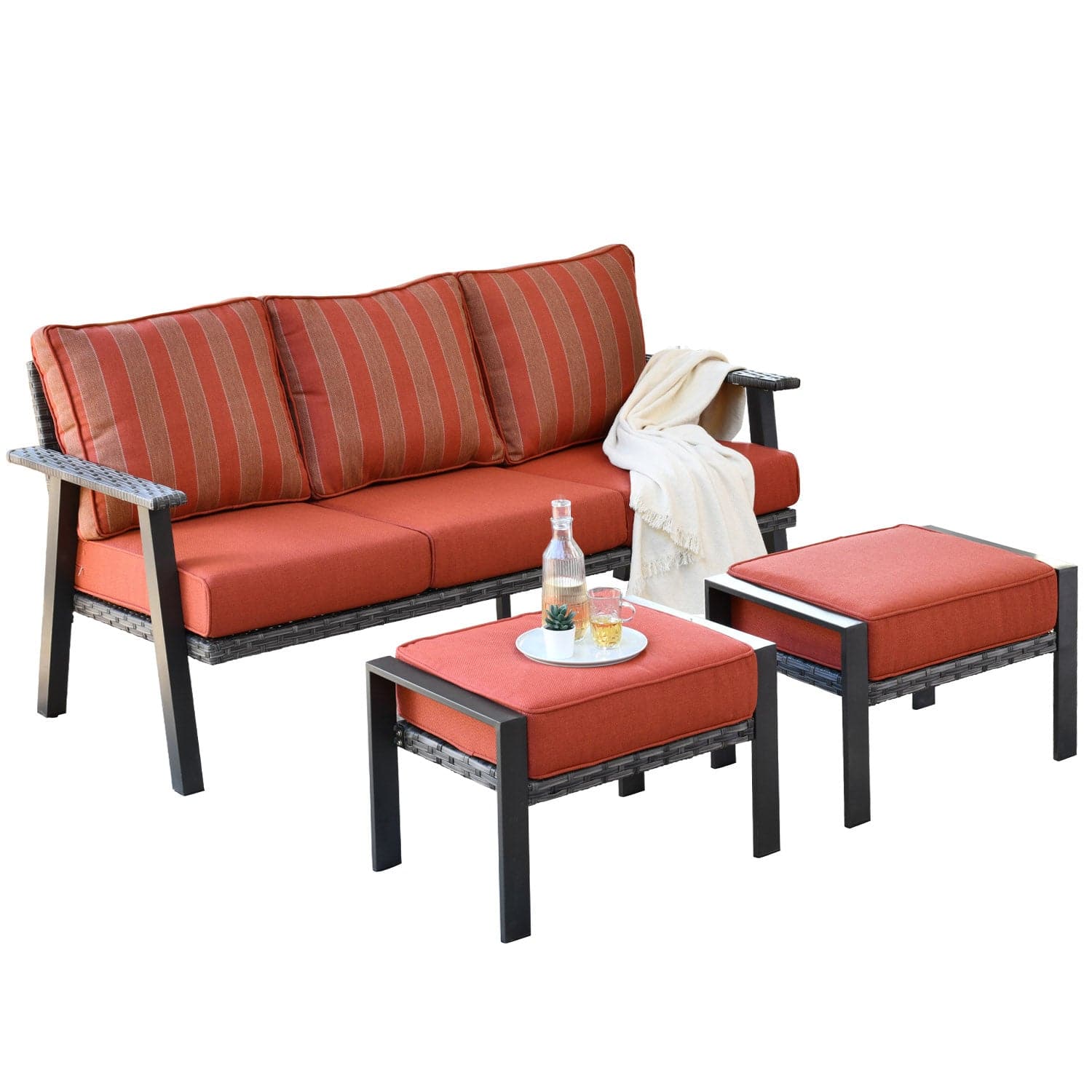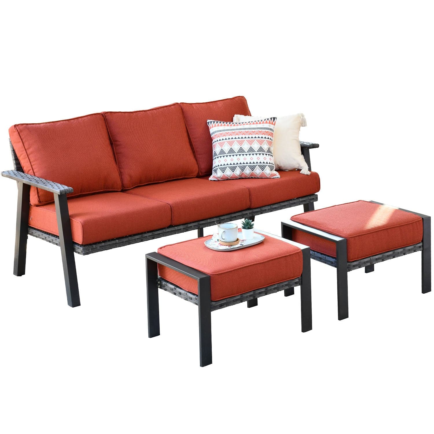 Ovios Outdoor Couch 3-Piece with Ottoman Kenard Curved Handrest