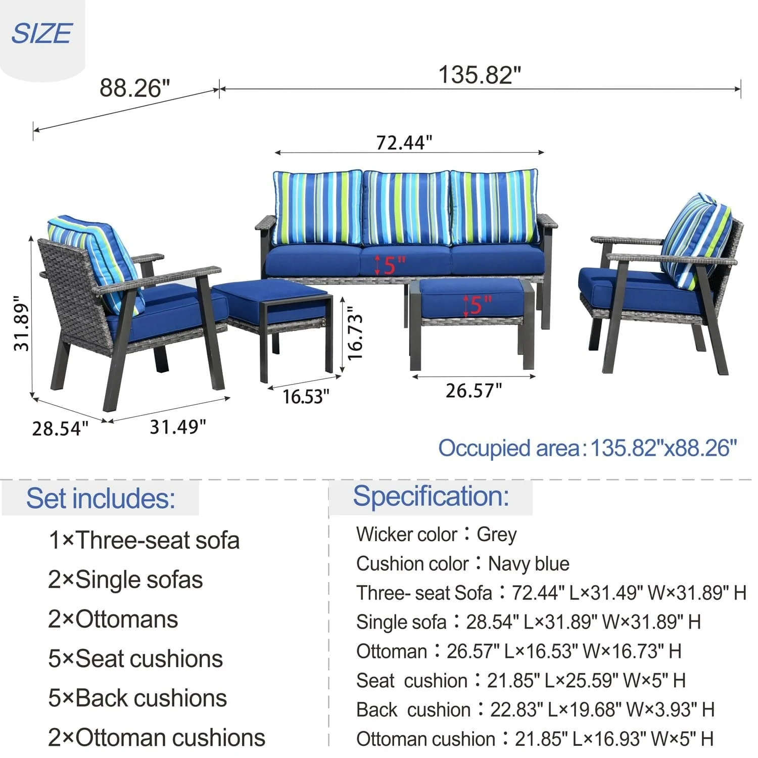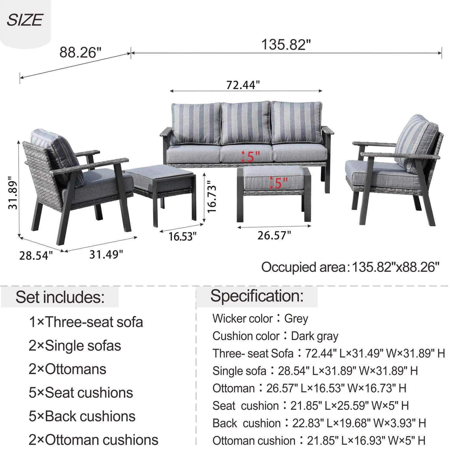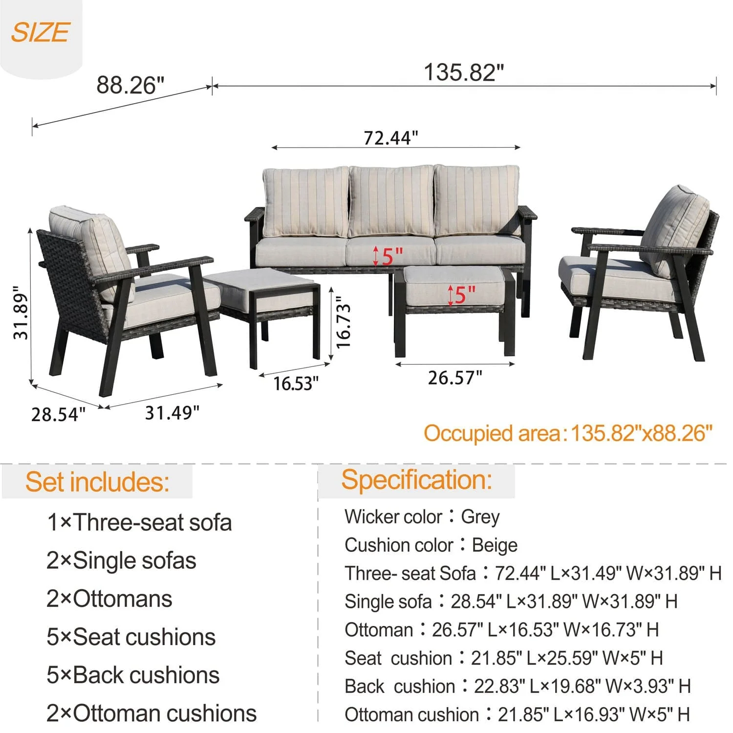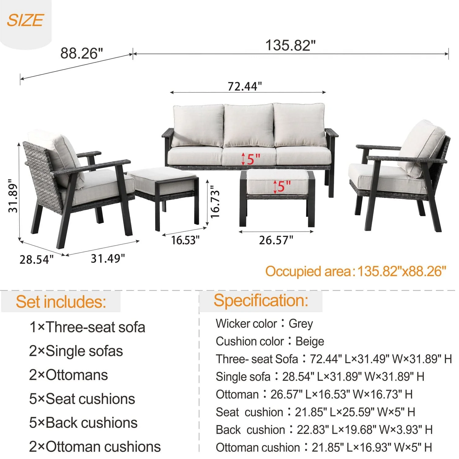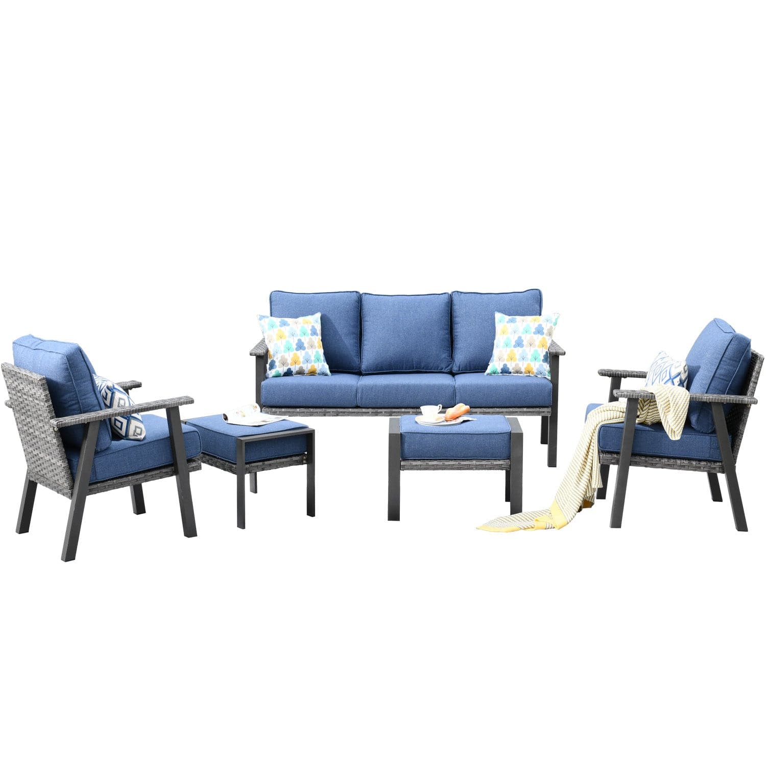 Ovios Patio Conversation Set 5 Piece with 2 Ottoman and 5'' Cushion, Olefin Fabric