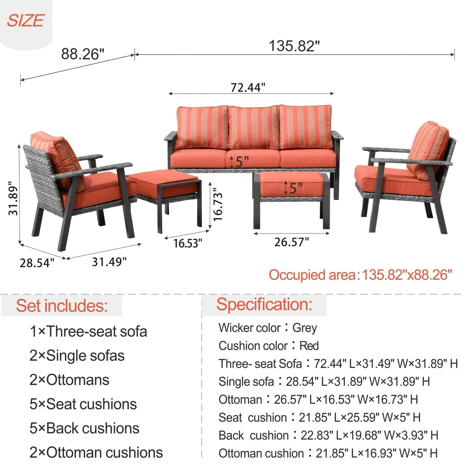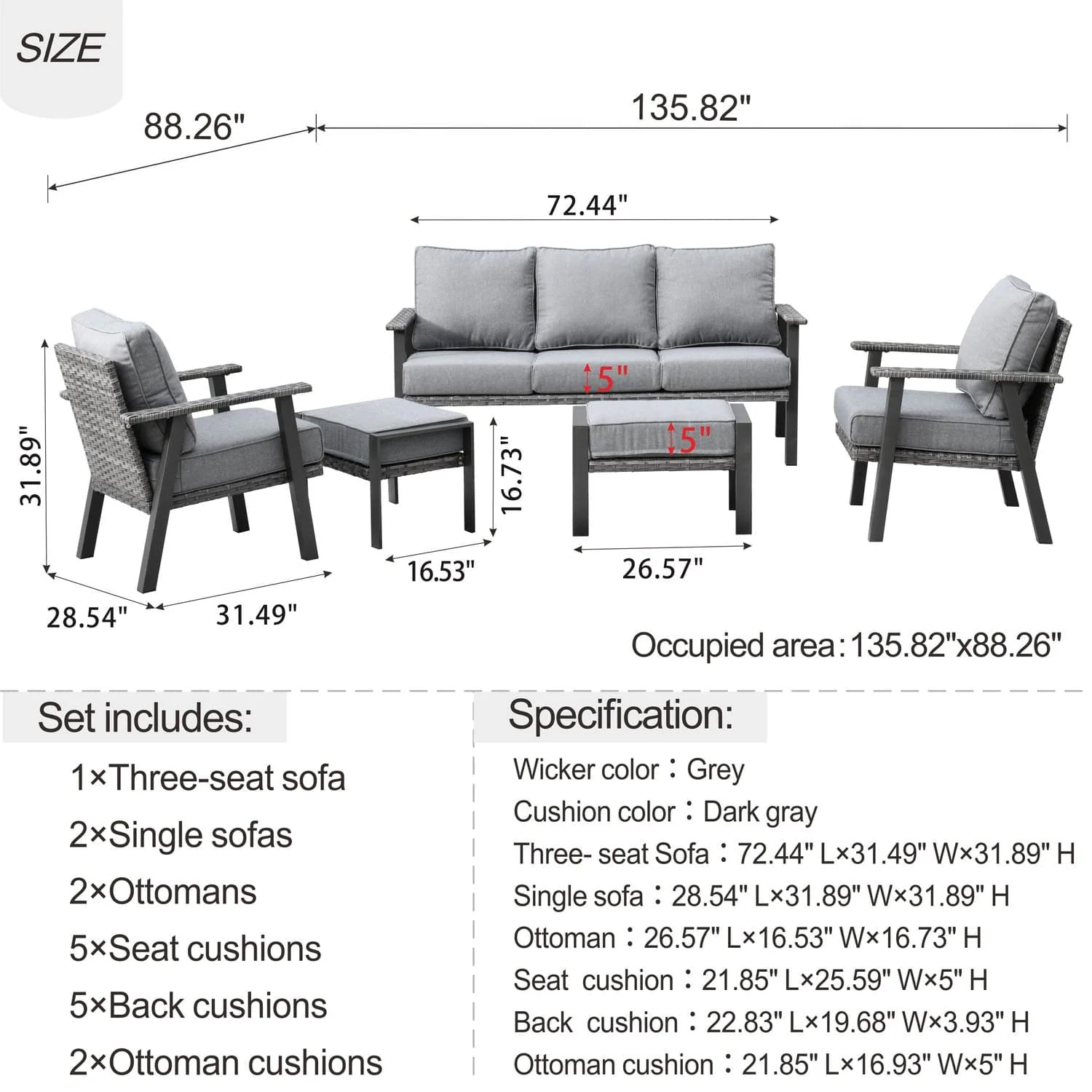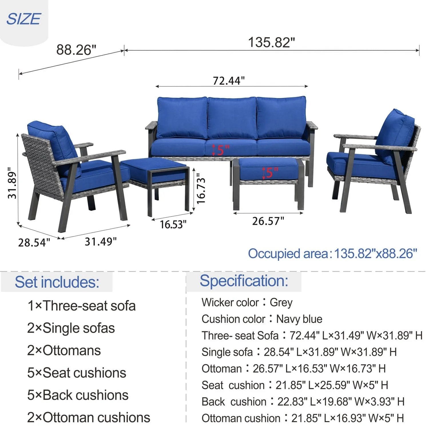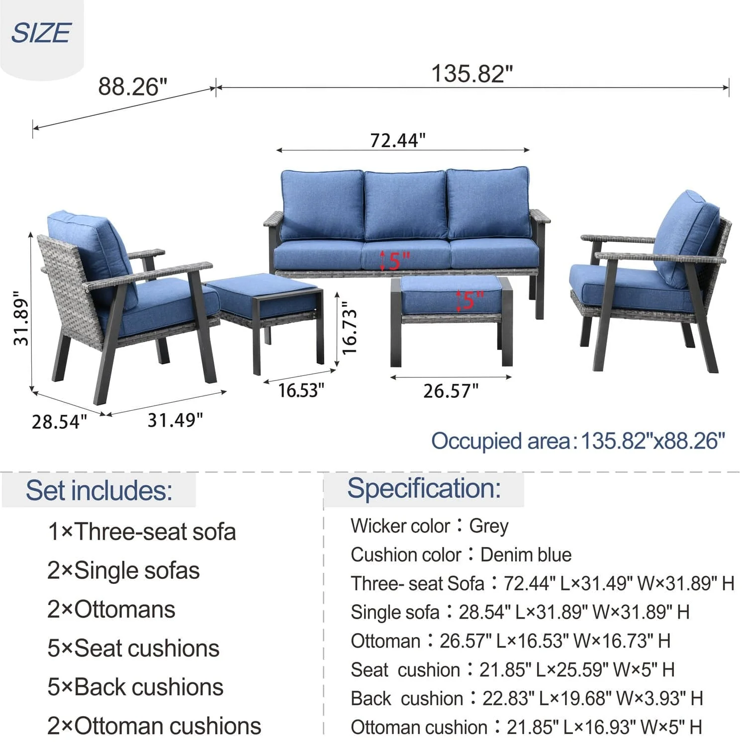 Ovios Patio Conversation Set 5 Piece with 2 Ottoman and 5'' Cushion, Olefin Fabric