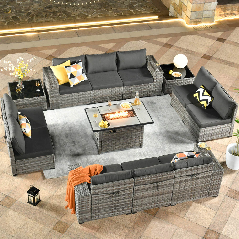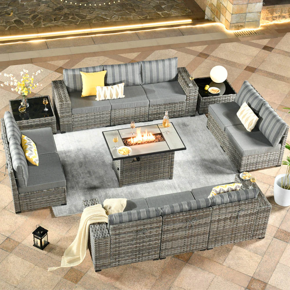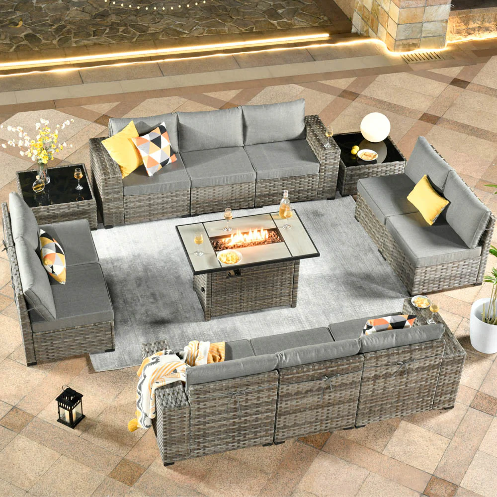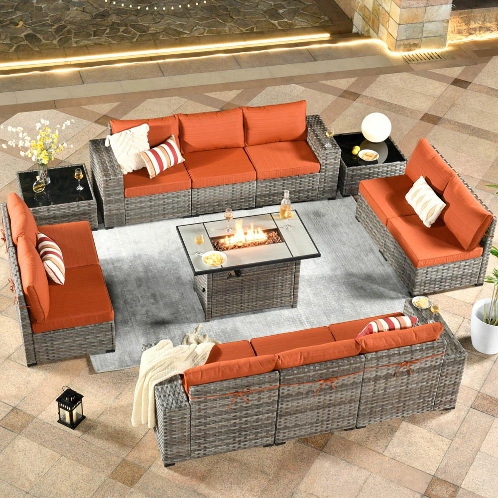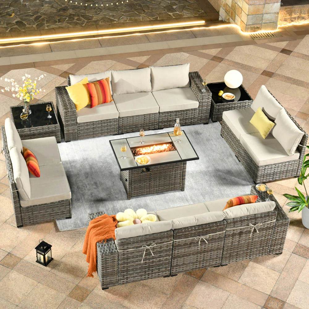 Ovios 13 Pieces Outdoor Furniture with 7.68'' Broad Handrails and Rectangle 42.12'' Fire Pit Table