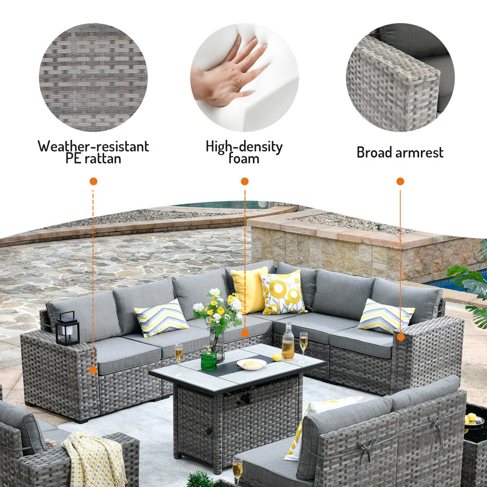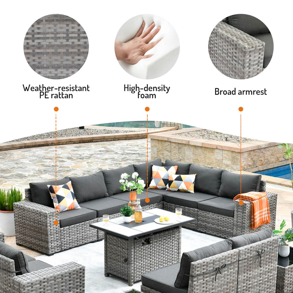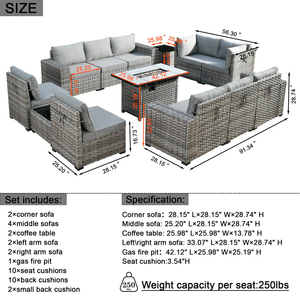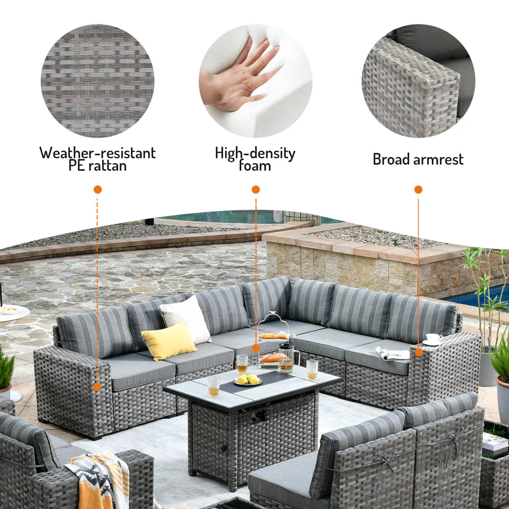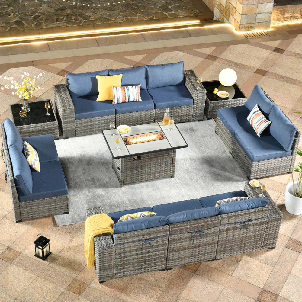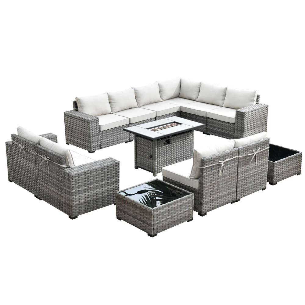 Ovios 13 Pieces Outdoor Furniture with 7.68'' Broad Handrails and Rectangle 42.12'' Fire Pit Table