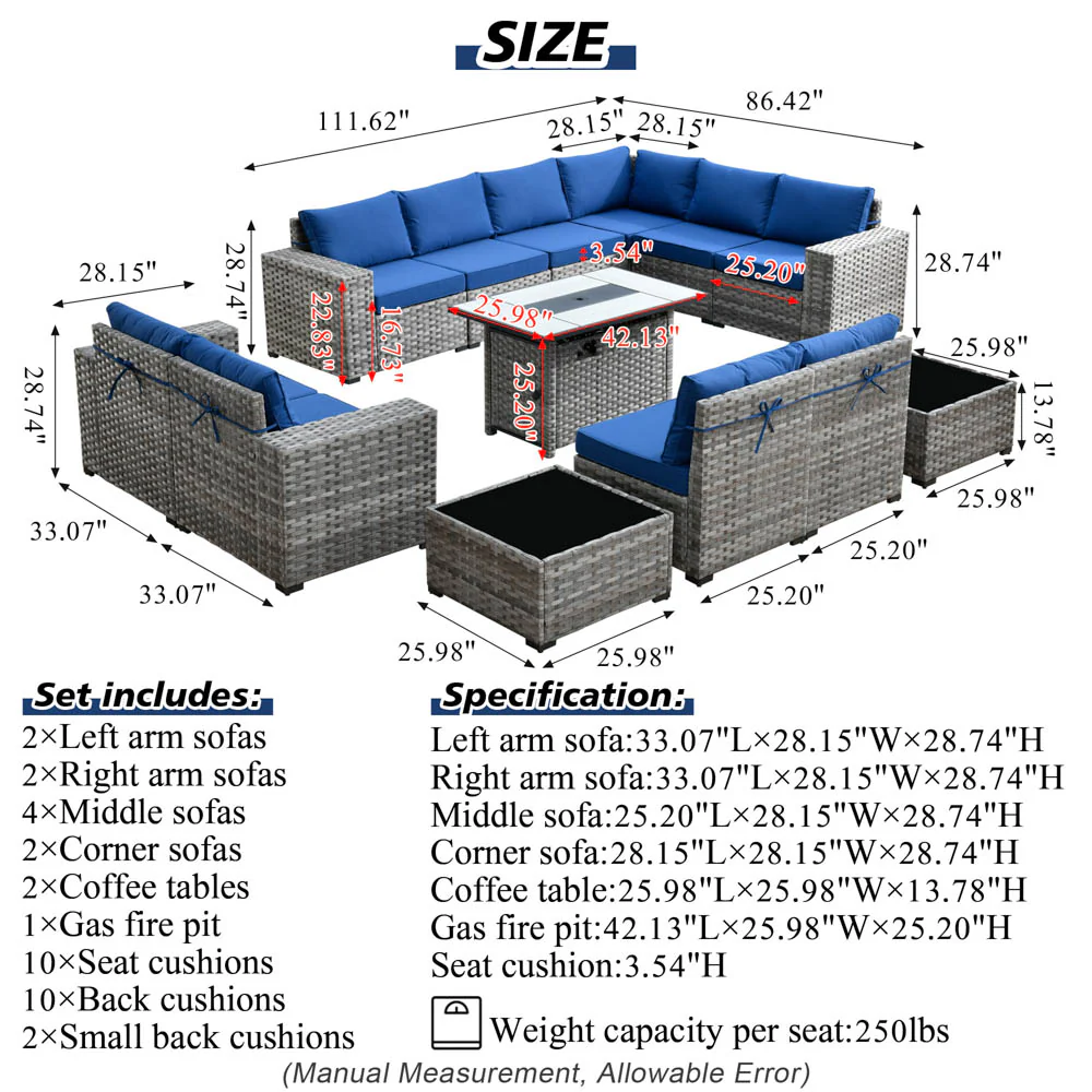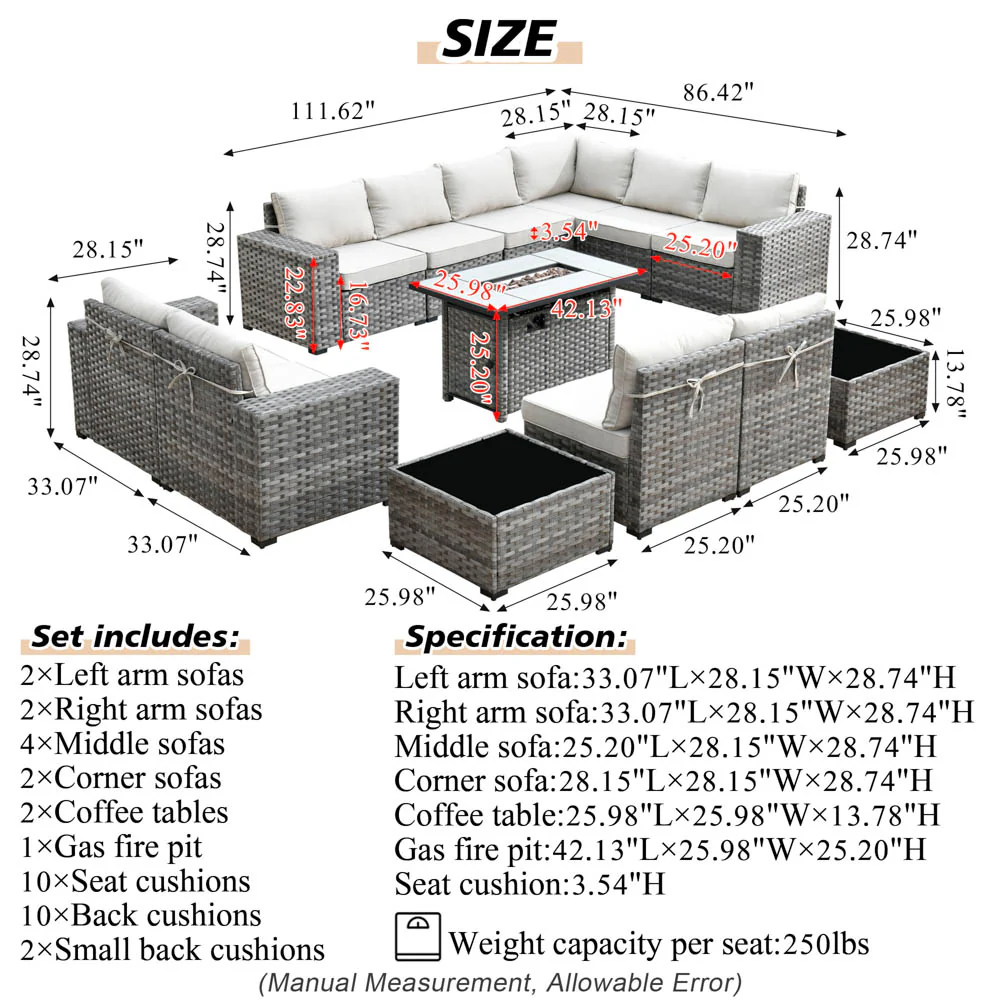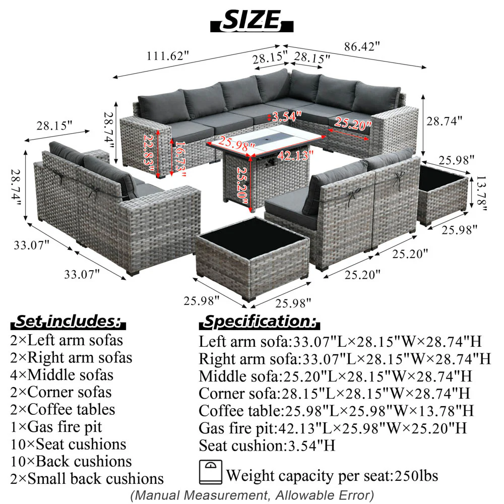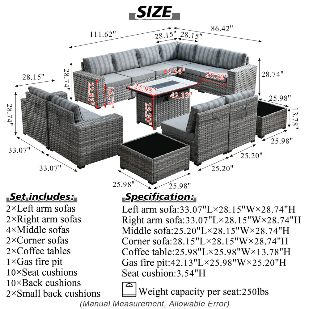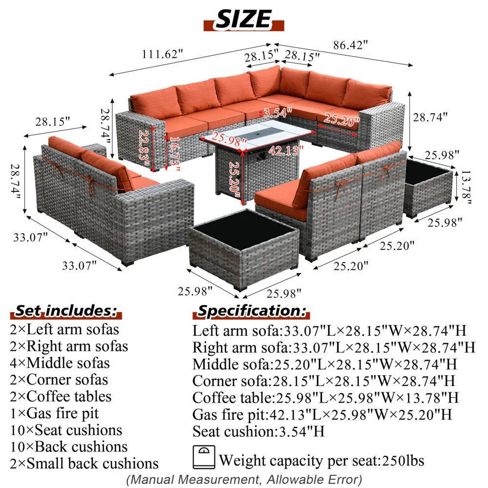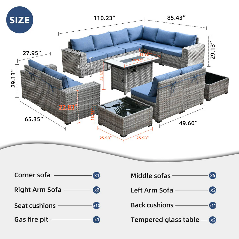Ovios 13 Pieces Outdoor Furniture with 7.68'' Broad Handrails and Rectangle 42.12'' Fire Pit Table