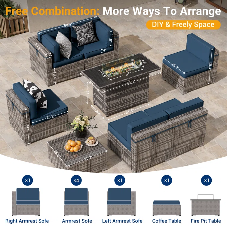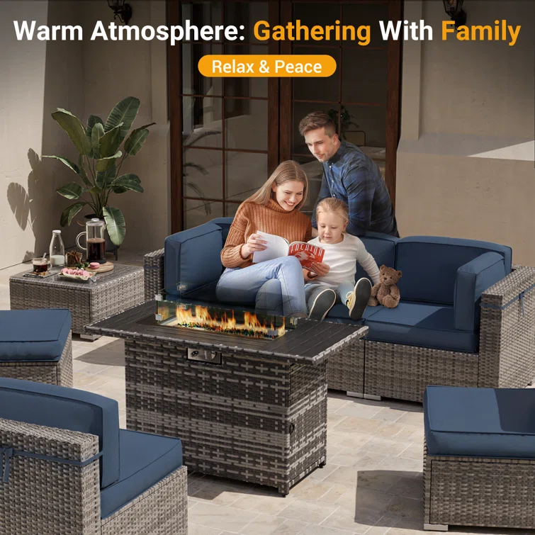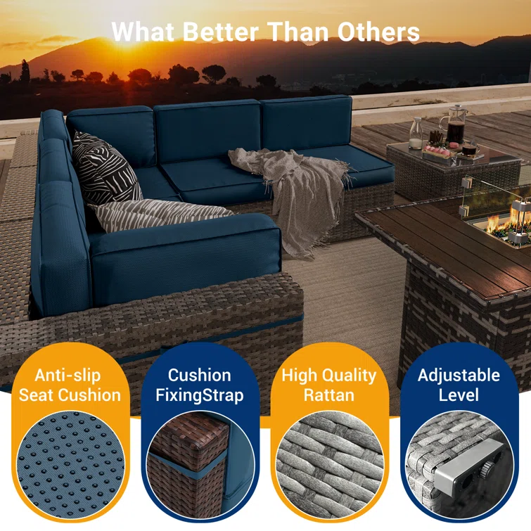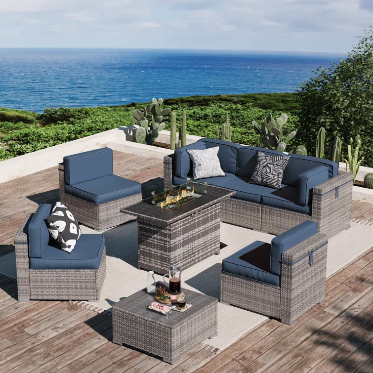 Mecayla 8 Piece Fire Pit & Rattan Sectional Seating Group with Cushions