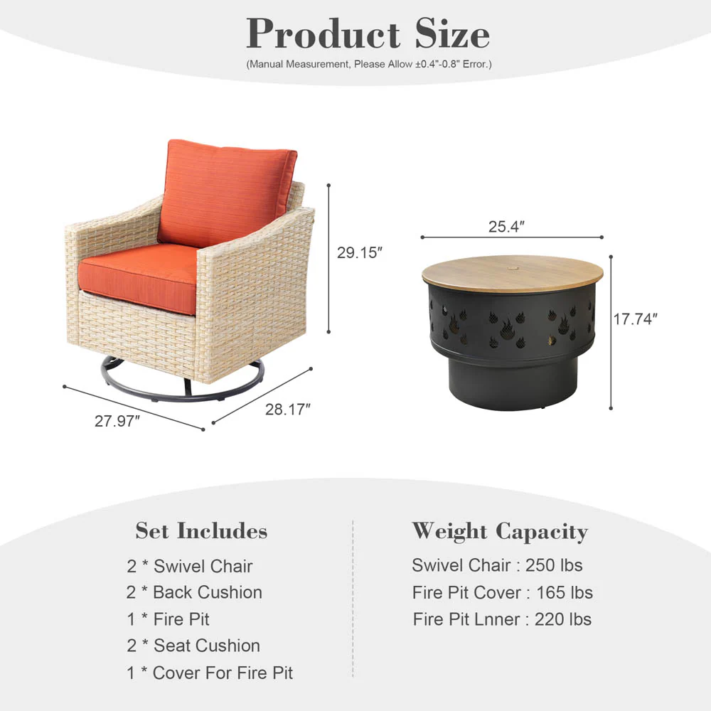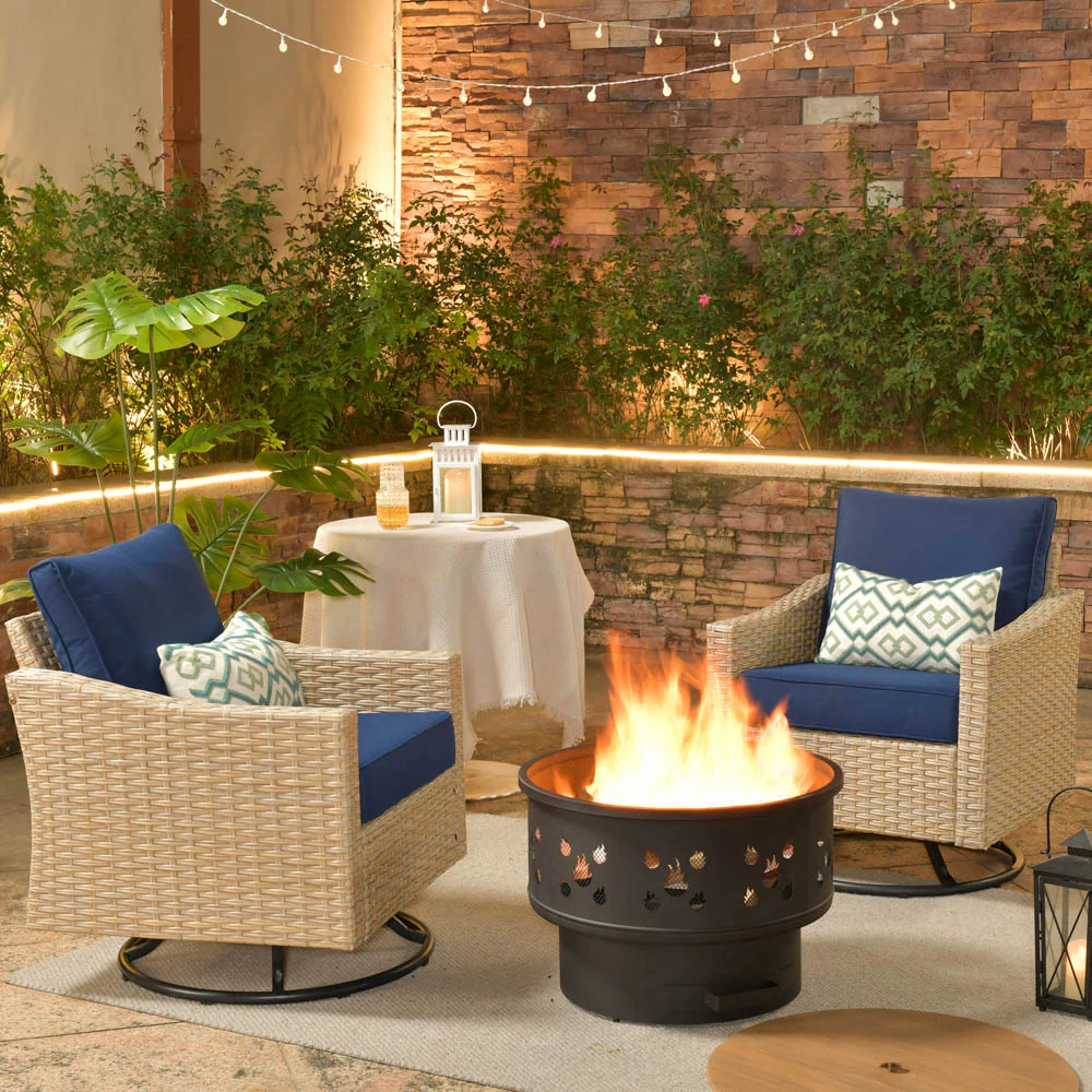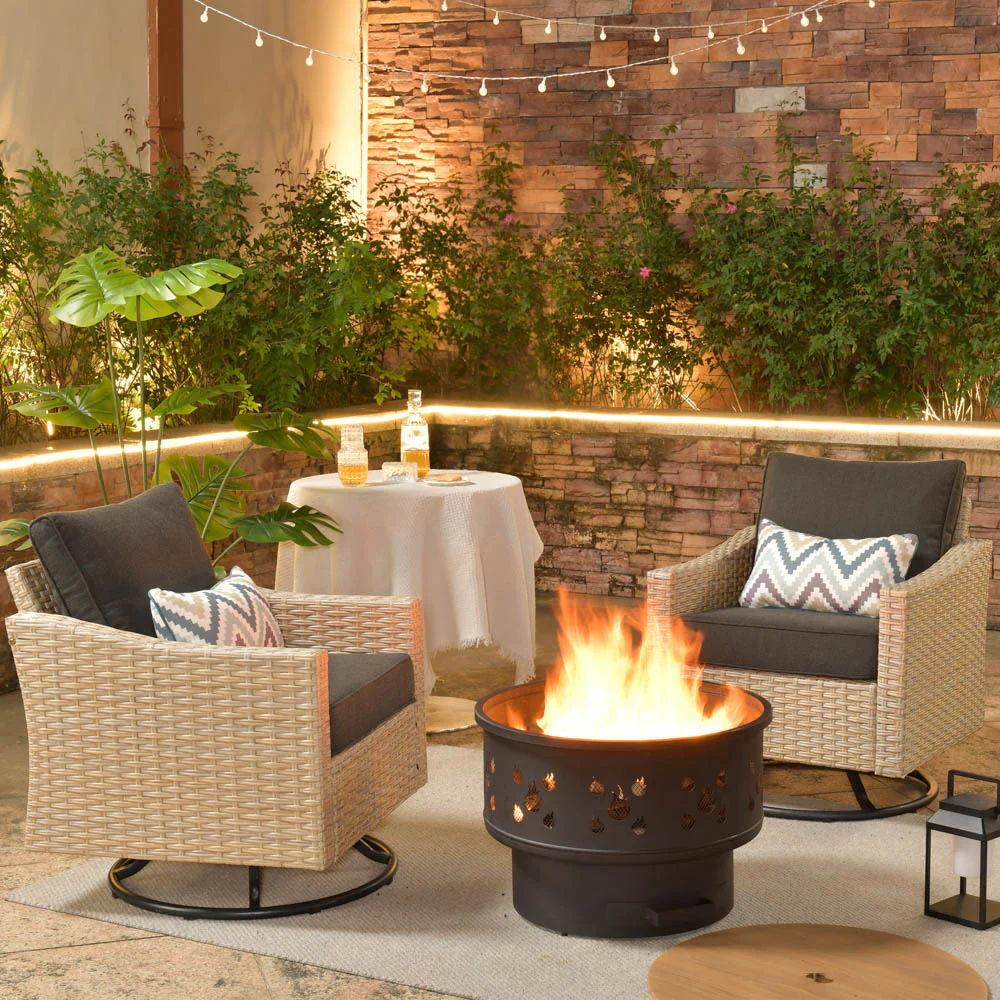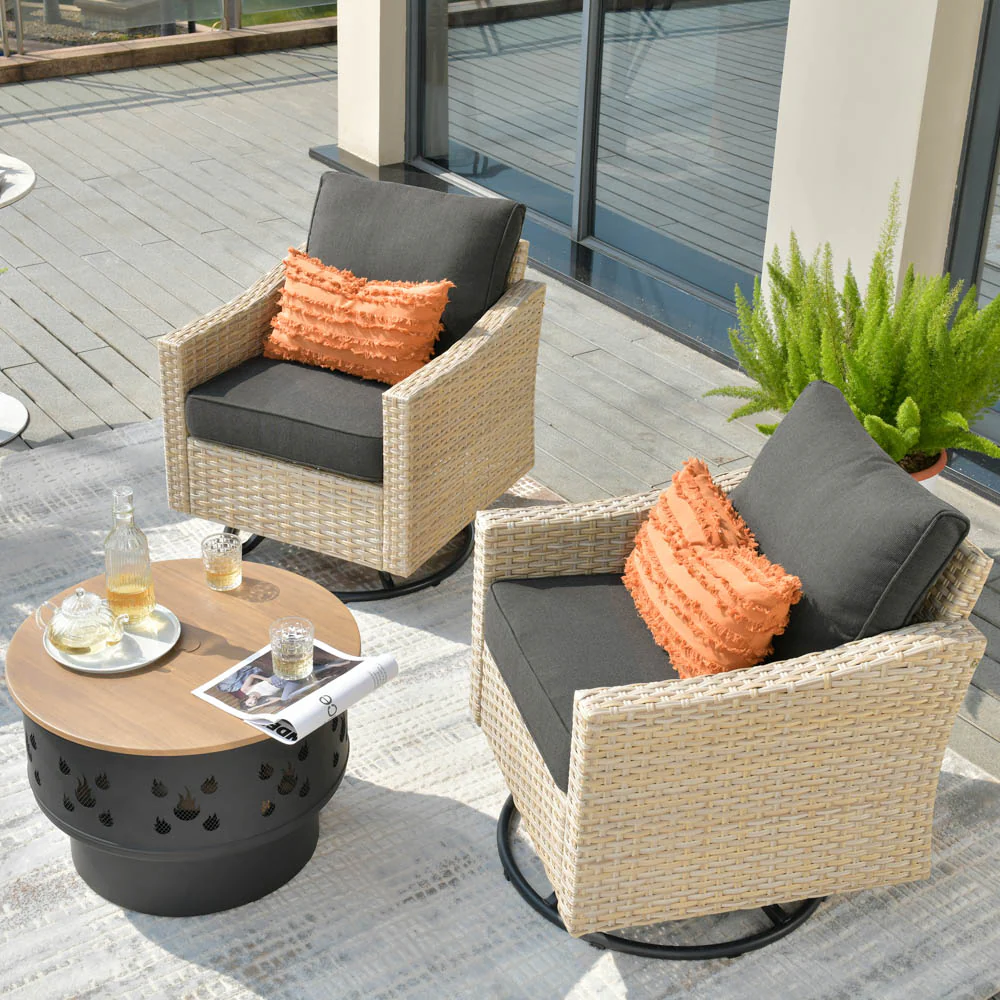 Ovios Athena Series Outdoor Patio Furniture 3-Piece Set with Fire Pit Swivel Chair