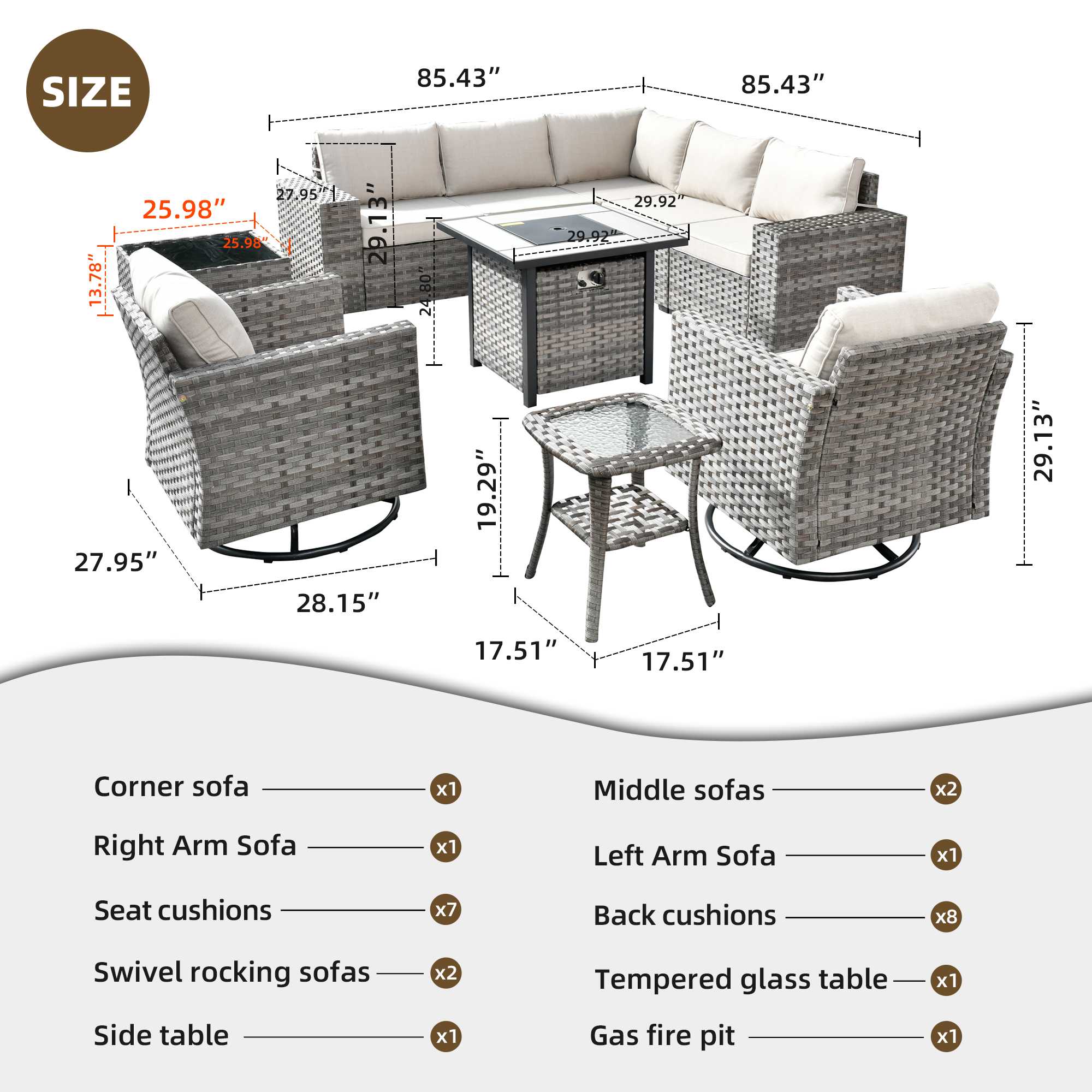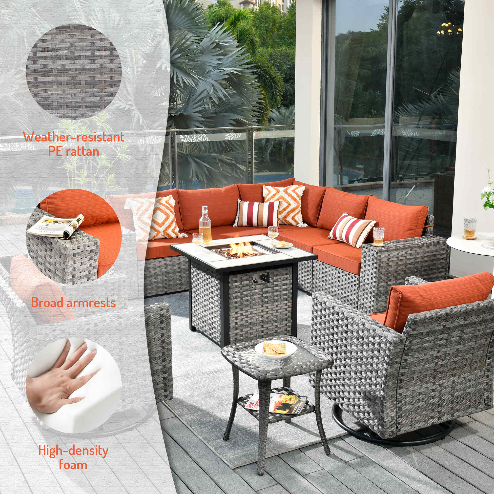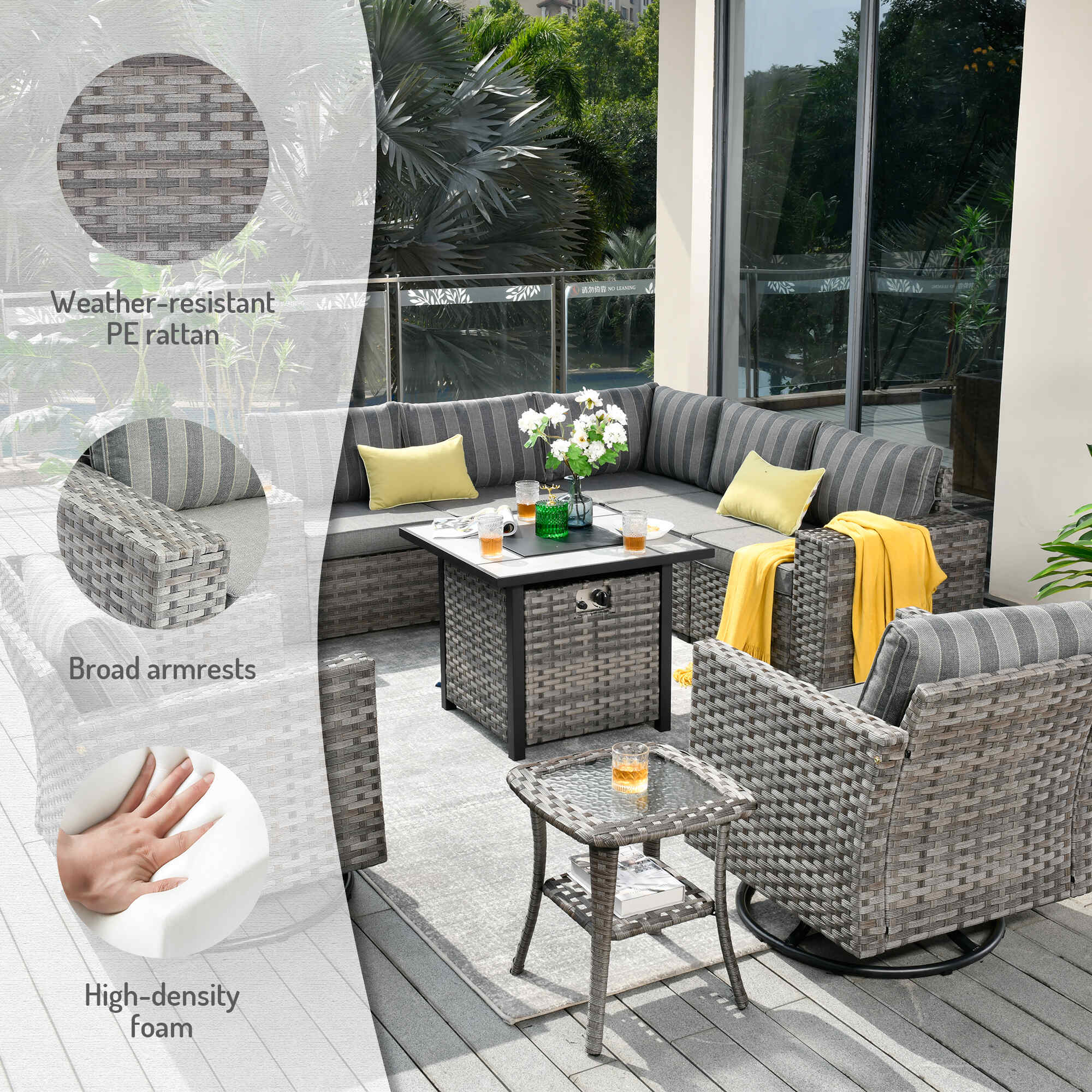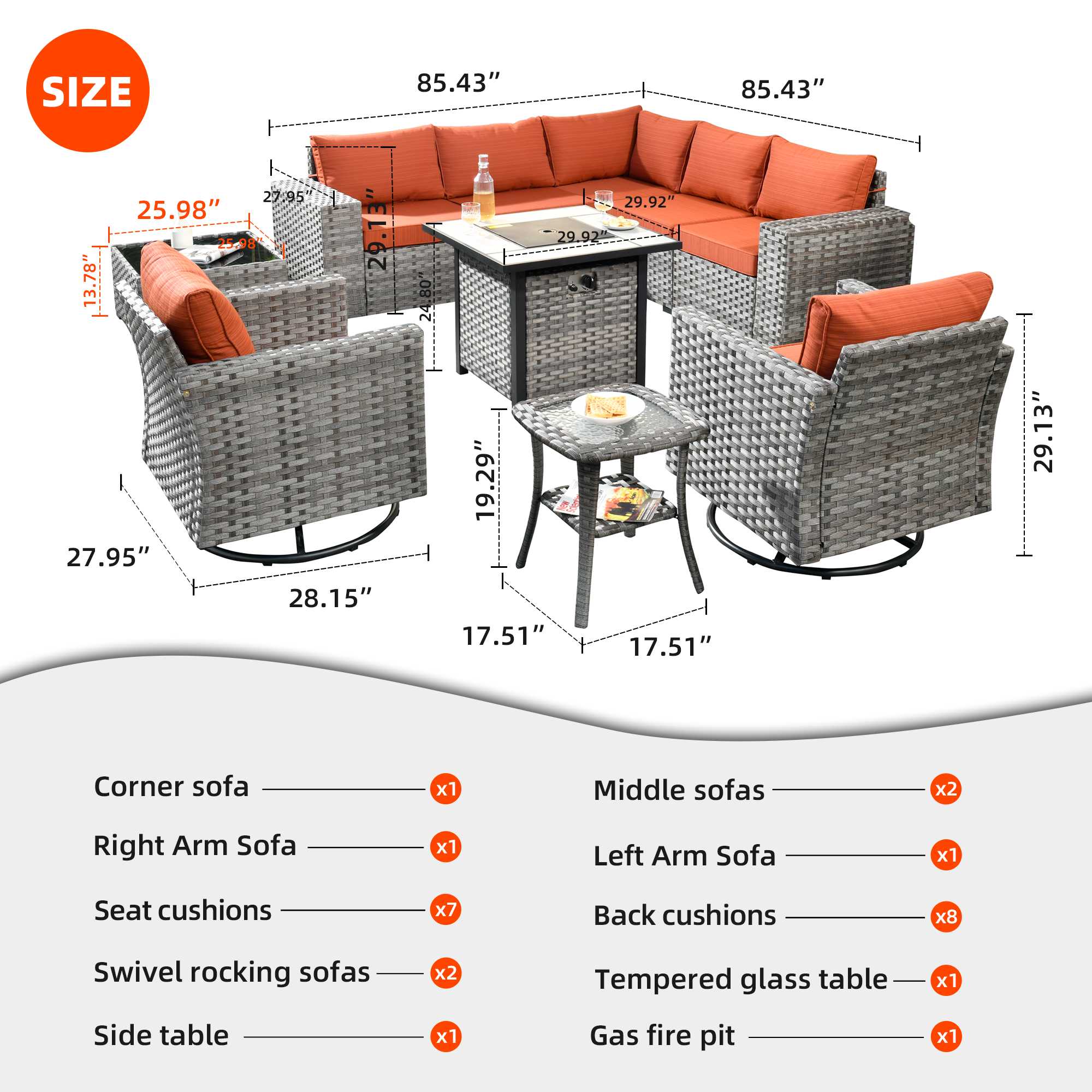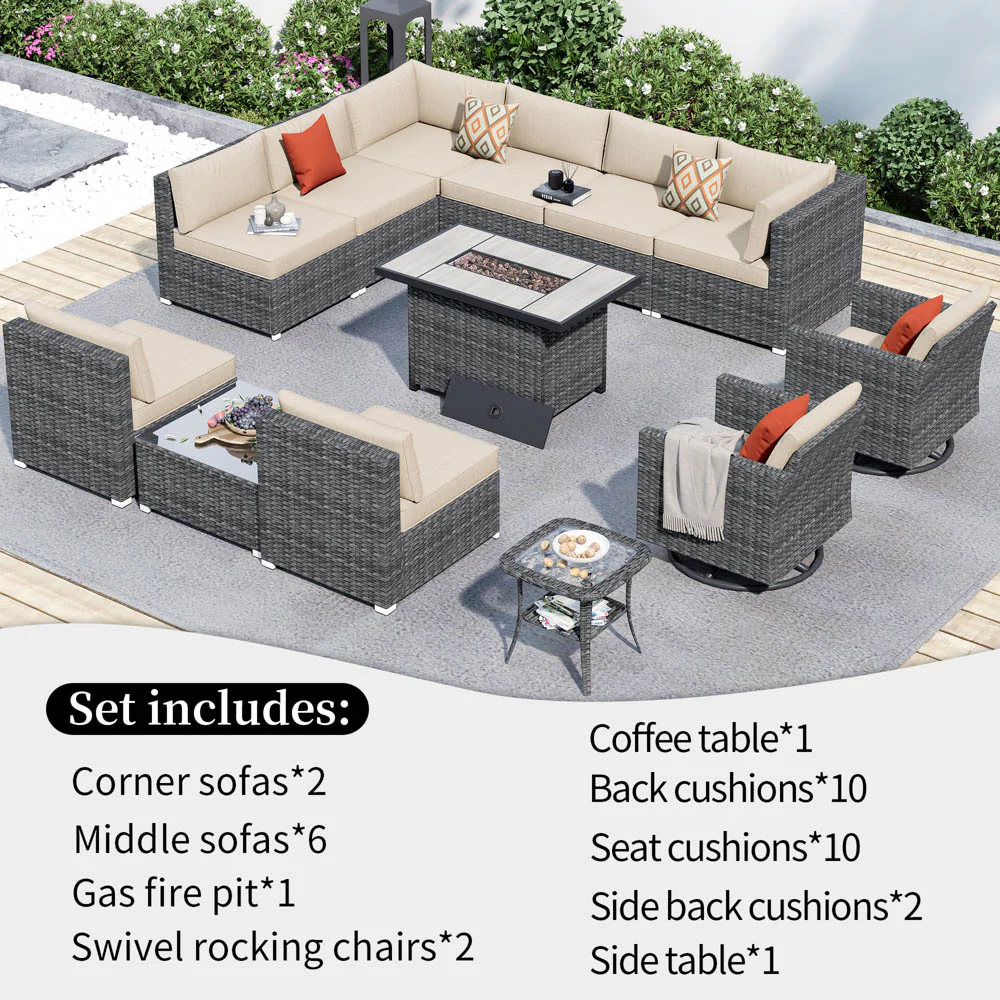 Ovios Patio Furniture 13-Piece Outdoor Sectional Sofa Set with Wicker Rocking Swivel Chairs and 42.12'' Fire Pit