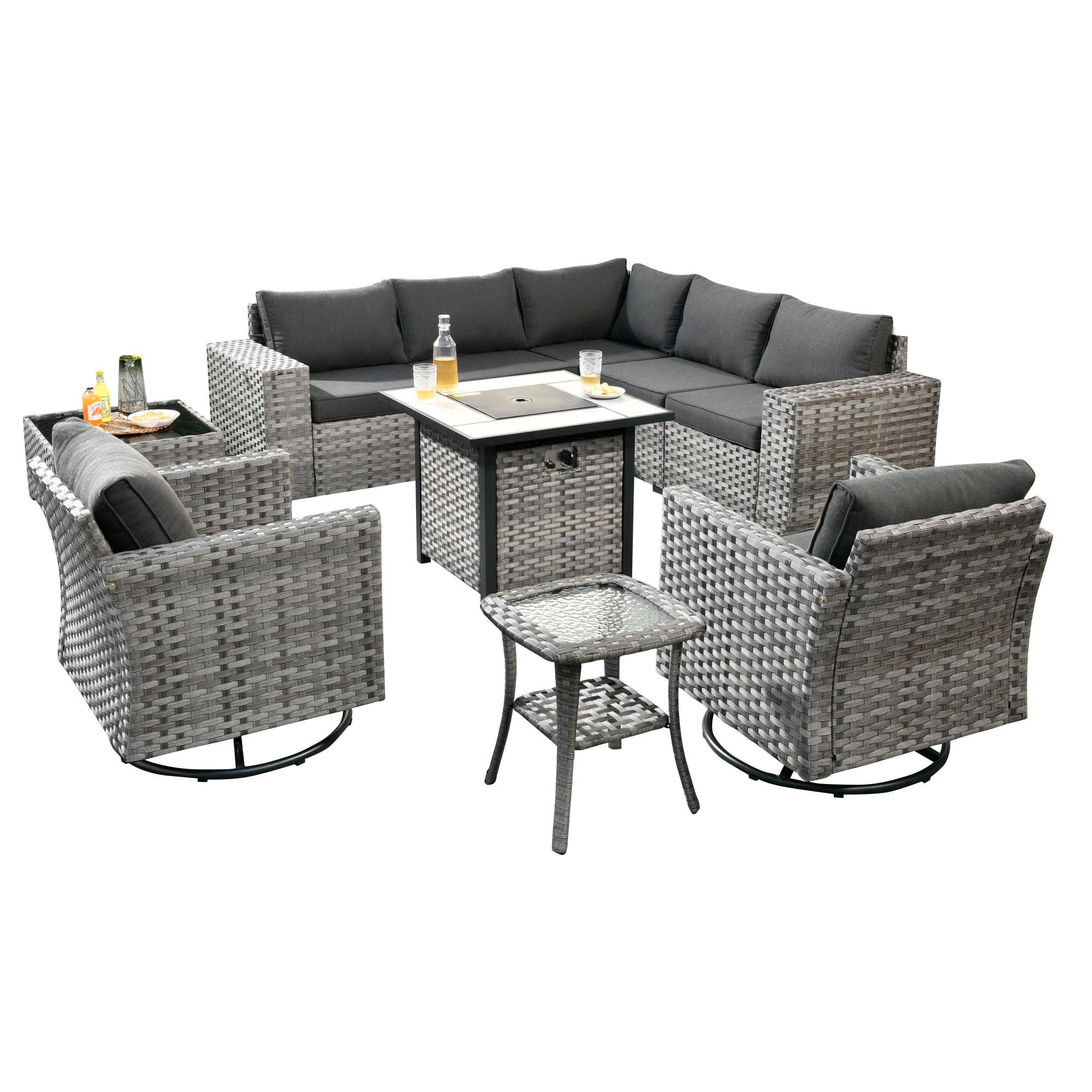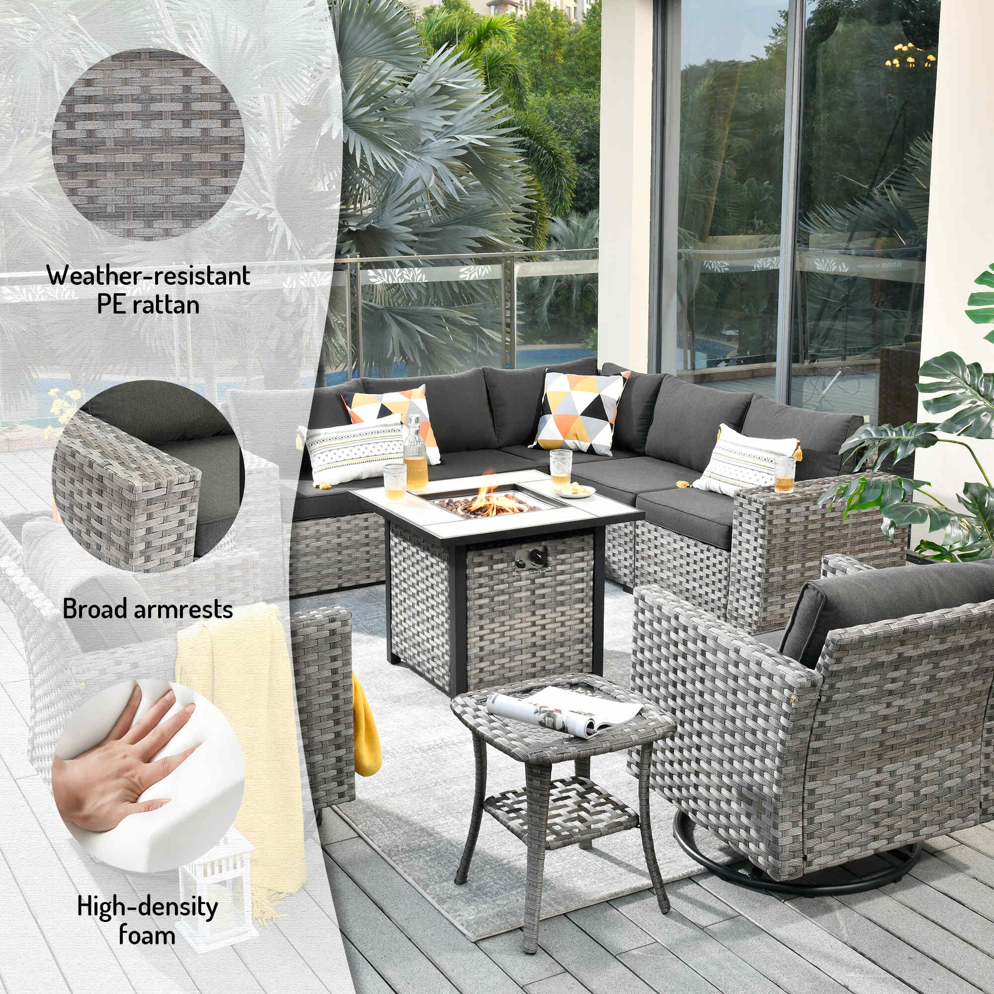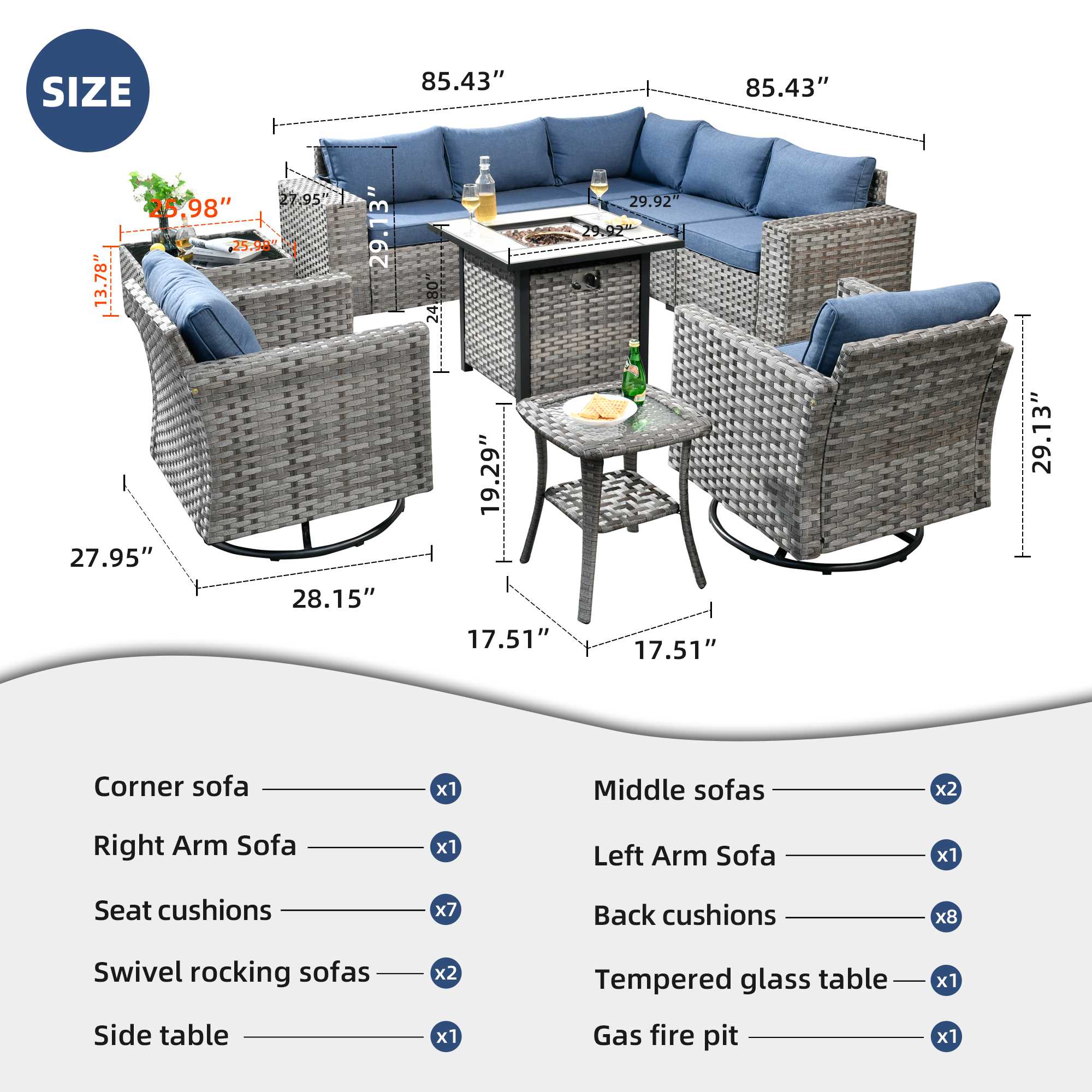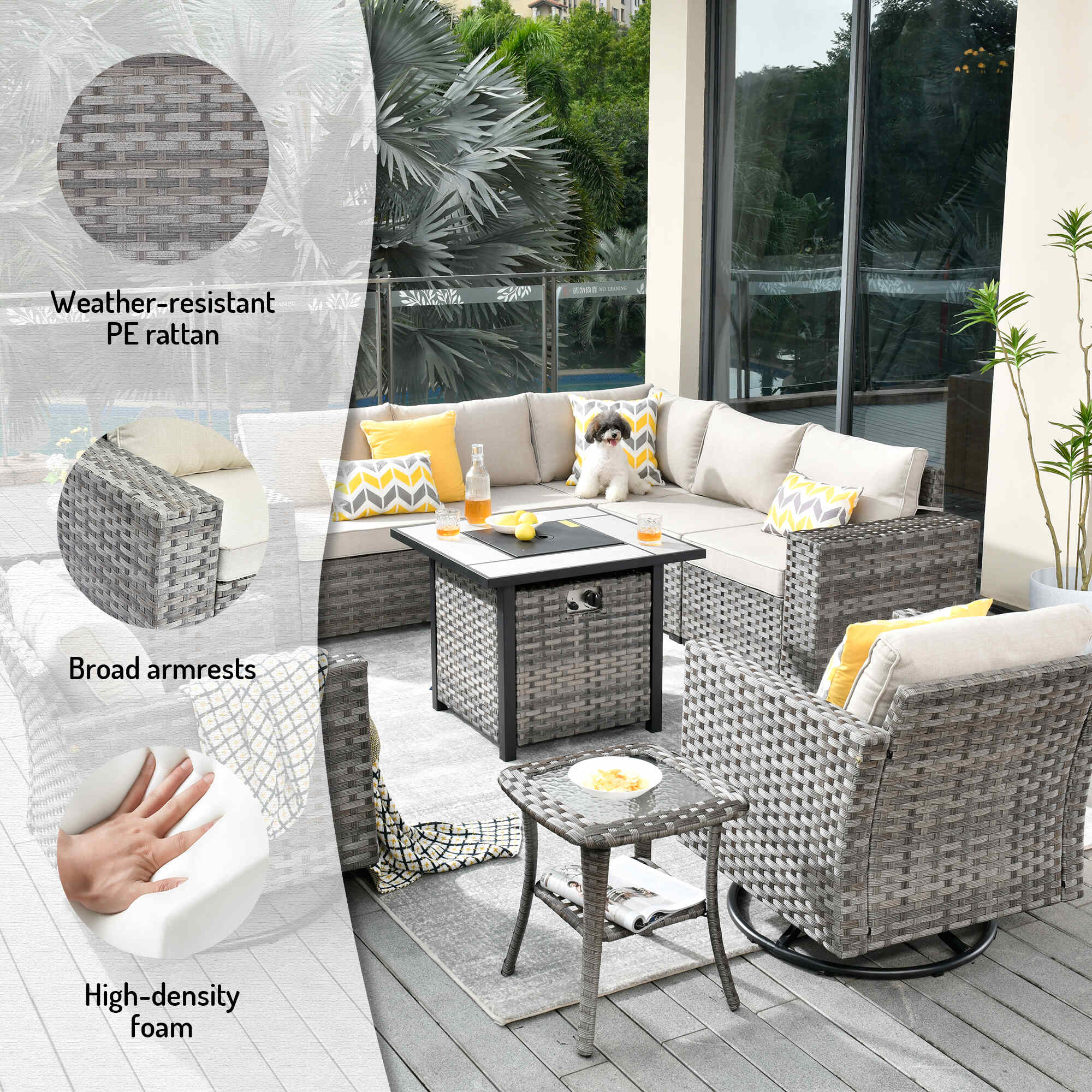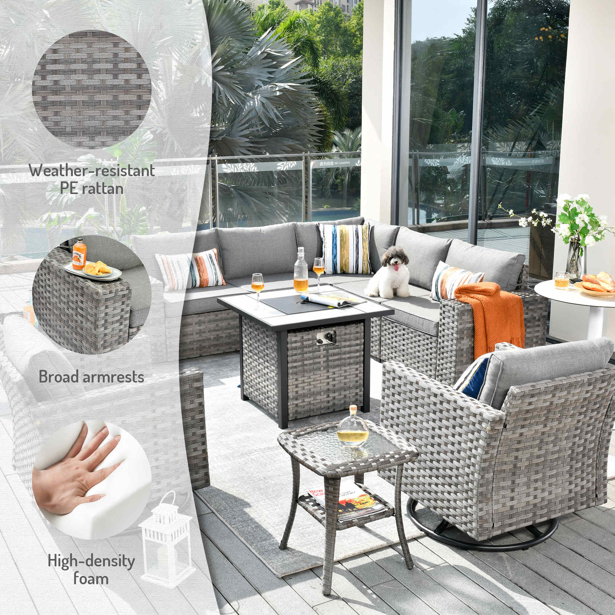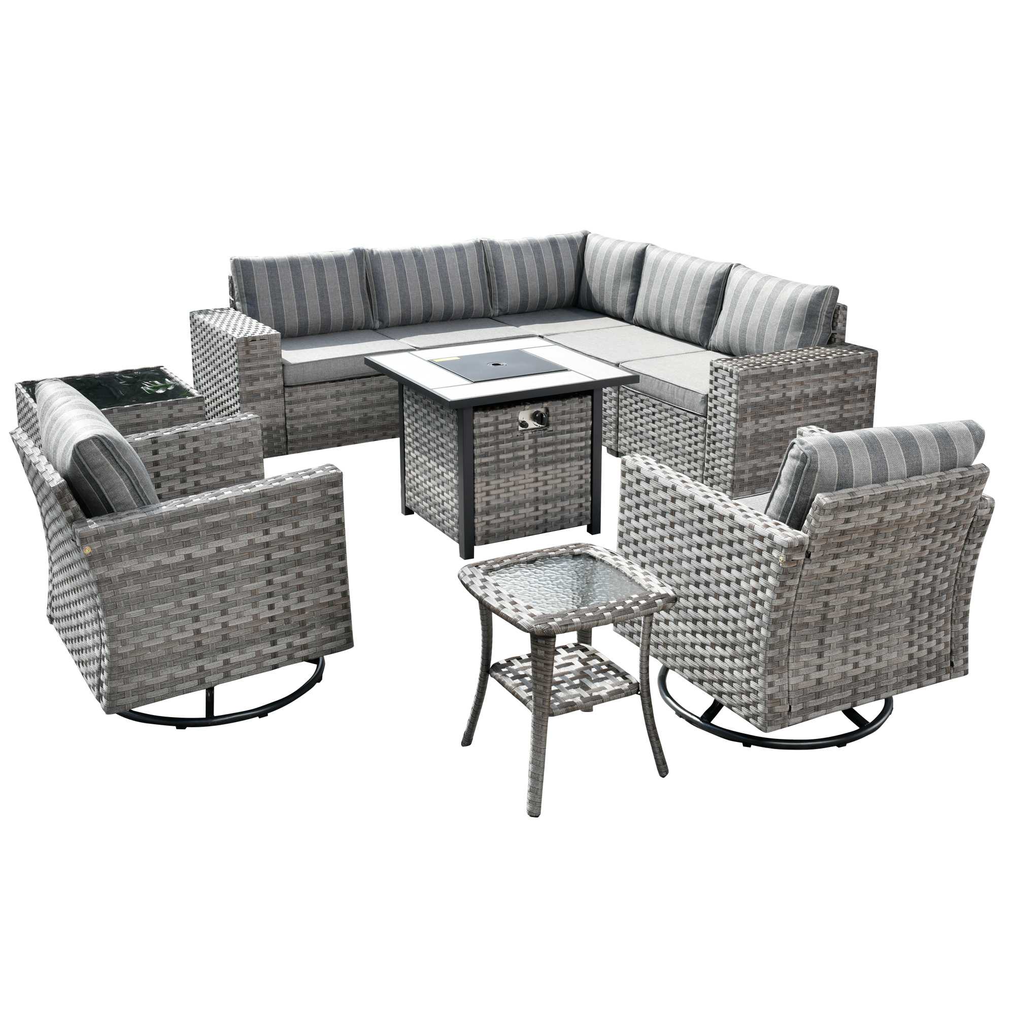 Ovios Patio Furniture 13-Piece Outdoor Sectional Sofa Set with Wicker Rocking Swivel Chairs and 42.12'' Fire Pit
