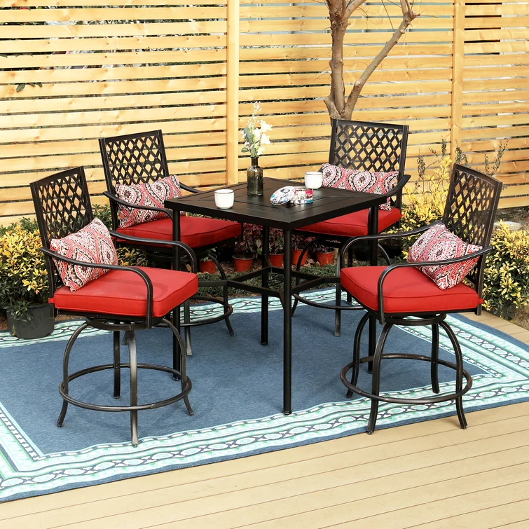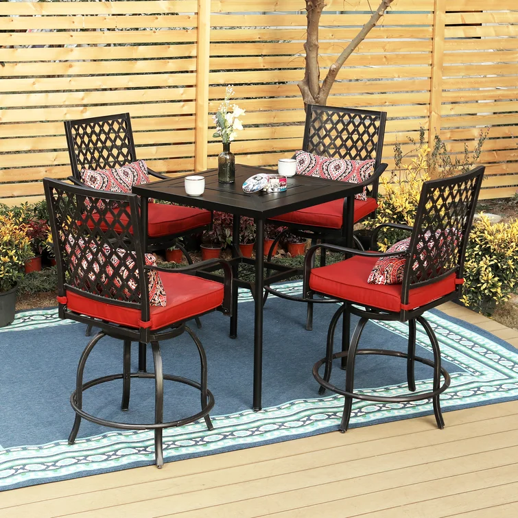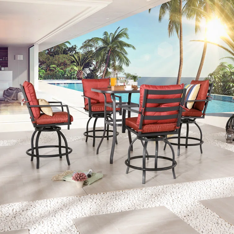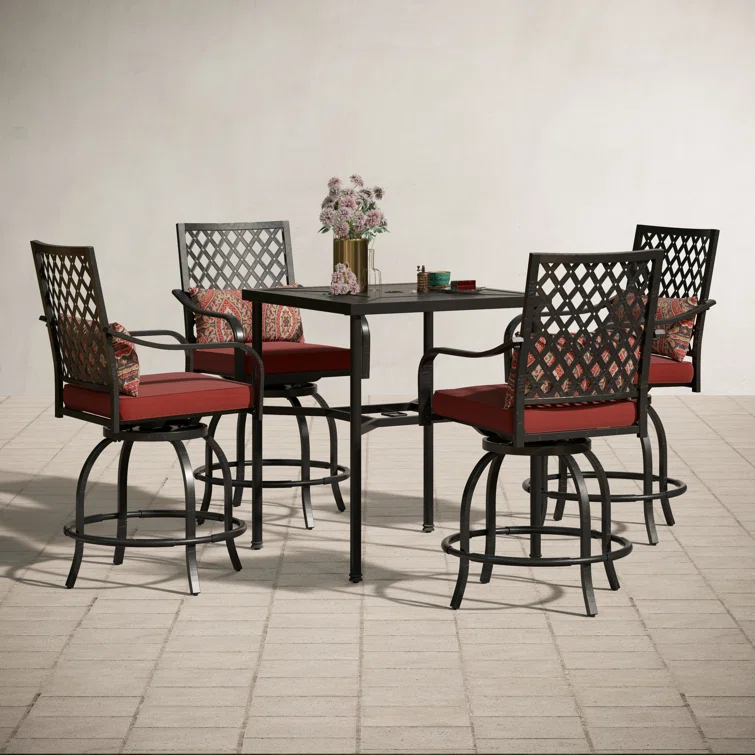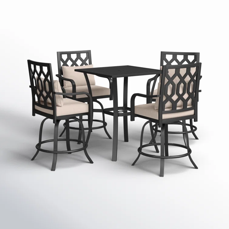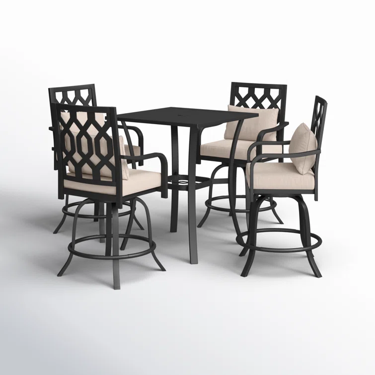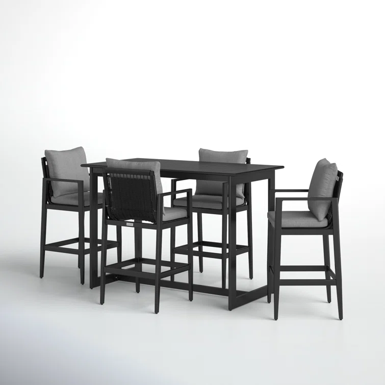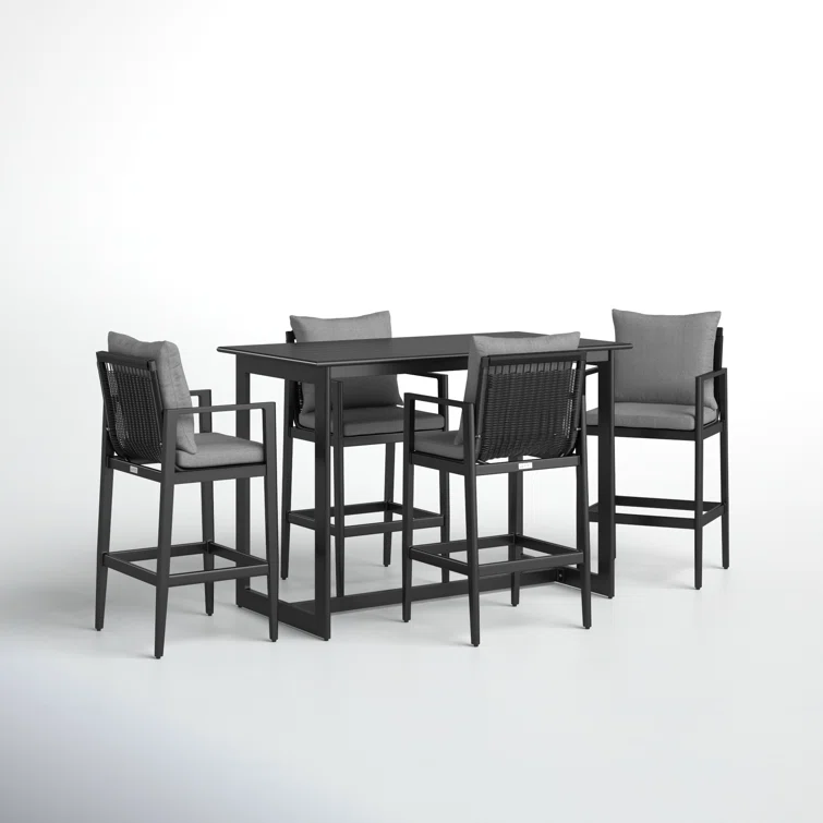Trosclair 5 Piece Outdoor Patio Bar Table Set in Aluminum with Grey Cushions