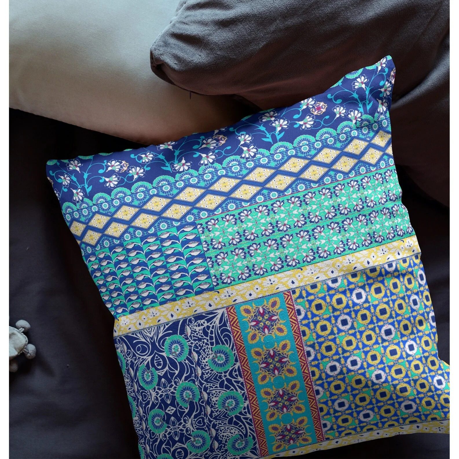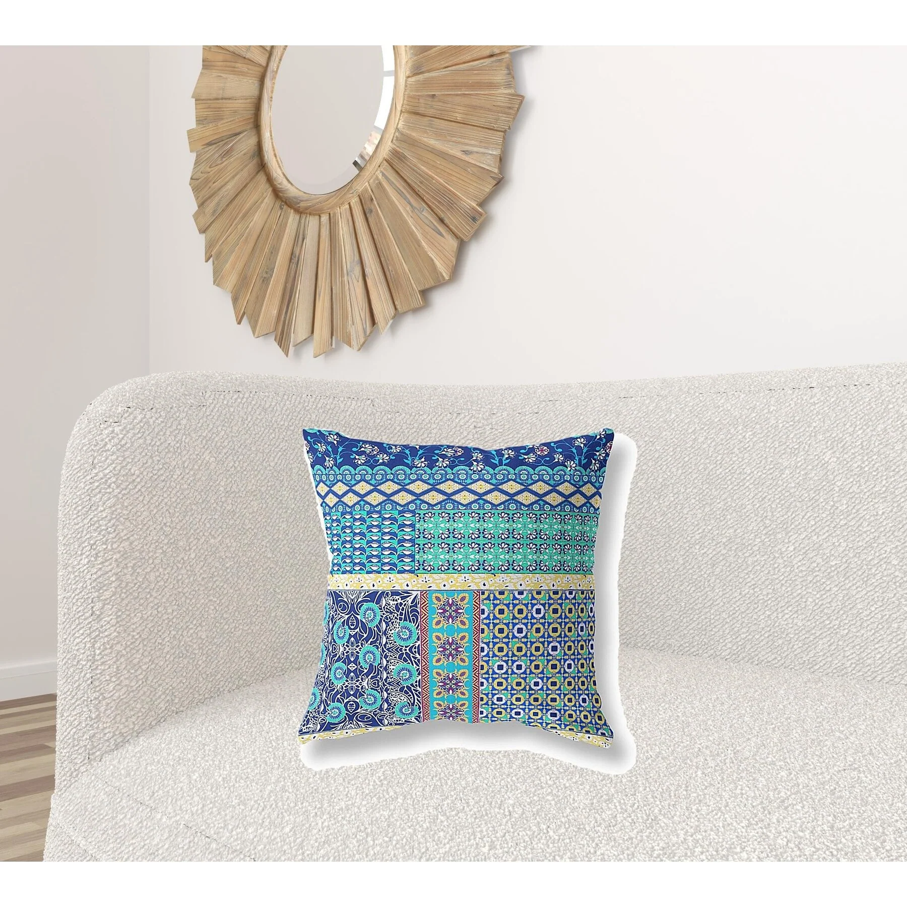 28" Blue Pink Floral Geo Indoor Outdoor Throw Pillow