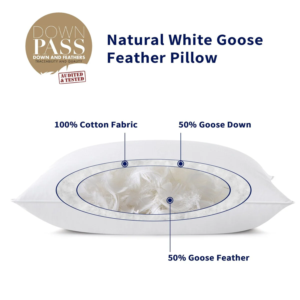 Set of 2 Goose Down Feather Oval Gusset Bed Pillows with 100% Cotton Cover - White