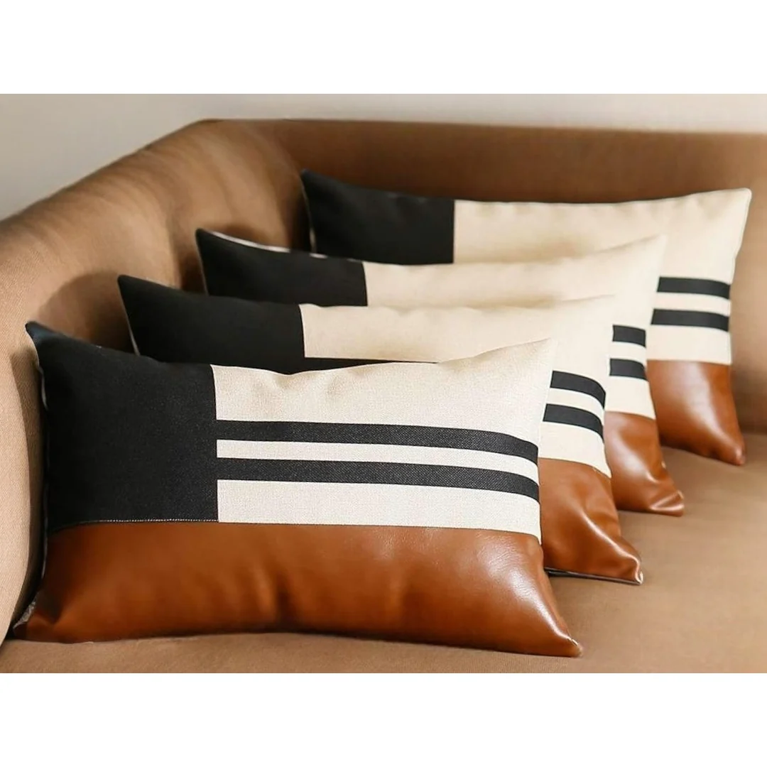 Set of Four 12" X 20" Brown Black and Ivory Striped Fabric and Faux Leather Lumbar Throw Pillows