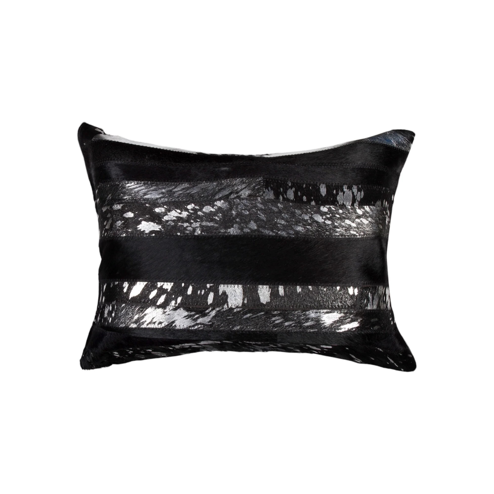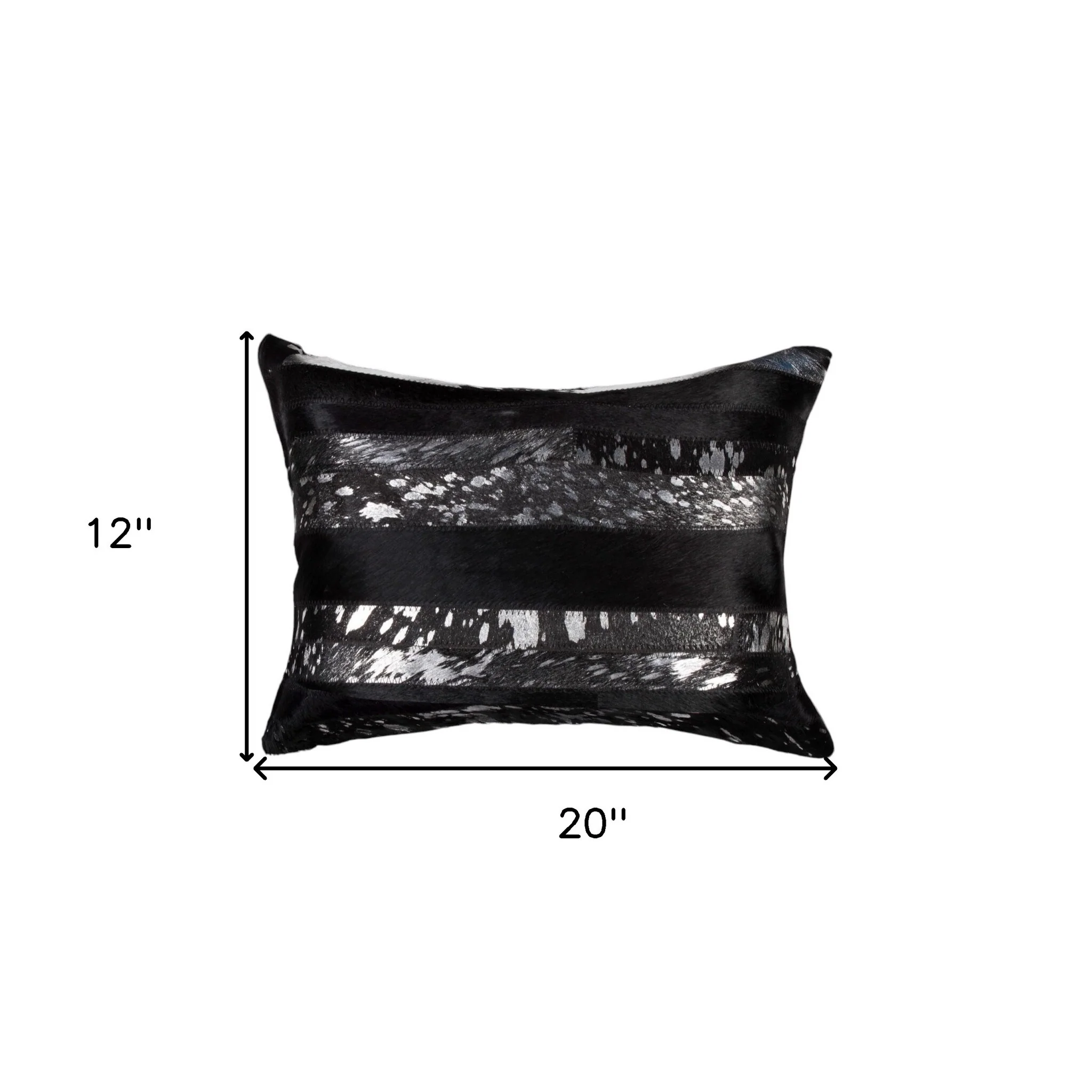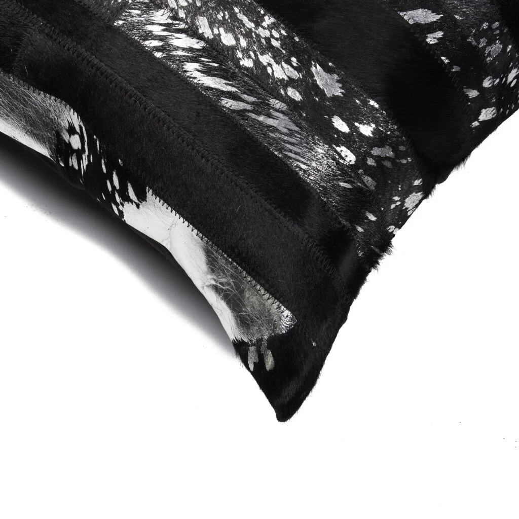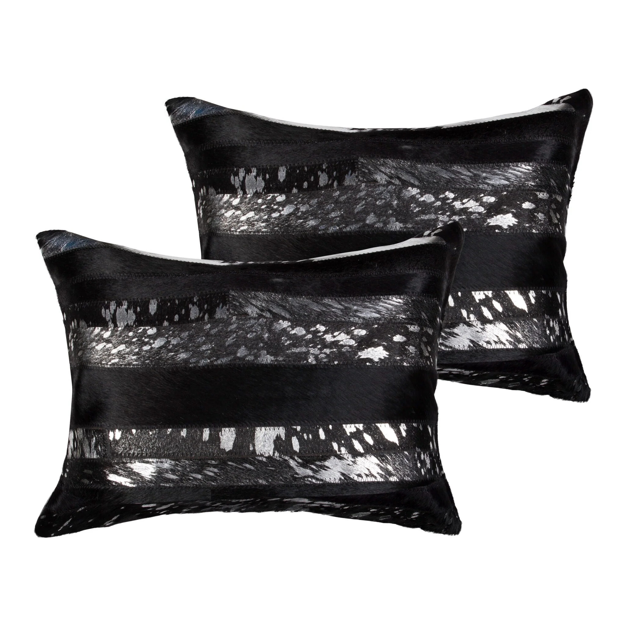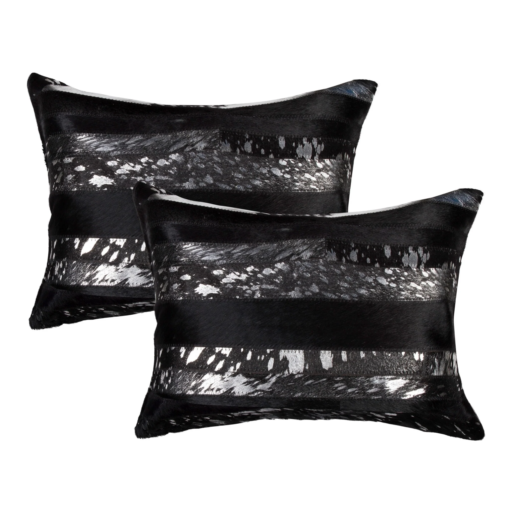 Set of Two 12" X 20" Black and Silver Striped Cowhide Lumbar Throw Pillows with Glitter