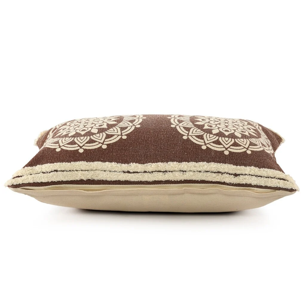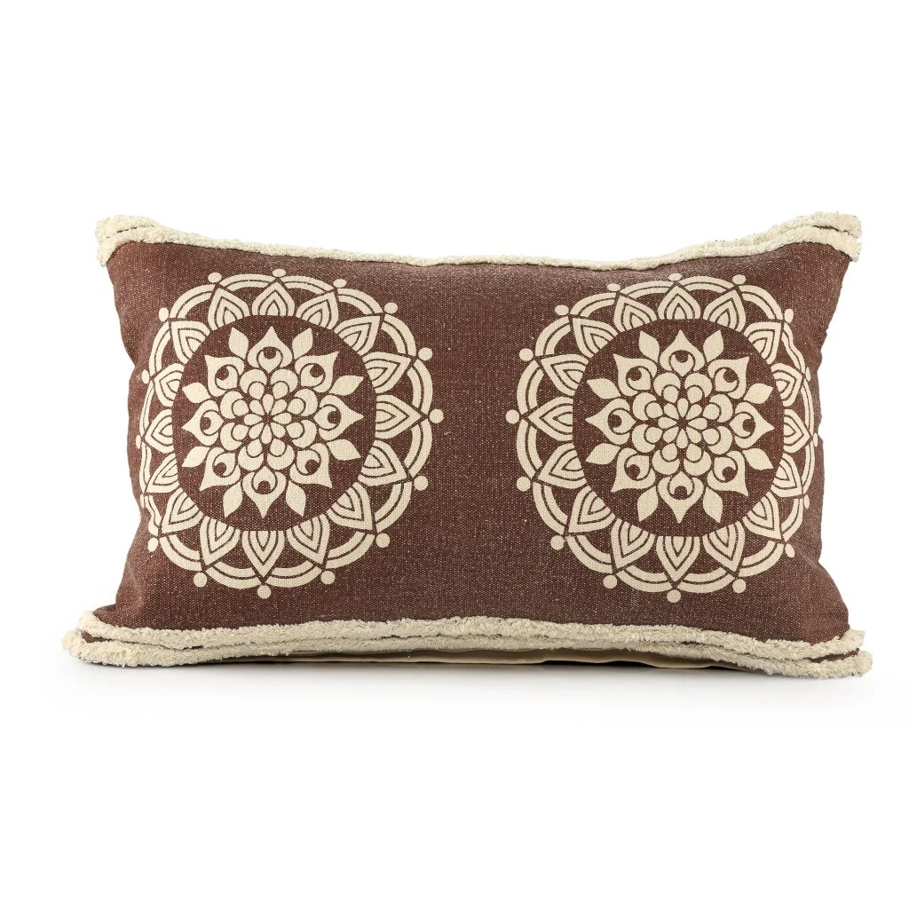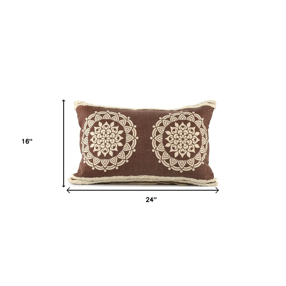 HomeRoots 16" X 24" Brown and Ivory Medallion Cotton Lumbar Throw Pillow With Texture