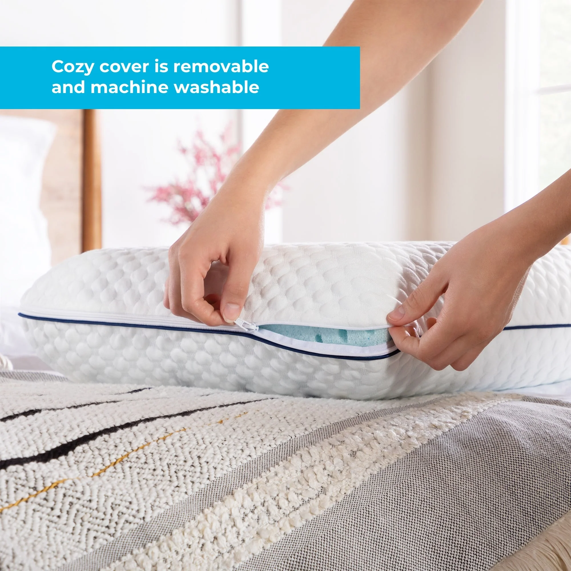Bamboo Memory Foam Pillow with Removable Cover - White/Green Accents