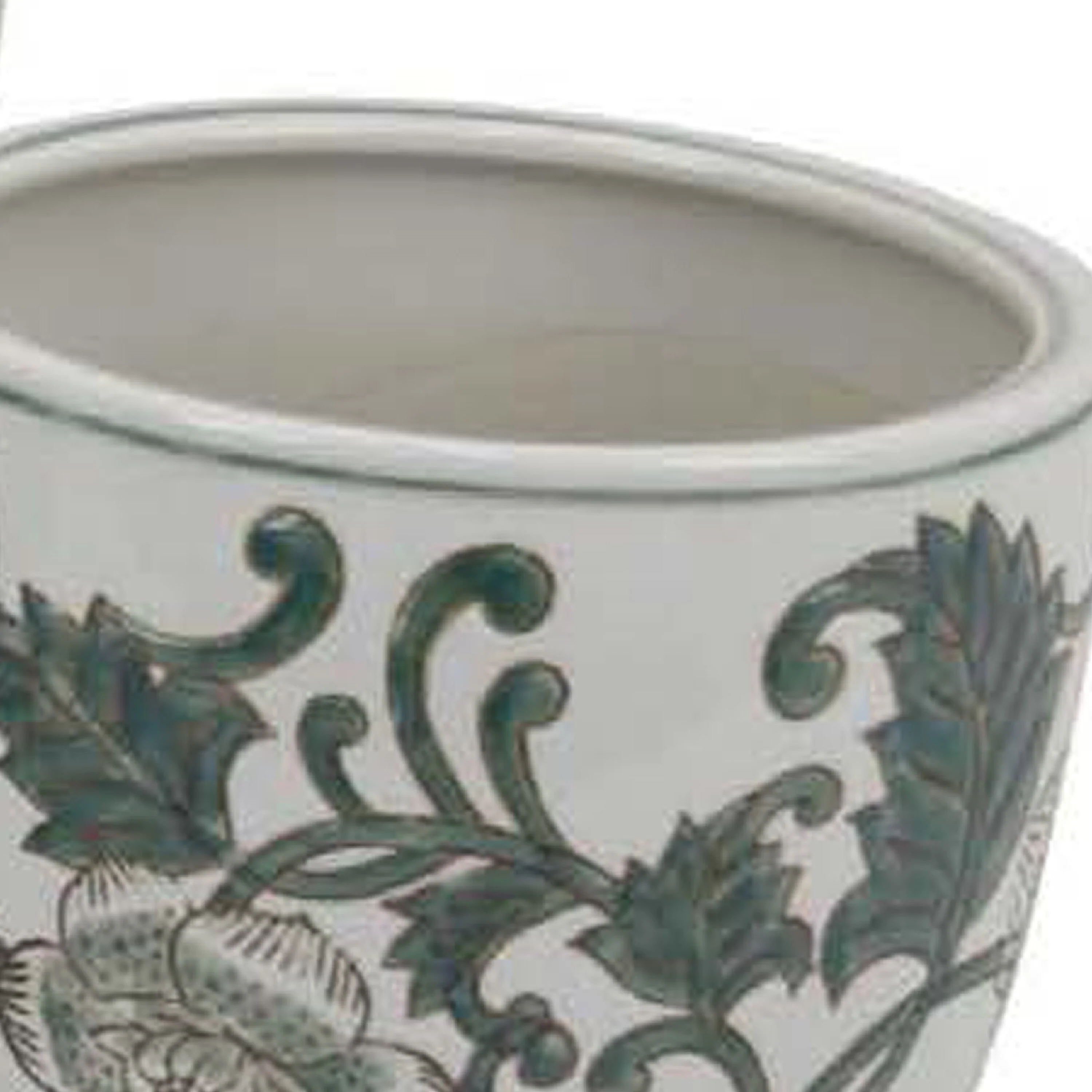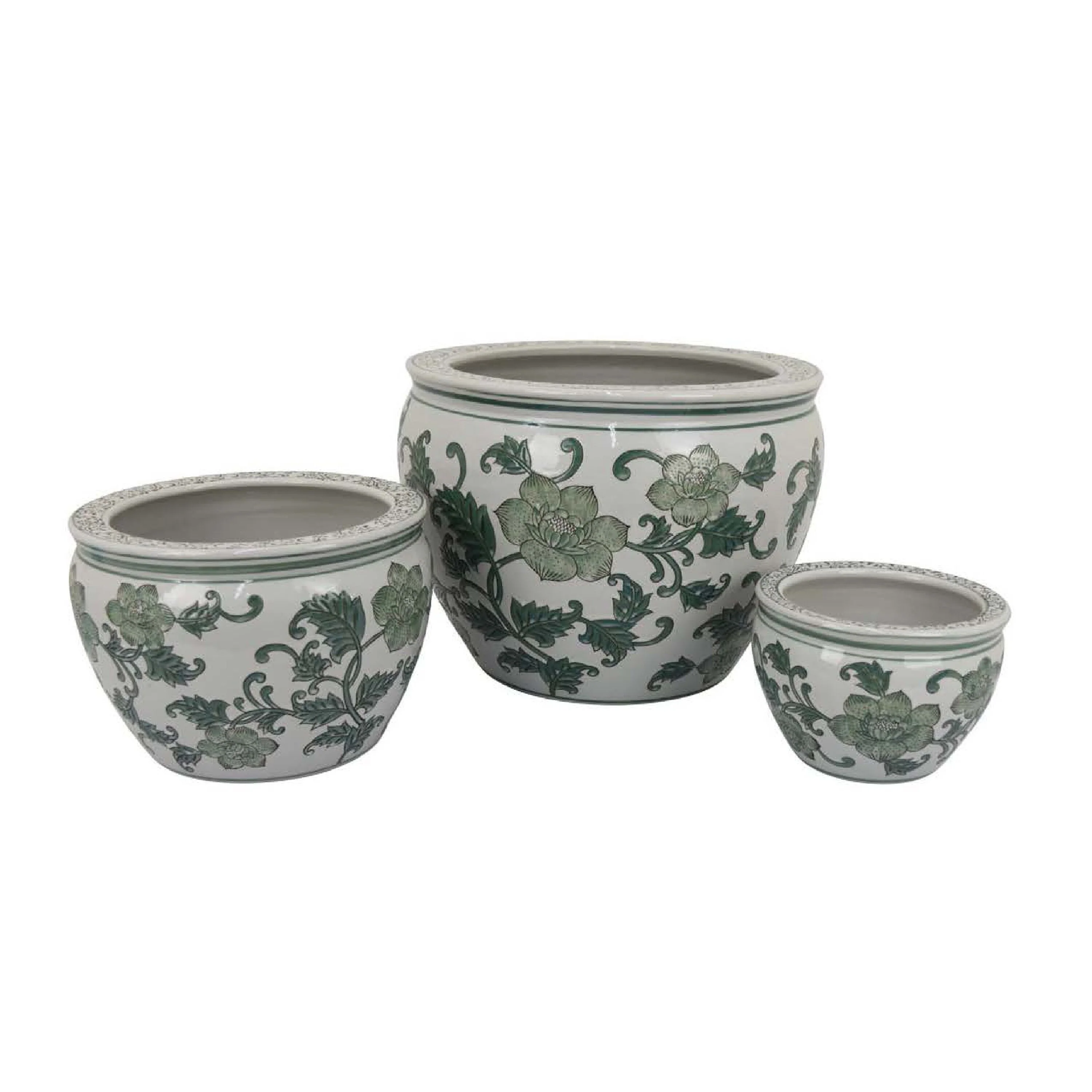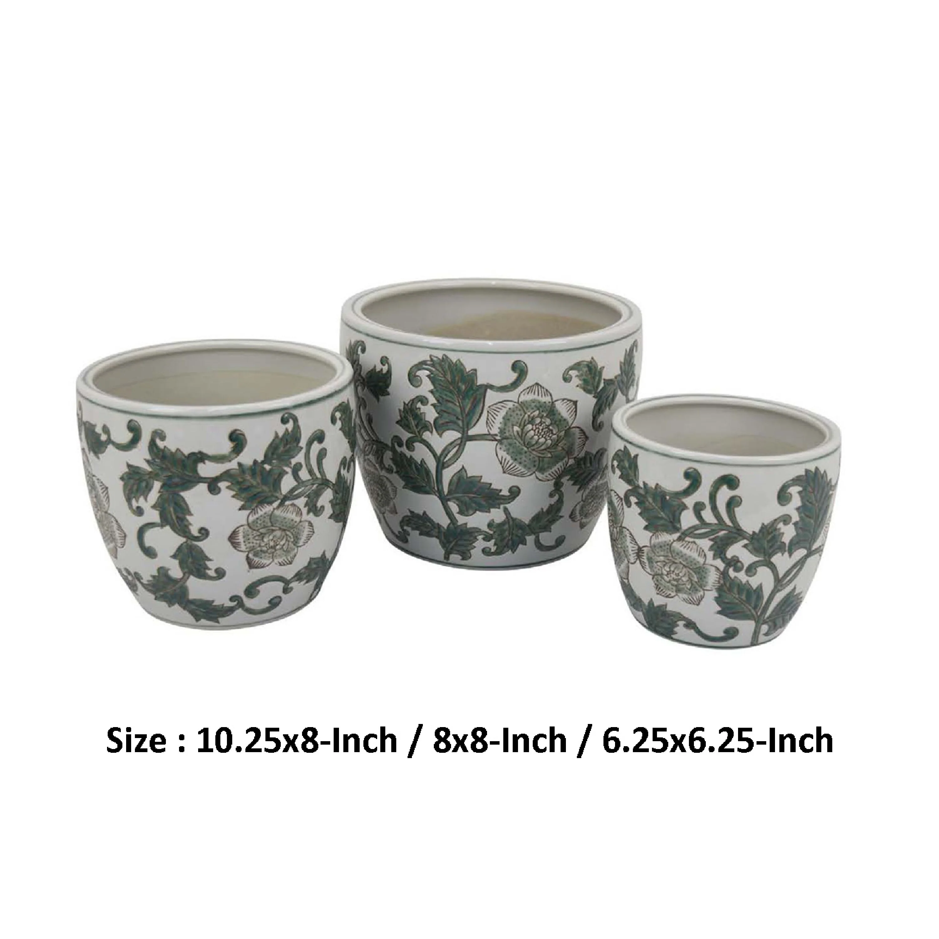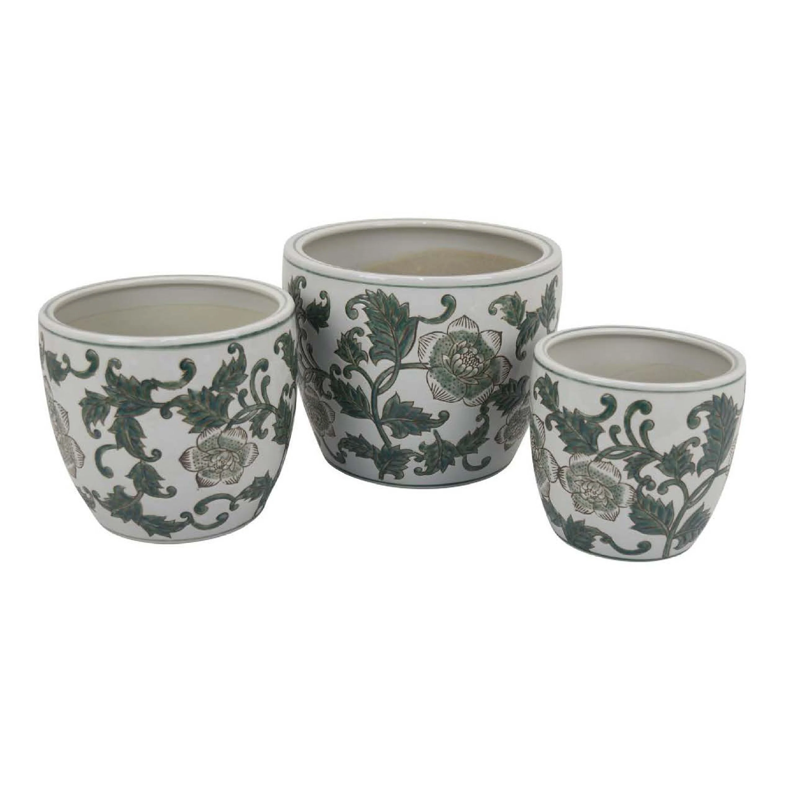 Hely 3 Planter Set, Green White Floral Glazed Ceramic 16, 12, 8 Inch