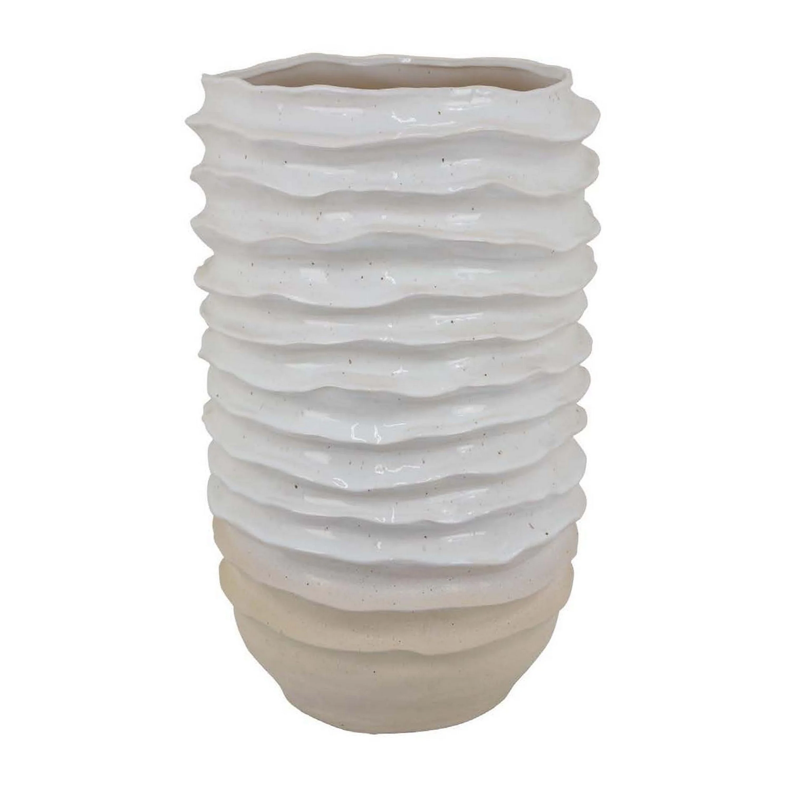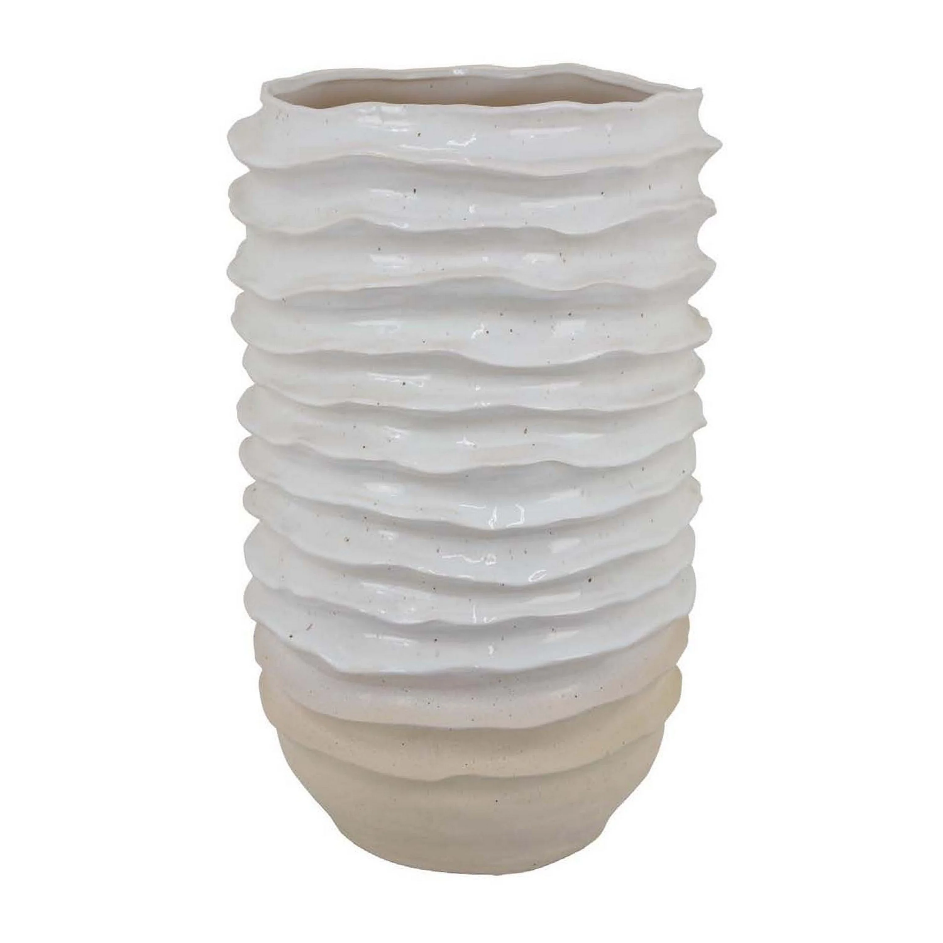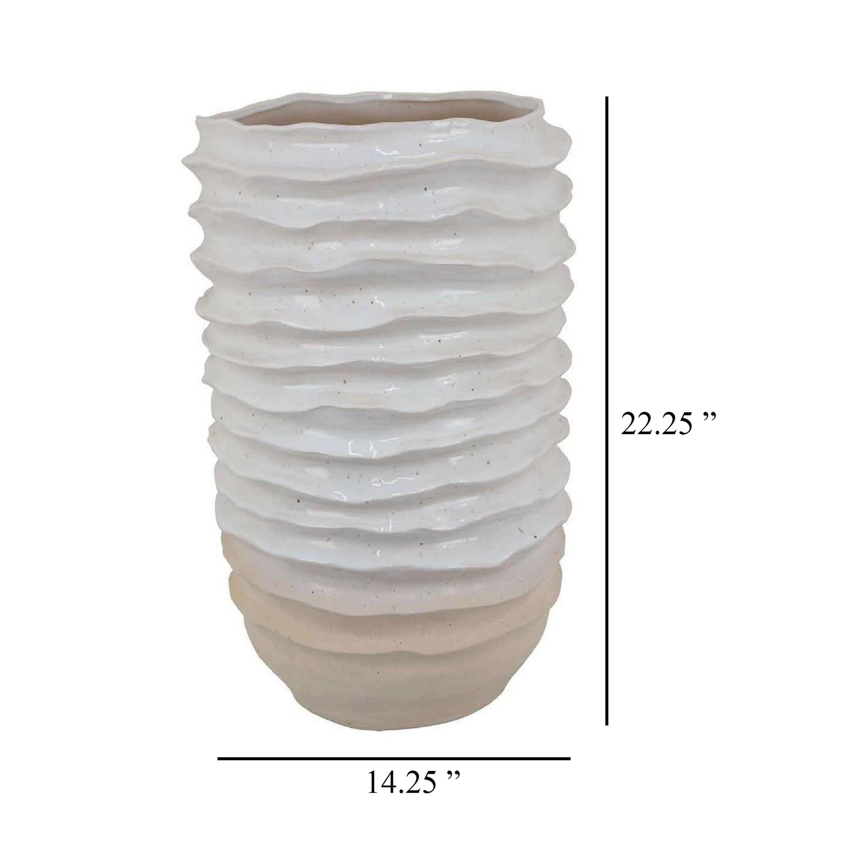 Lezlee Accent Planter, Beige Terracotta, Ridged Textured Urn, 13 Inch