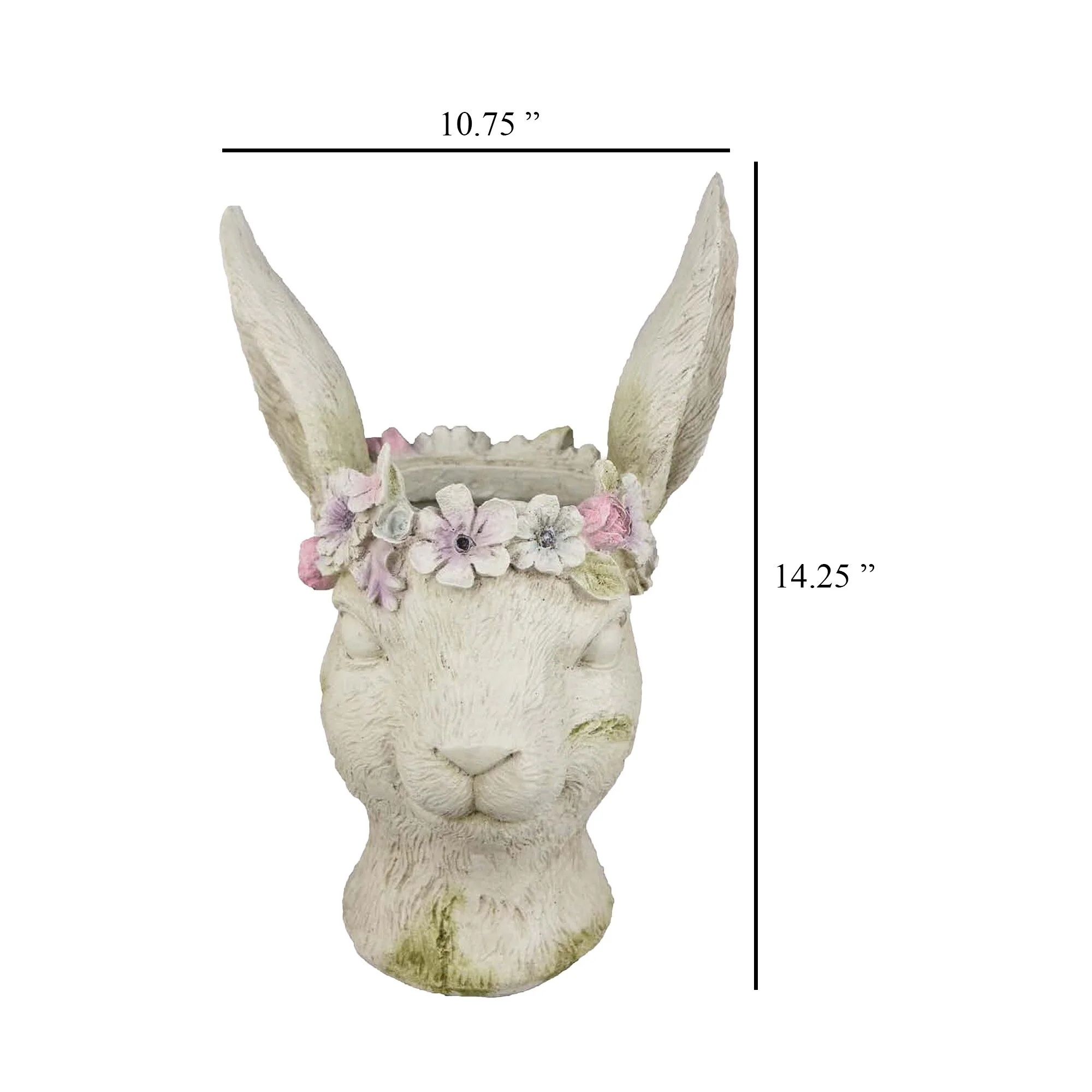 Accent Planter Statuette, 14 Inch Rabbit w Floral Accents, White Resin