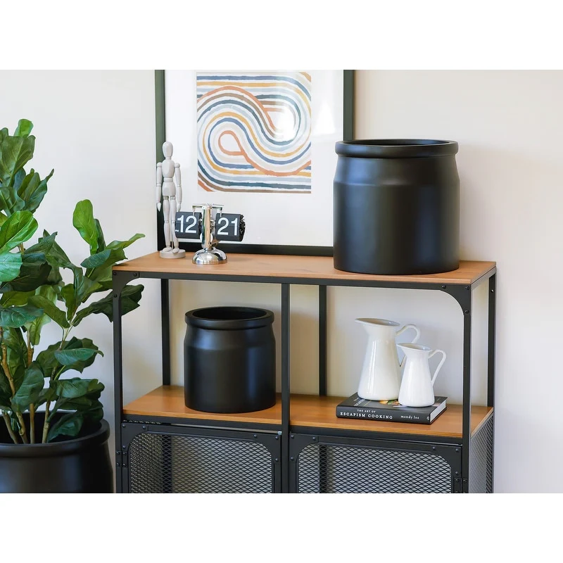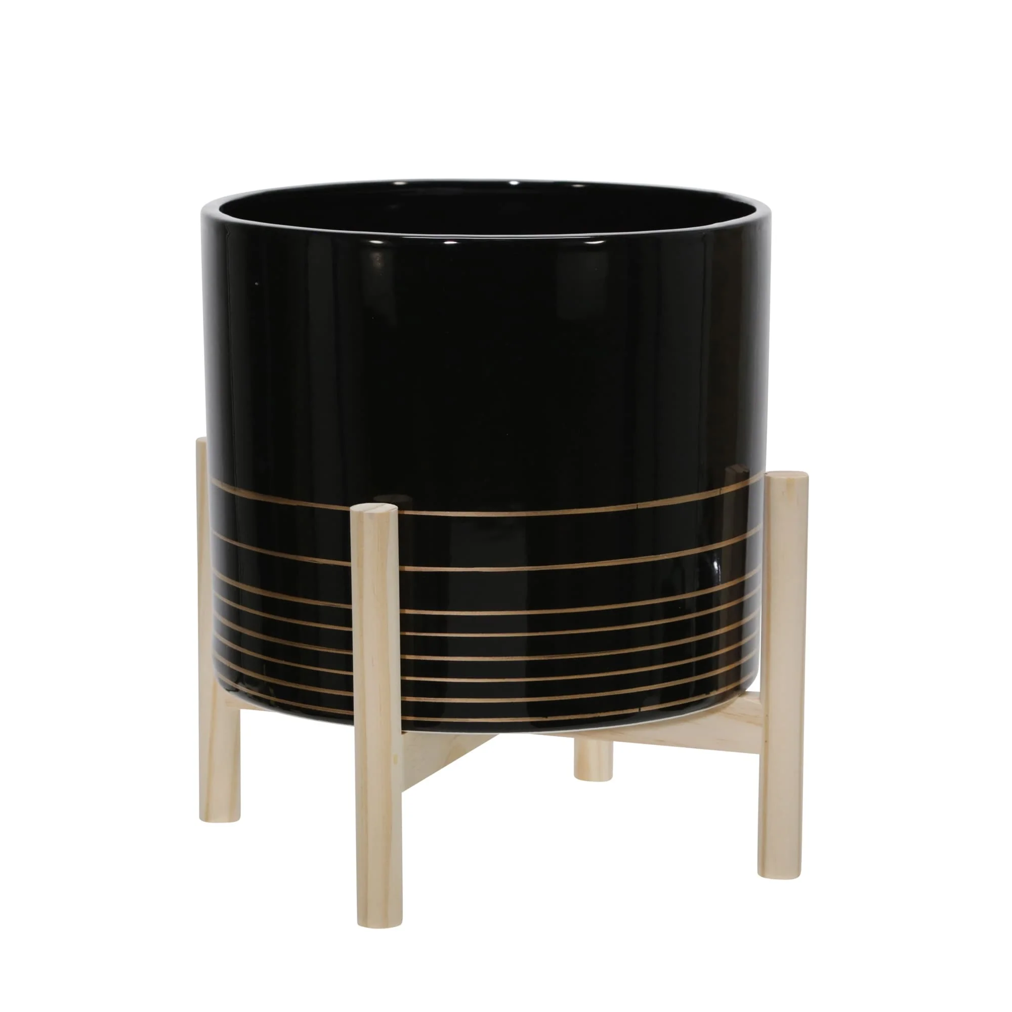 Black with Gold Striping Ceramic Planter with Wood Stand - 10.0" x 10.0" x 12.0"