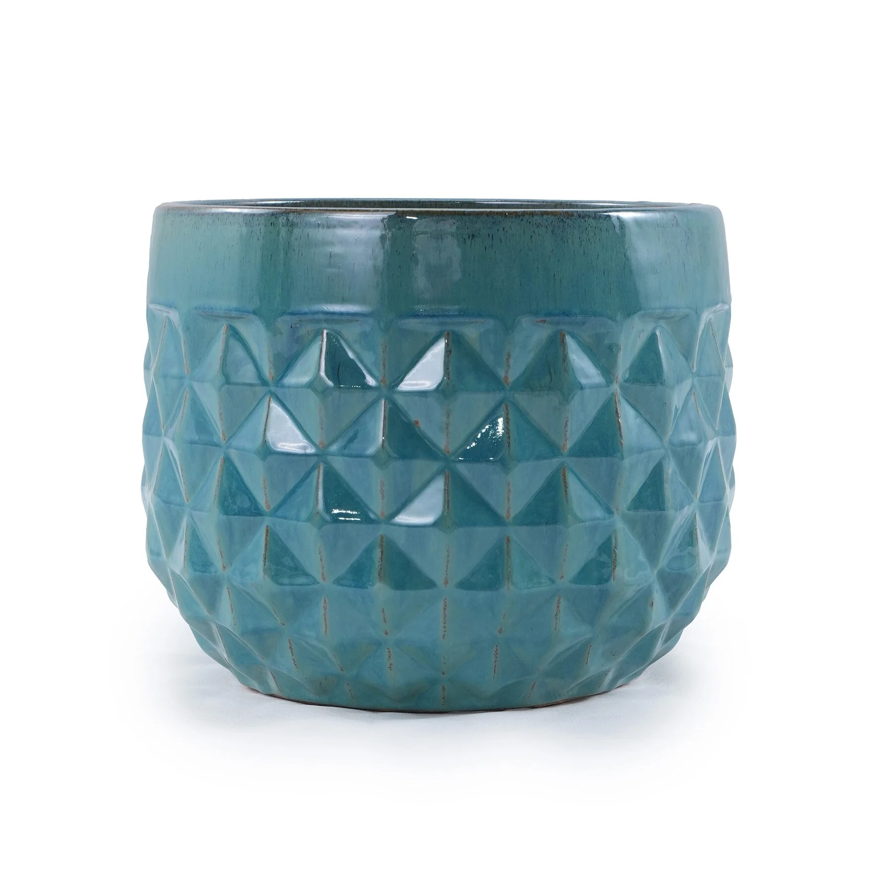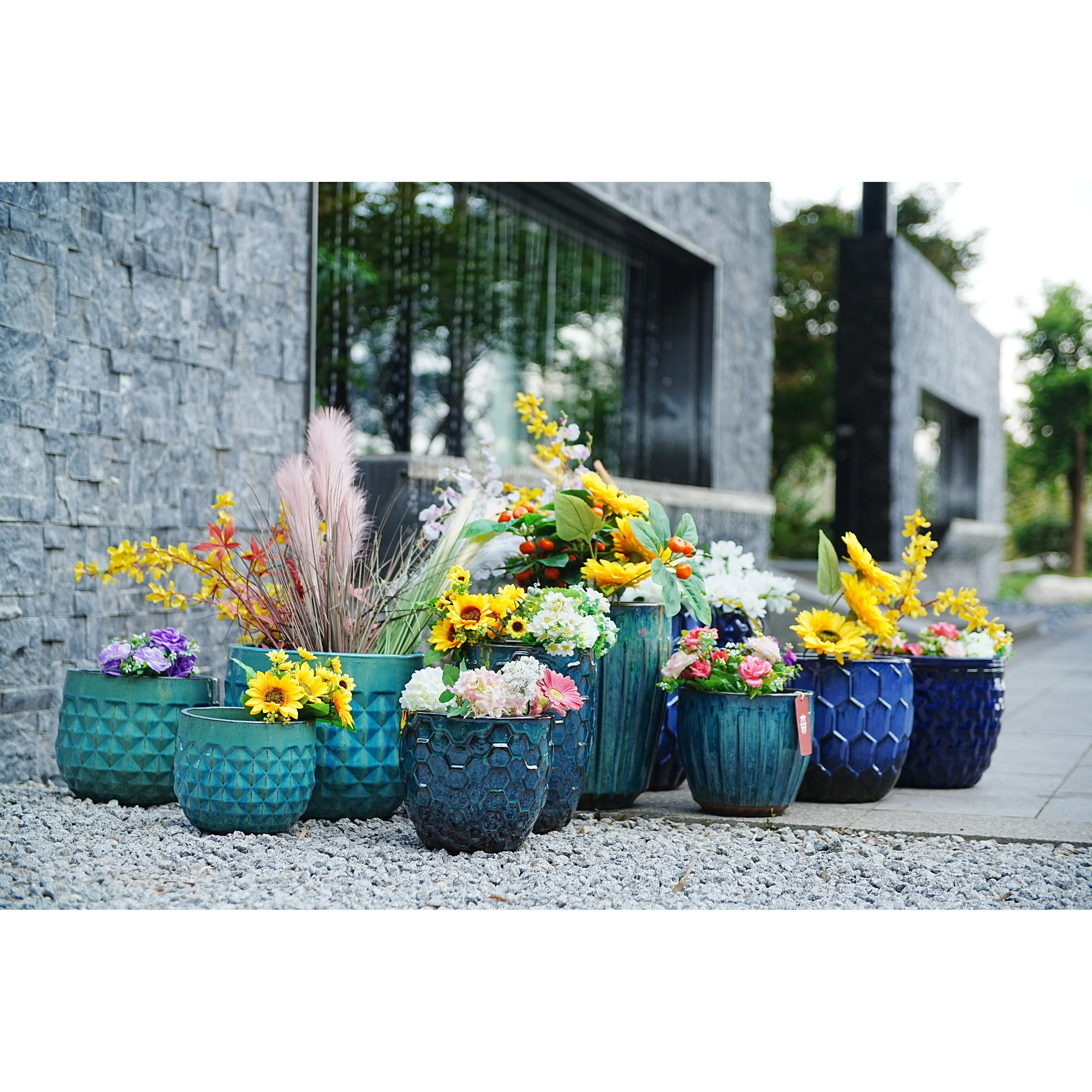 Blue Gloss Striped Ceramic Planter Set of 3 - 14 Inch Square Modern Outdoor Pots with Drainage Hole