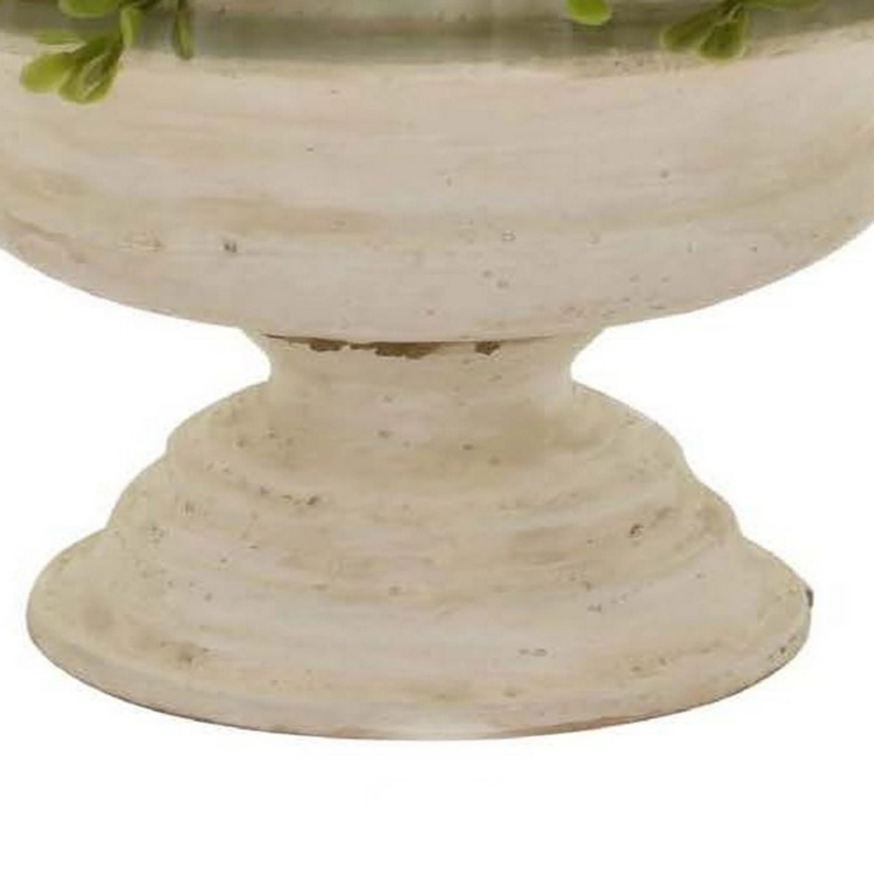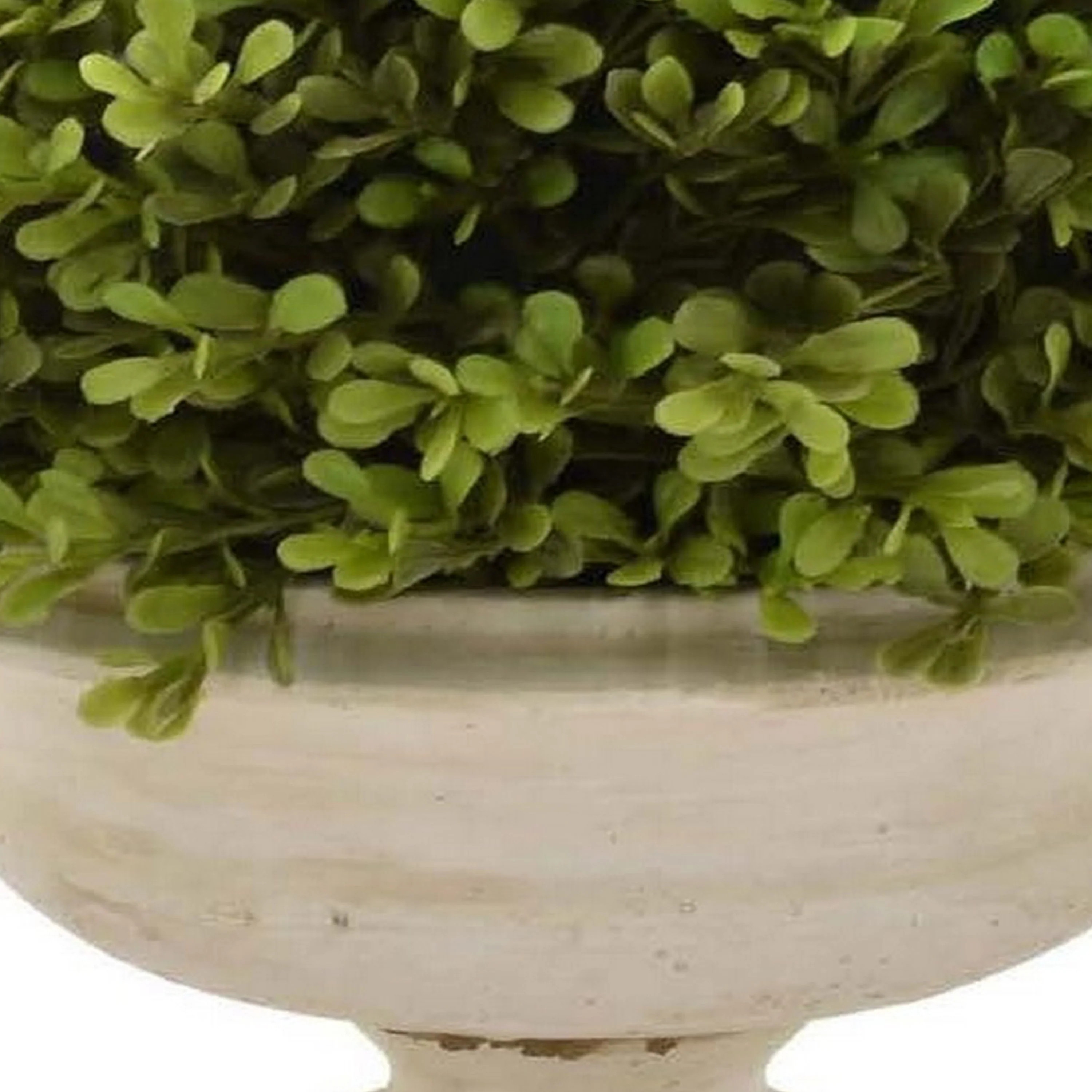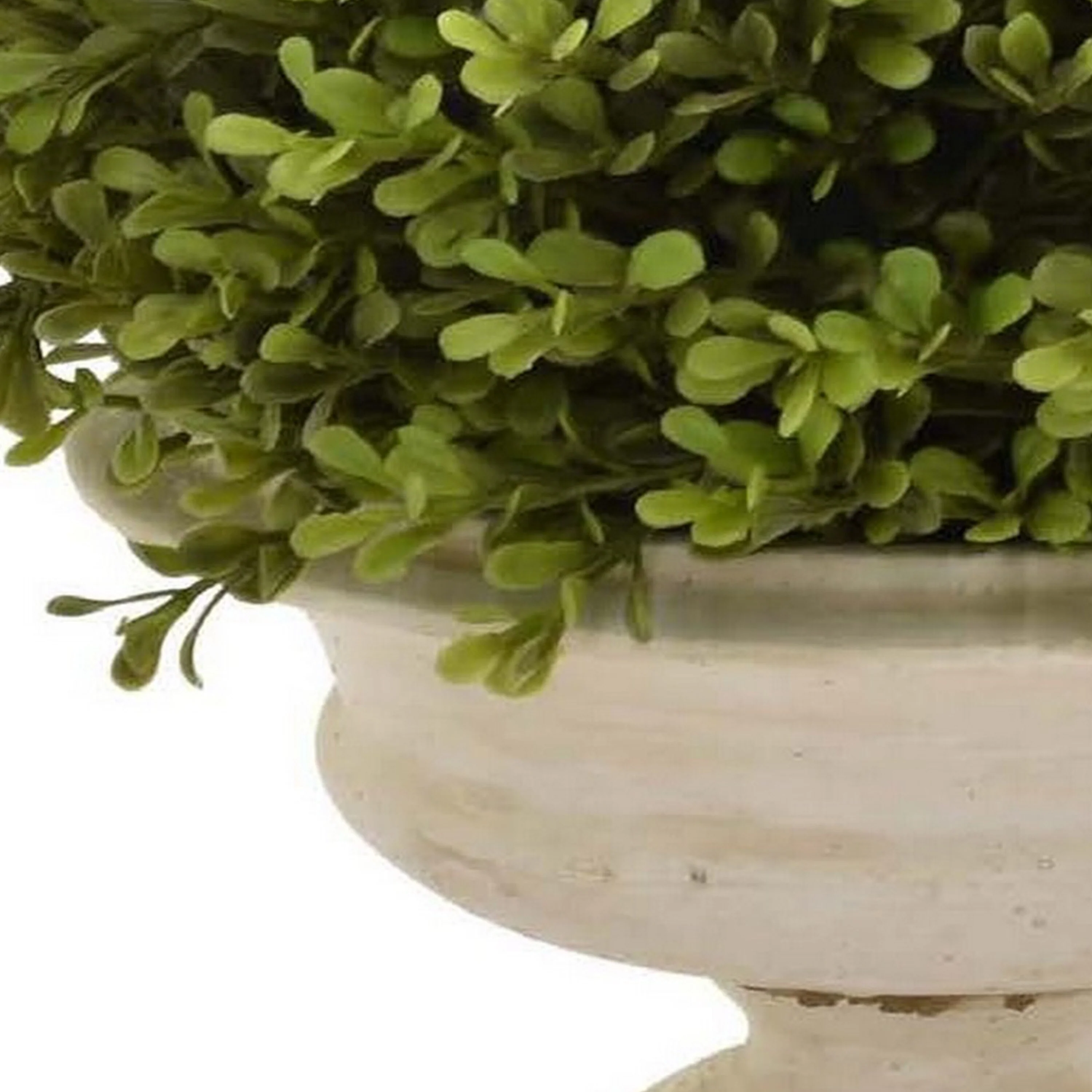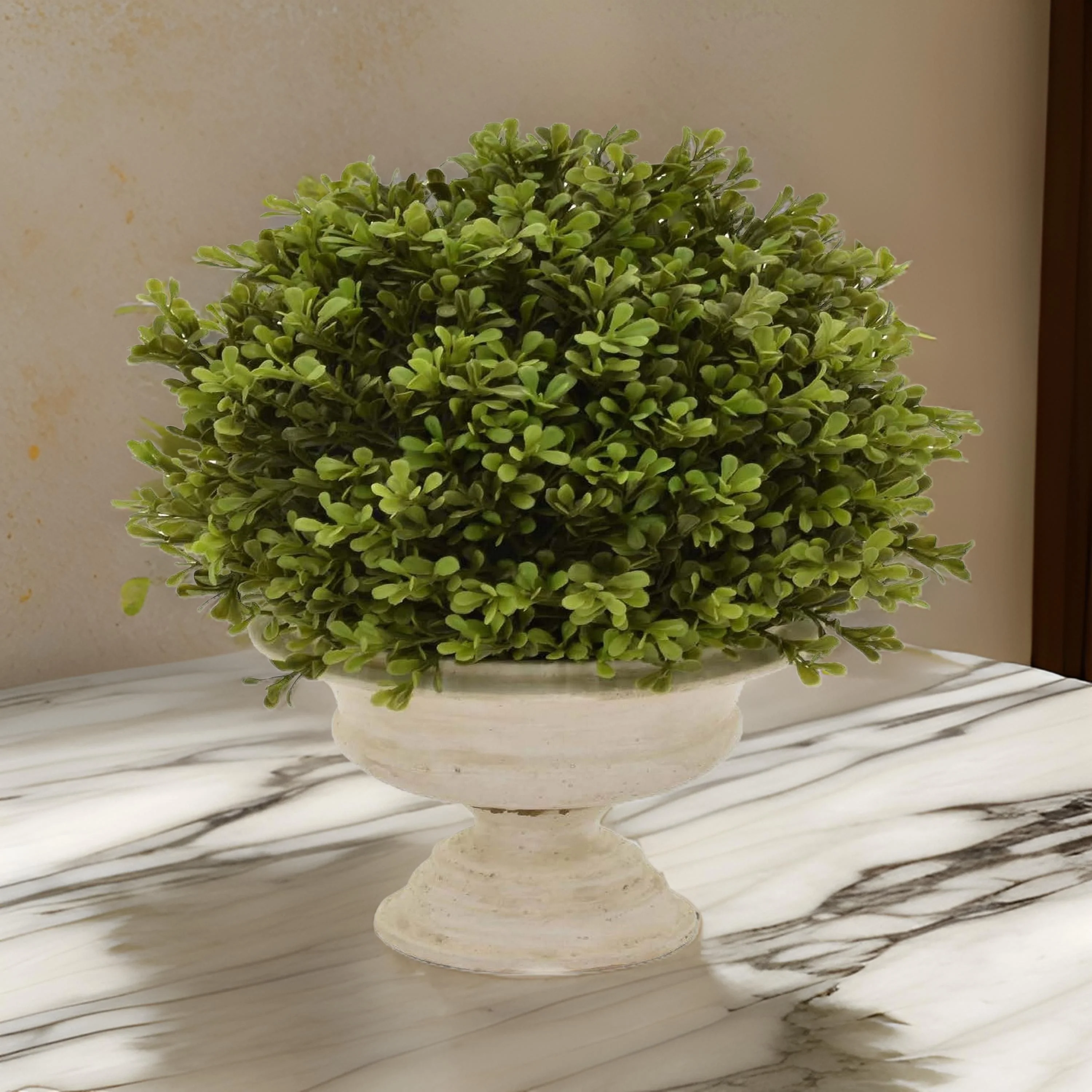 15 Inch Faux Boxwood Topiary Plant in Urn Pedestal Pot, Off White Planter