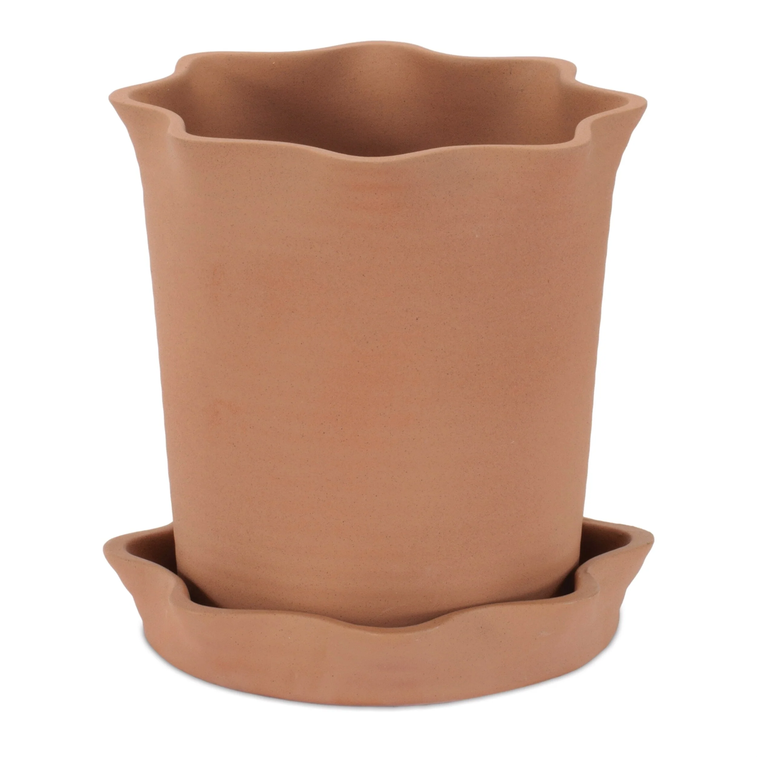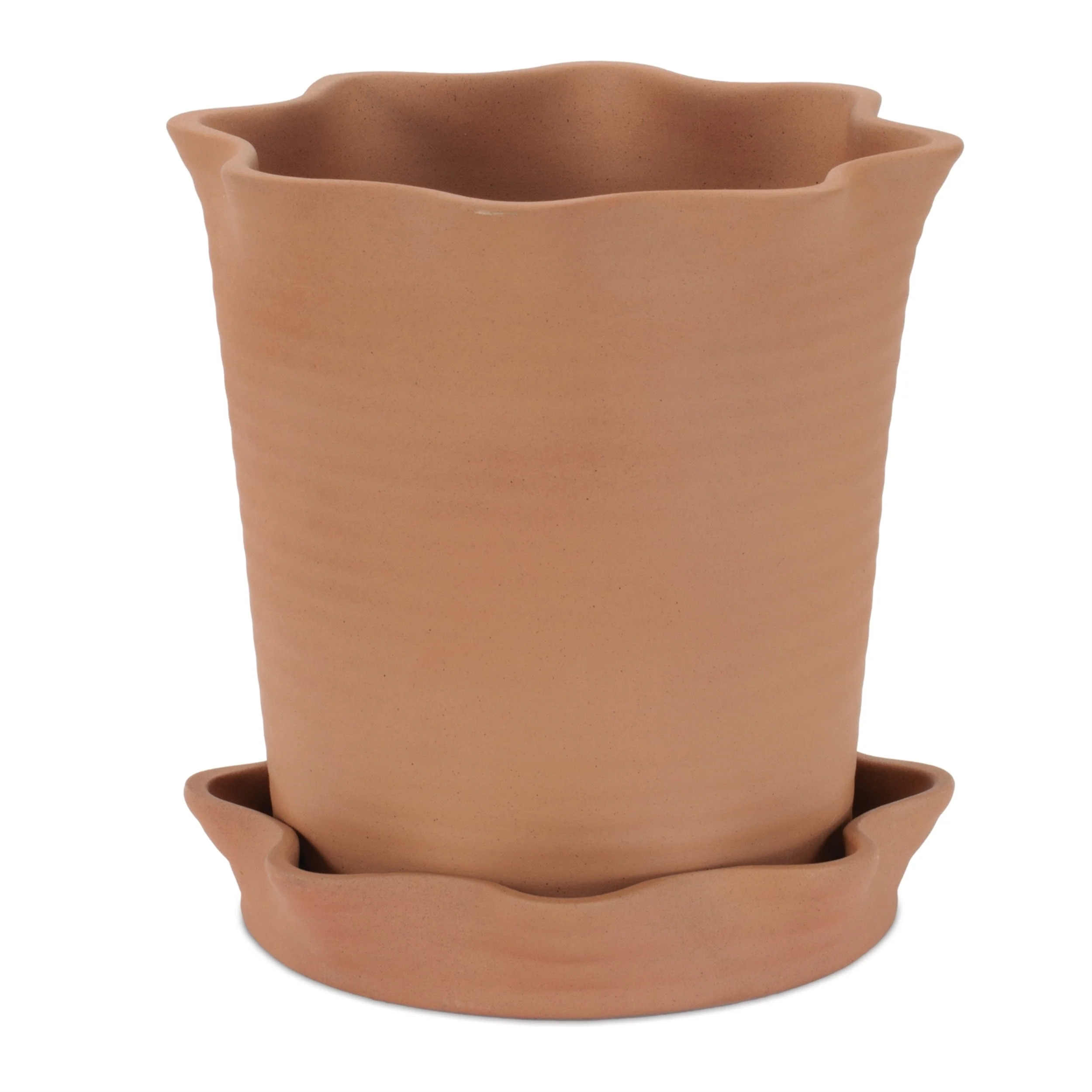 Brown Ceramic Stoneware Wavy Planter with Saucer in Terra Cotta Finish